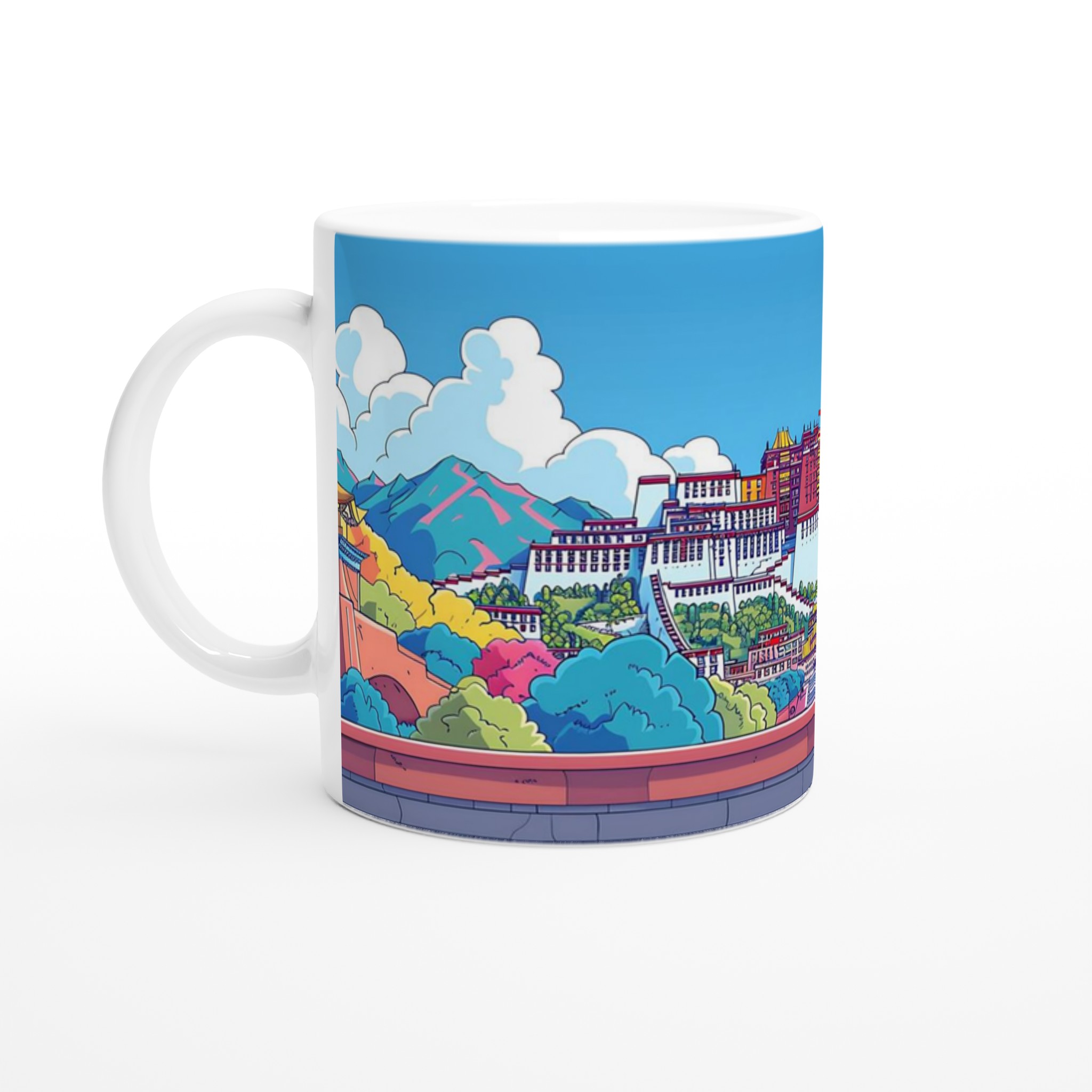 Inspirerad av fantastiska landskap och arkitektur, fångar denna unika mugg en livlig, tecknad stadsbild från Fjärran Östern, komplett med majestätiska berg, grönskande träd och traditionella byggnader under en klarblå himmel. Den blanka vita ytan ger ett skarpt och levande tryck som verkligen sticker ut, oavsett om det är en personlig design, ett roligt citat eller en present till någon du tycker om.