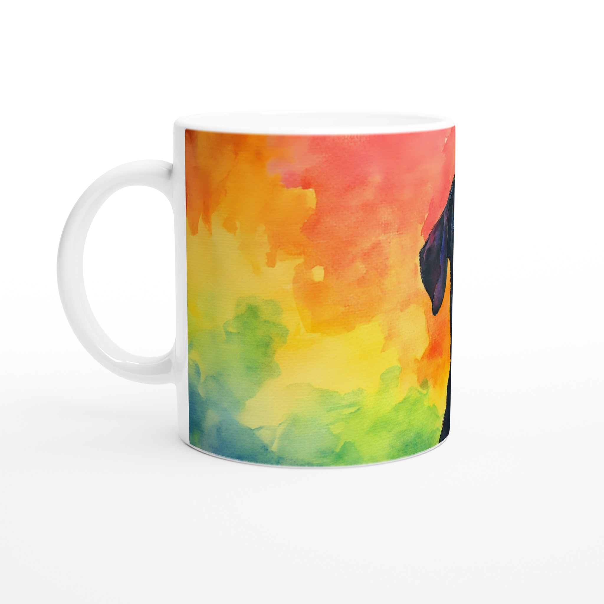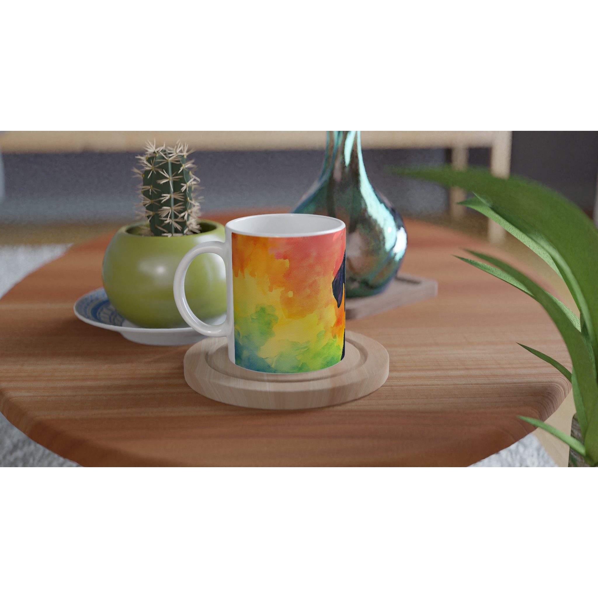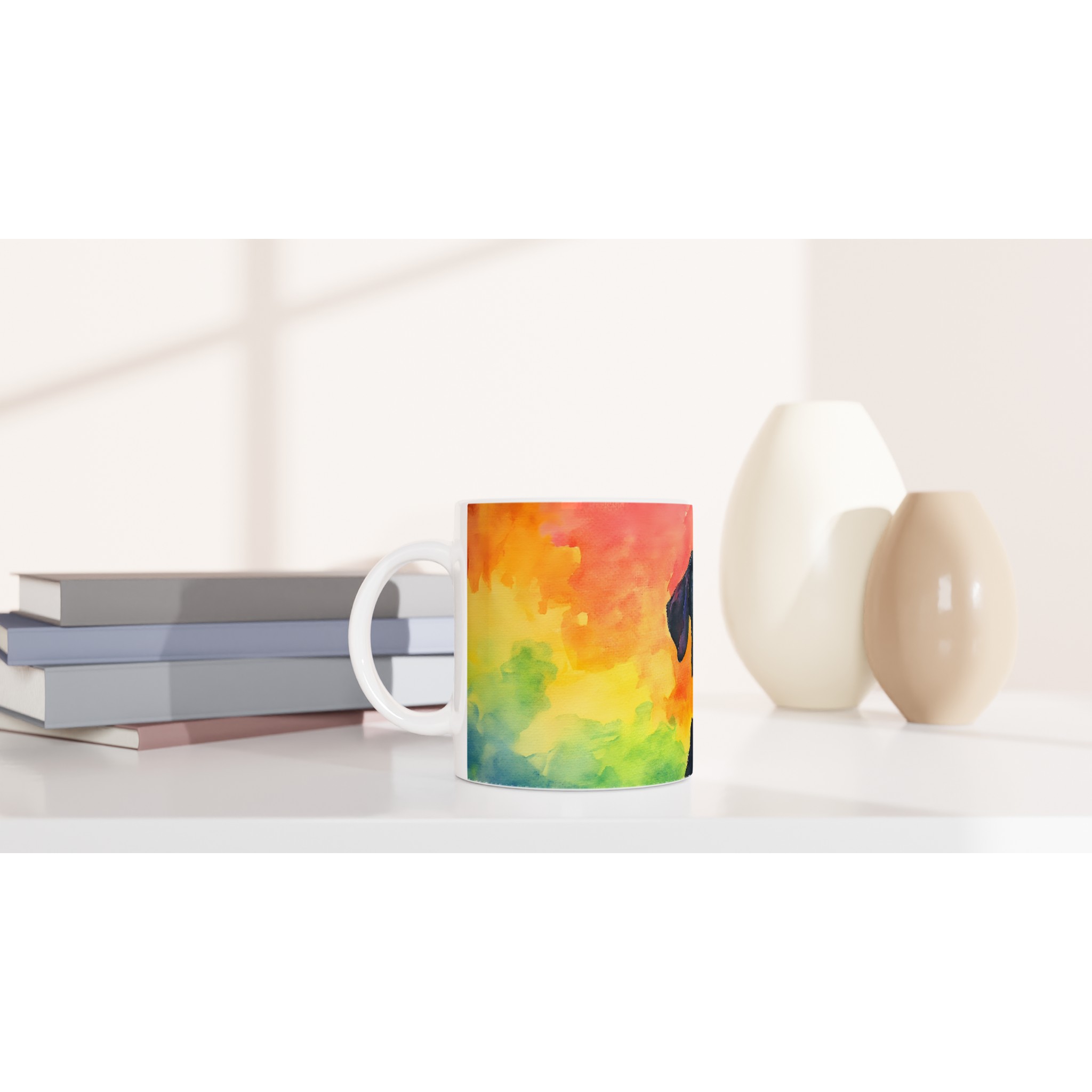 Den blanka vita ytan låter trycket framträda med enastående klarhet och färgstyrka, vilket gör muggen till en riktig favorit. Du kan lita på att trycket behåller sin lyster även efter otaliga omgångar i både mikrovågsugn och diskmaskin, tack vare den höga kvaliteten. Muggen rymmer 11 oz (ca 3,25 dl), en idealisk storlek för både jobb och hemmabruk. Den passar lika bra som en personlig vardagsmugg som en uppskattad present till familj, vänner eller kollegor som delar din passion för hundar och färgstark design.