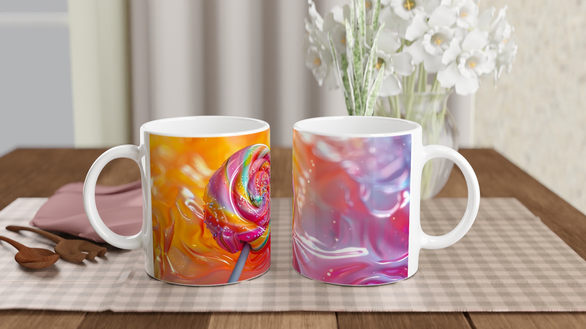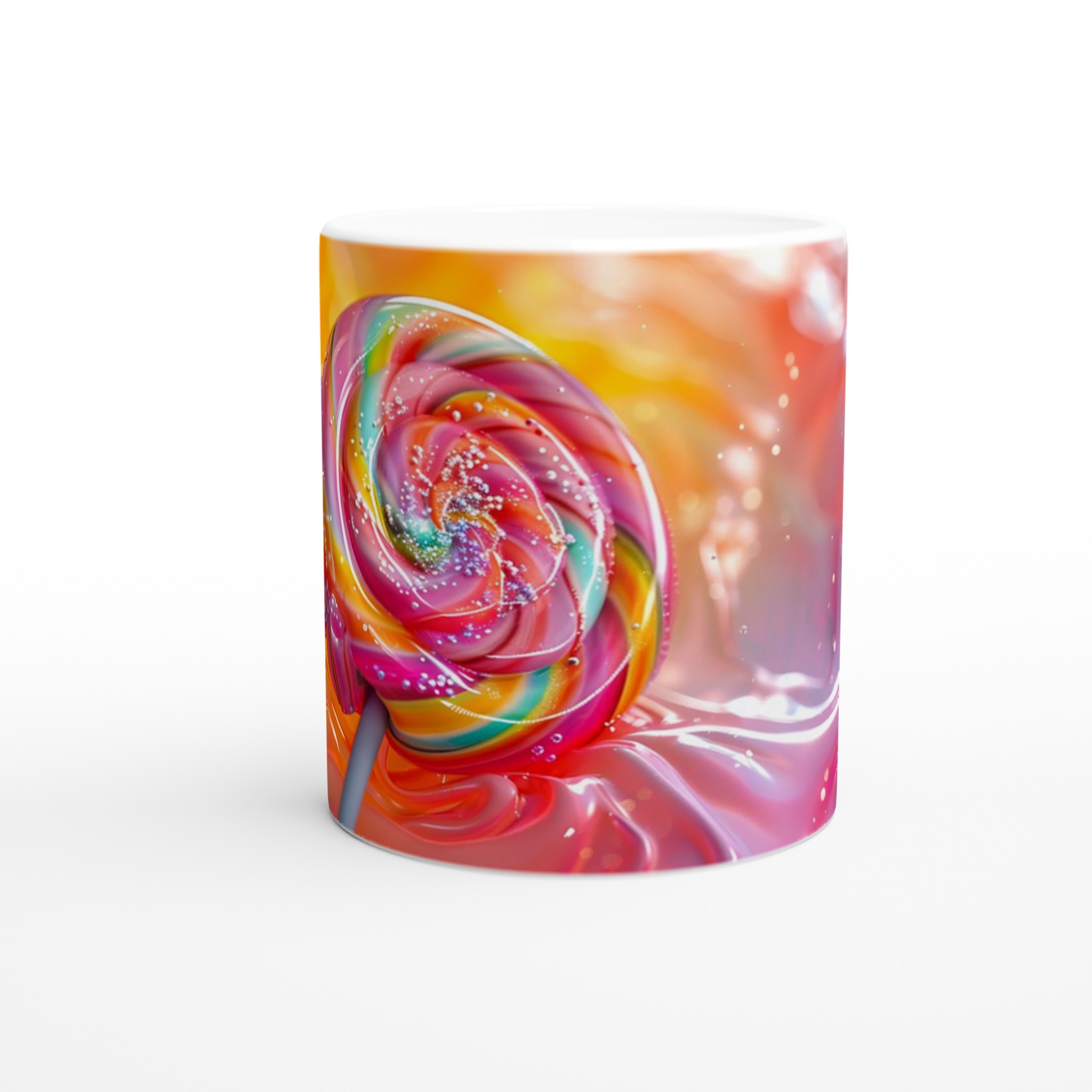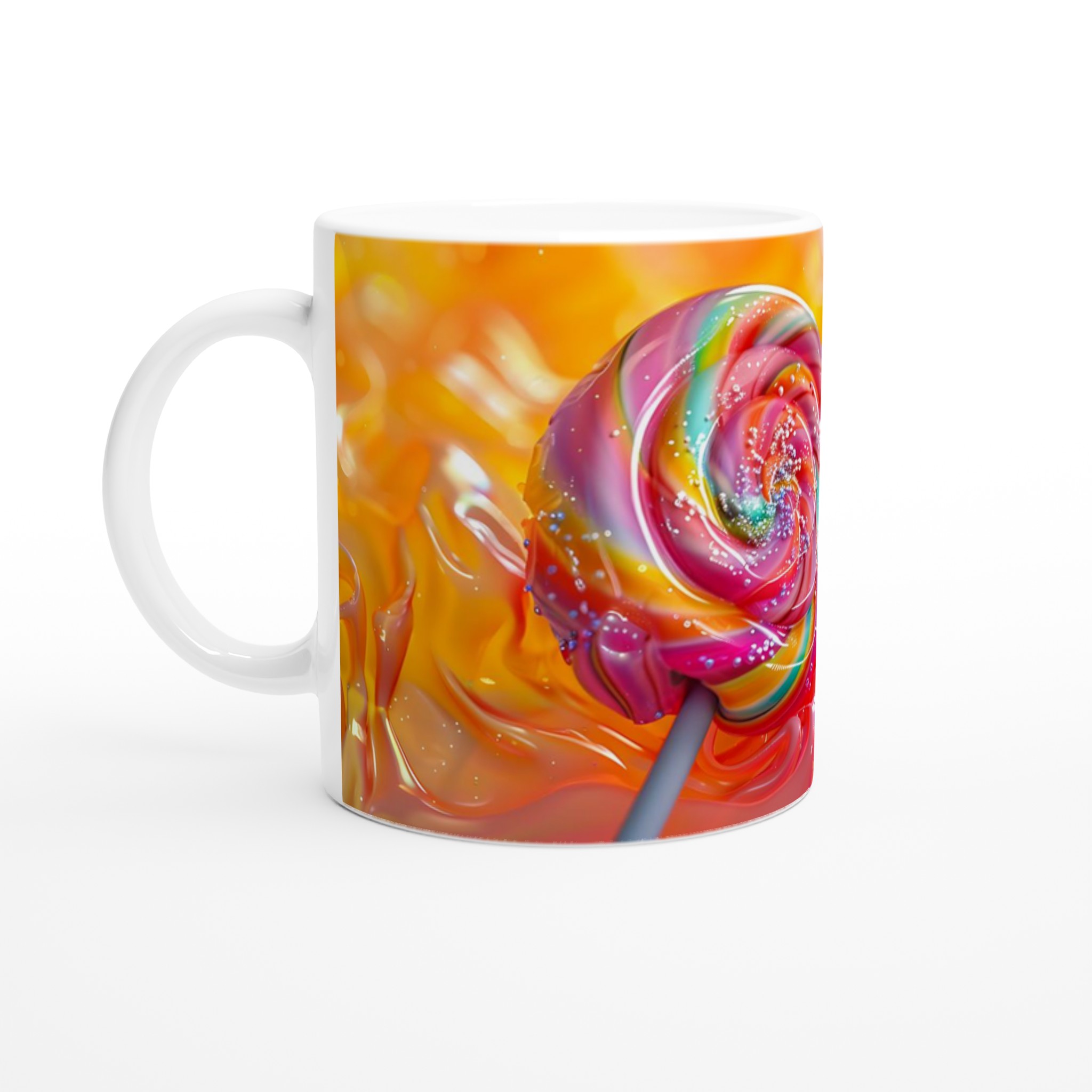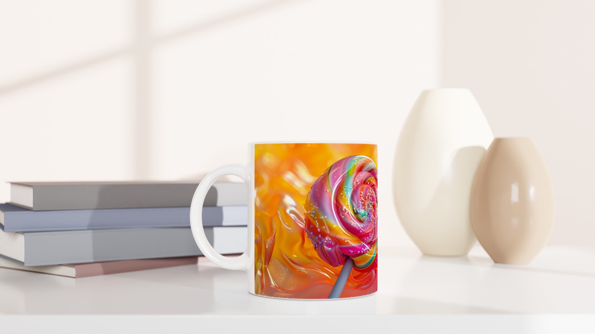 Den här stilrena keramiska muggen blir snabbt en vardagsfavorit. Perfekt för morgonkaffet, kvällens varma choklad eller när du bara vill njuta av en kopp te. Med sitt sprudlande, godisinspirerade tryck av en virvlande lollipop i livliga färger som rosa, gult och turkost, får varje sipp en extra touch av lekfull magi. Den blanka vita ytan gör att trycken framhävs med klara och levande färger, som håller sig fina även efter många turer i mikron och diskmaskinen.
