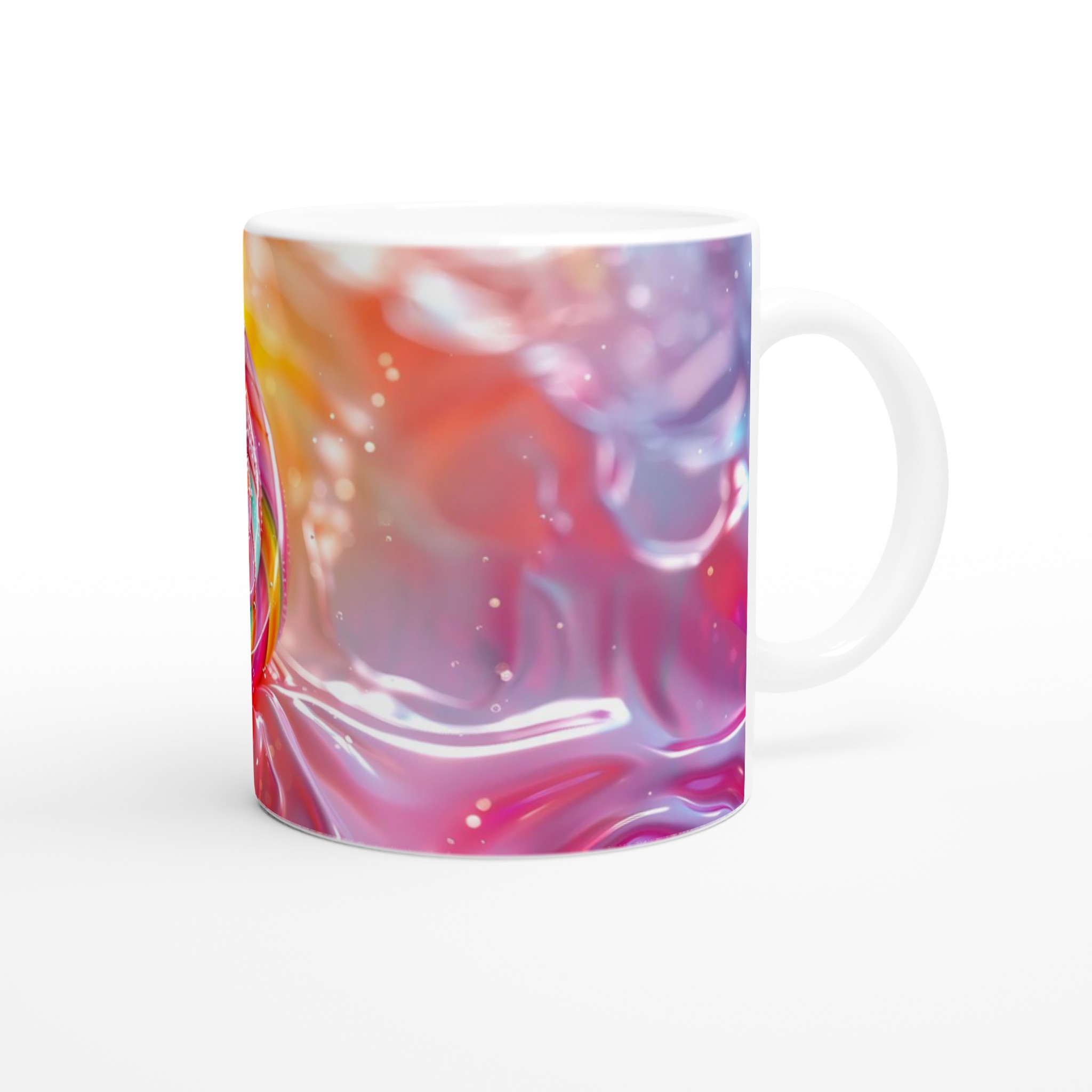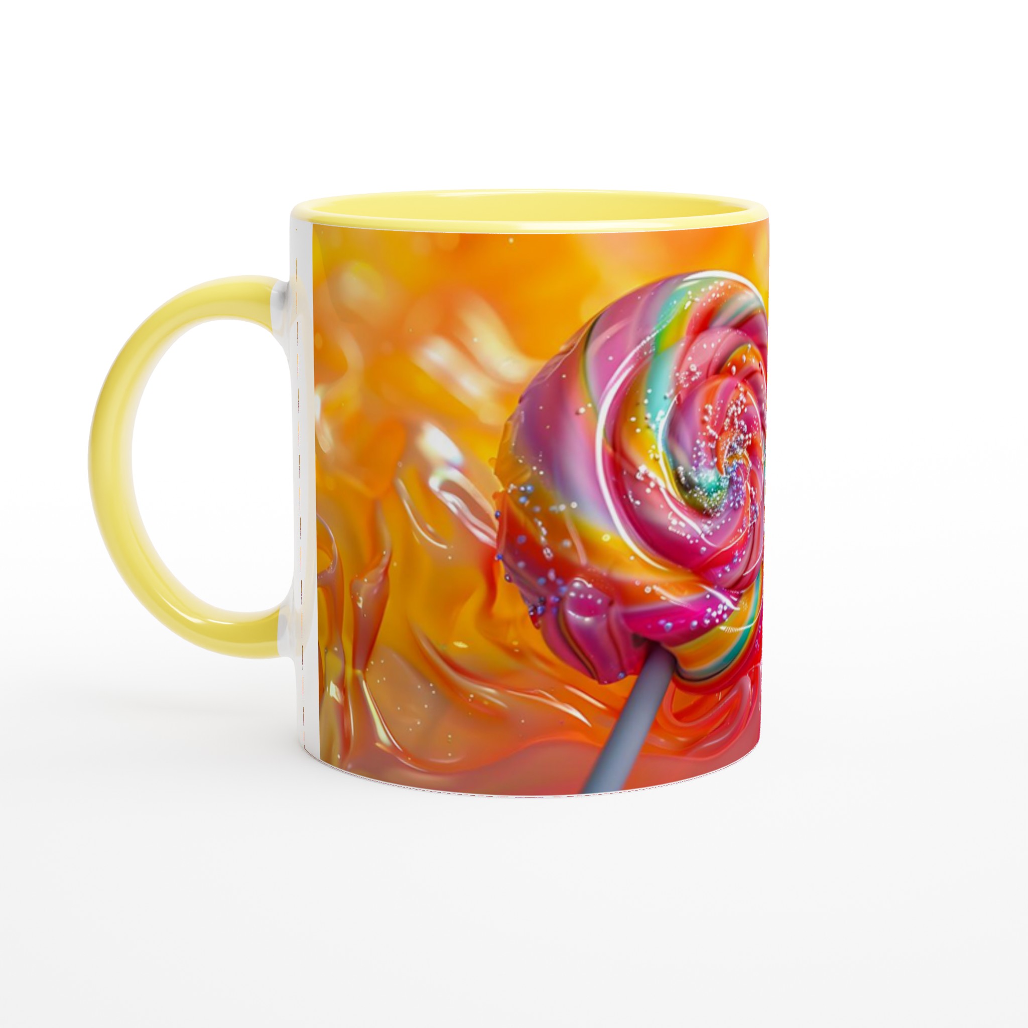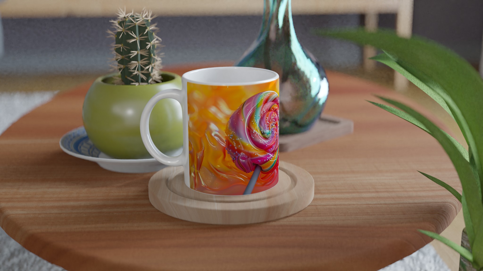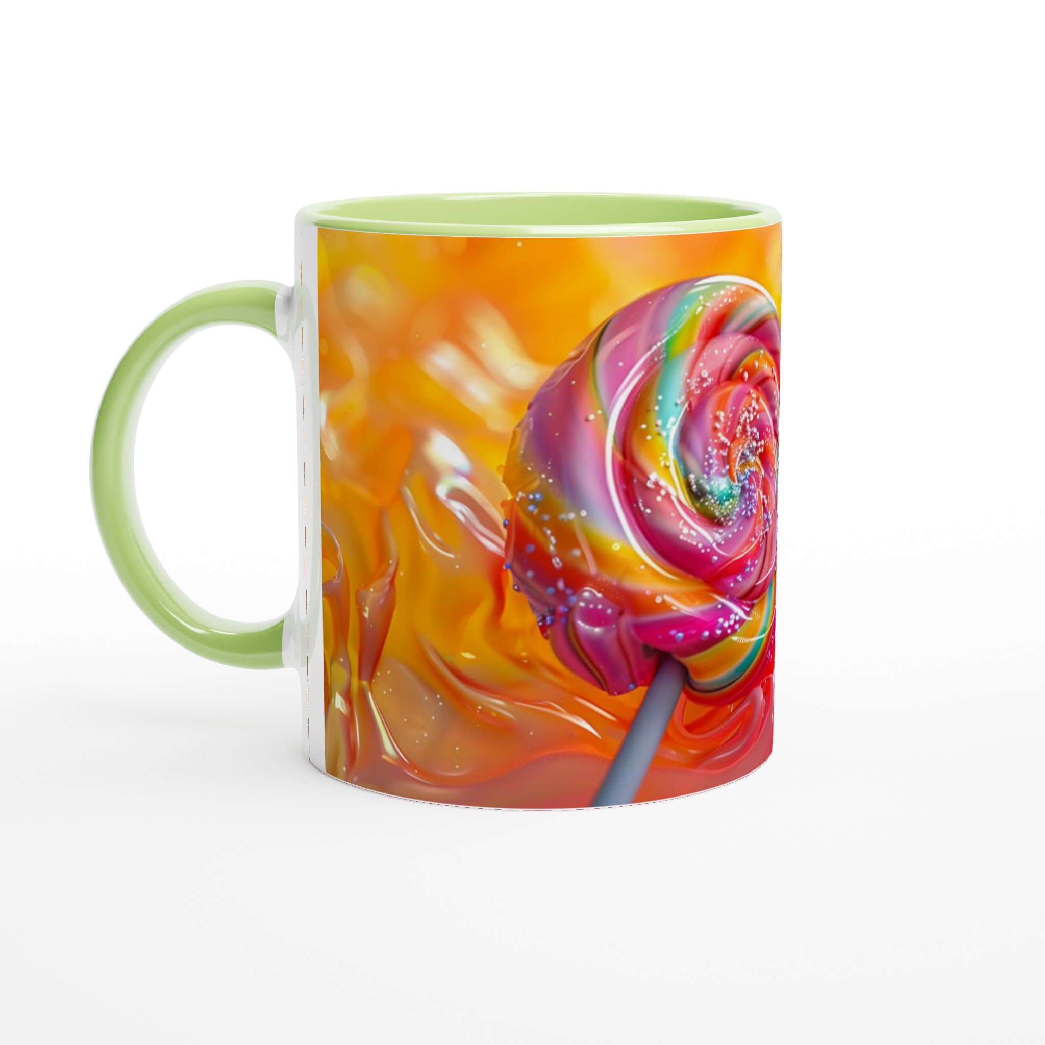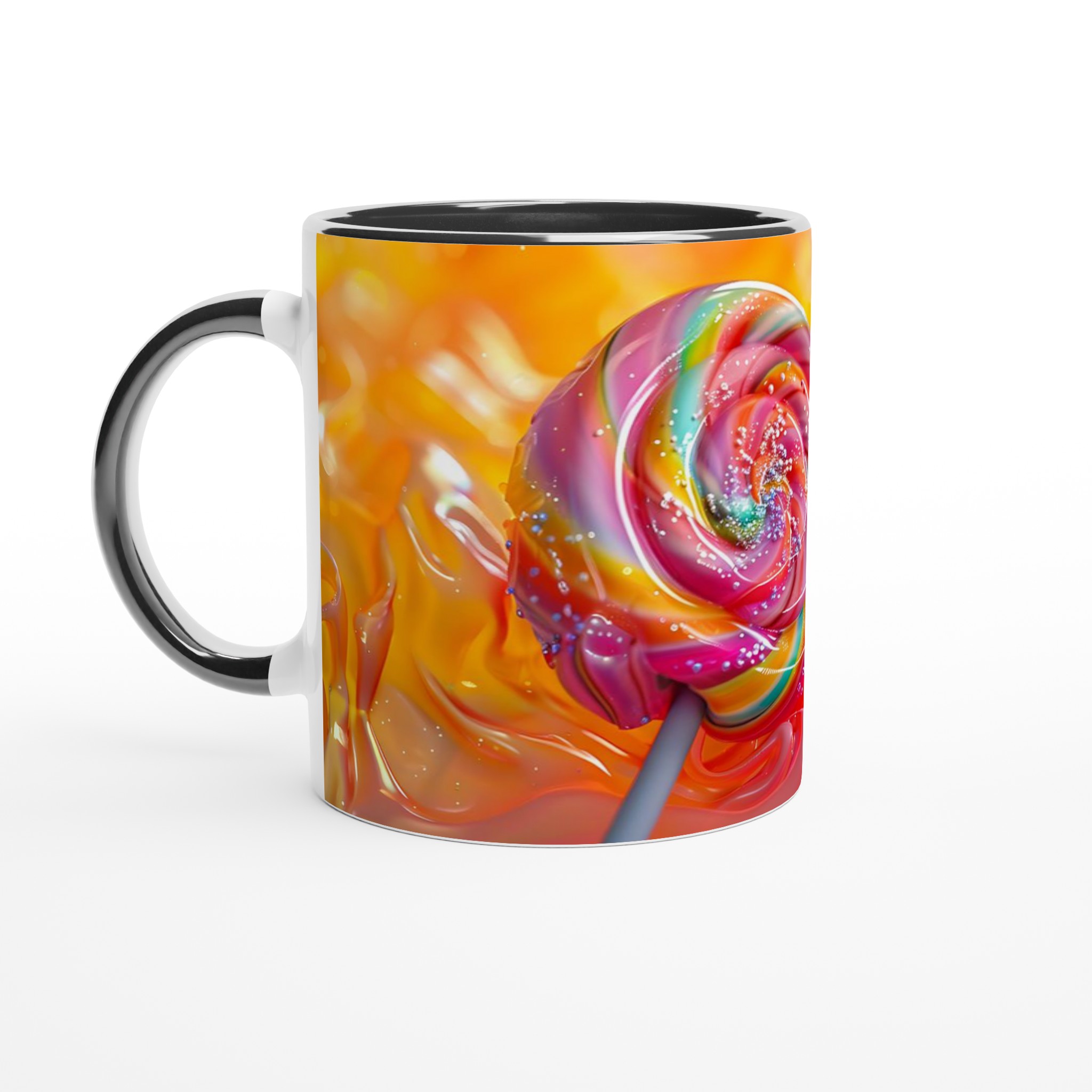 Den här stilrena keramiska muggen blir snabbt en vardagsfavorit. Perfekt för morgonkaffet, kvällens varma choklad eller när du bara vill njuta av en kopp te. Med sitt sprudlande, godisinspirerade tryck av en virvlande lollipop i livliga färger som rosa, gult och turkost, får varje sipp en extra touch av lekfull magi. Den blanka vita ytan gör att trycken framhävs med klara och levande färger, som håller sig fina även efter många turer i mikron och diskmaskinen.