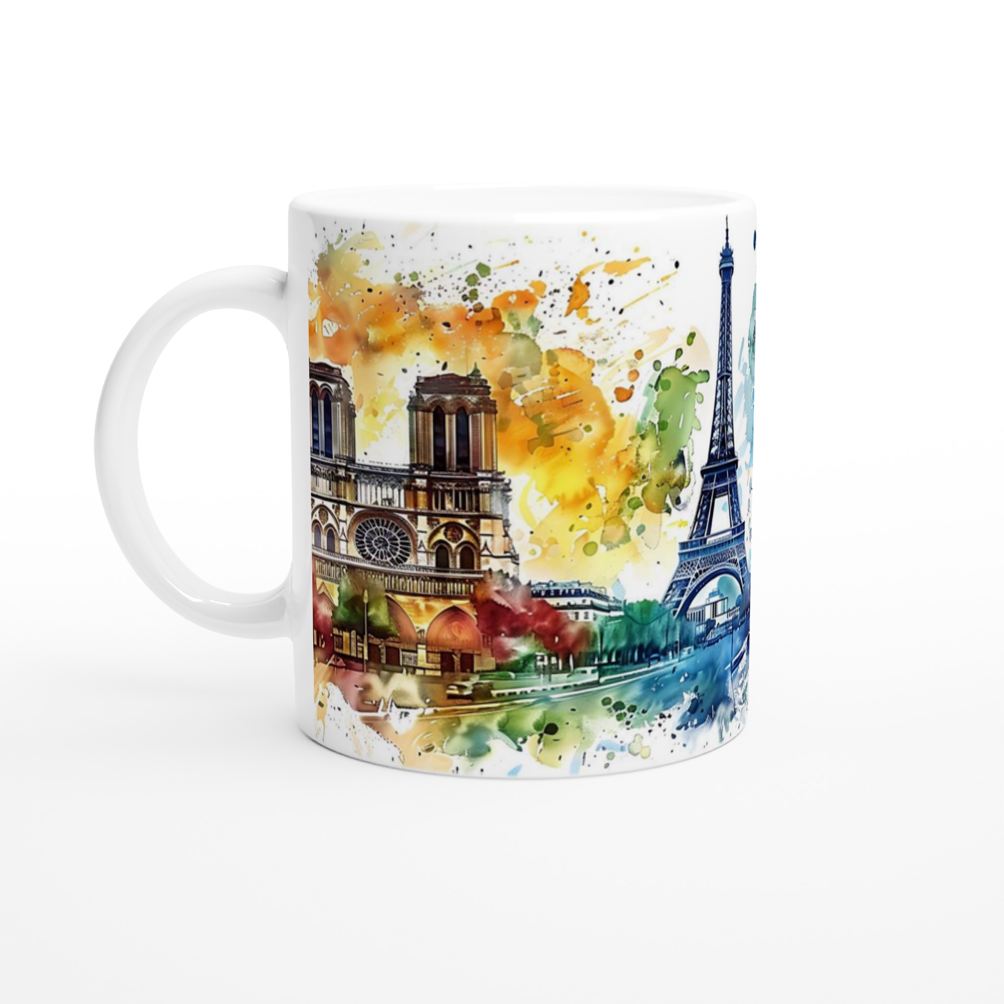 Väck dina resminnen till liv med denna unika keramikmugg, prydd med en livfull akvarellillustration av Paris ikoniska landmärken. Från Eiffeltornets elegans till Notre Dames majestät och Triumfbågens storslagenhet, fångas stadens själ i ett explosion av färg. Välj din favorit bland sju livfulla färger som ”Ceramic White” eller ”Ceramic Blue” för att skapa din alldeles egna Paris-inspirerade kaffestund. Varje klunk blir en resa till Kärlekens stad!