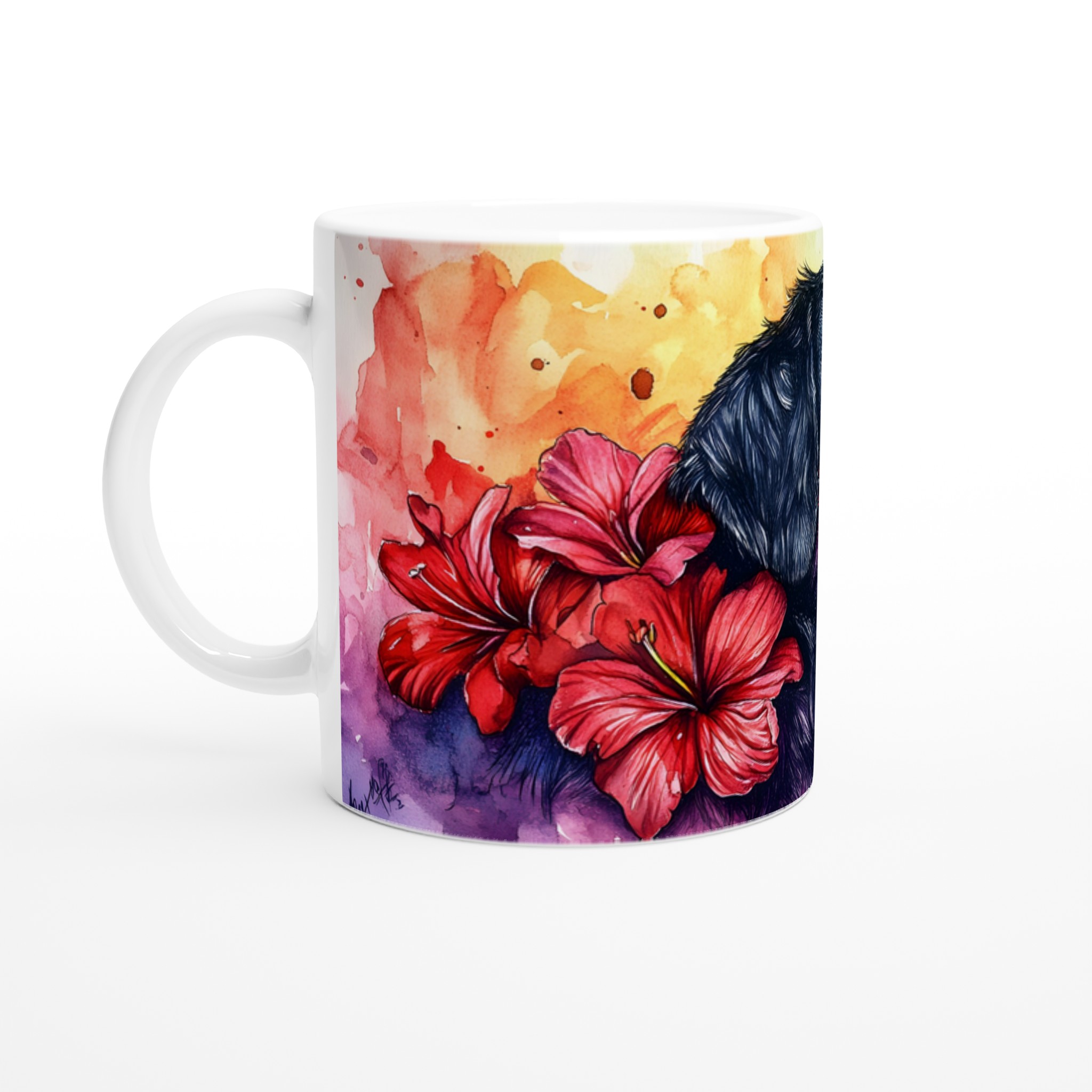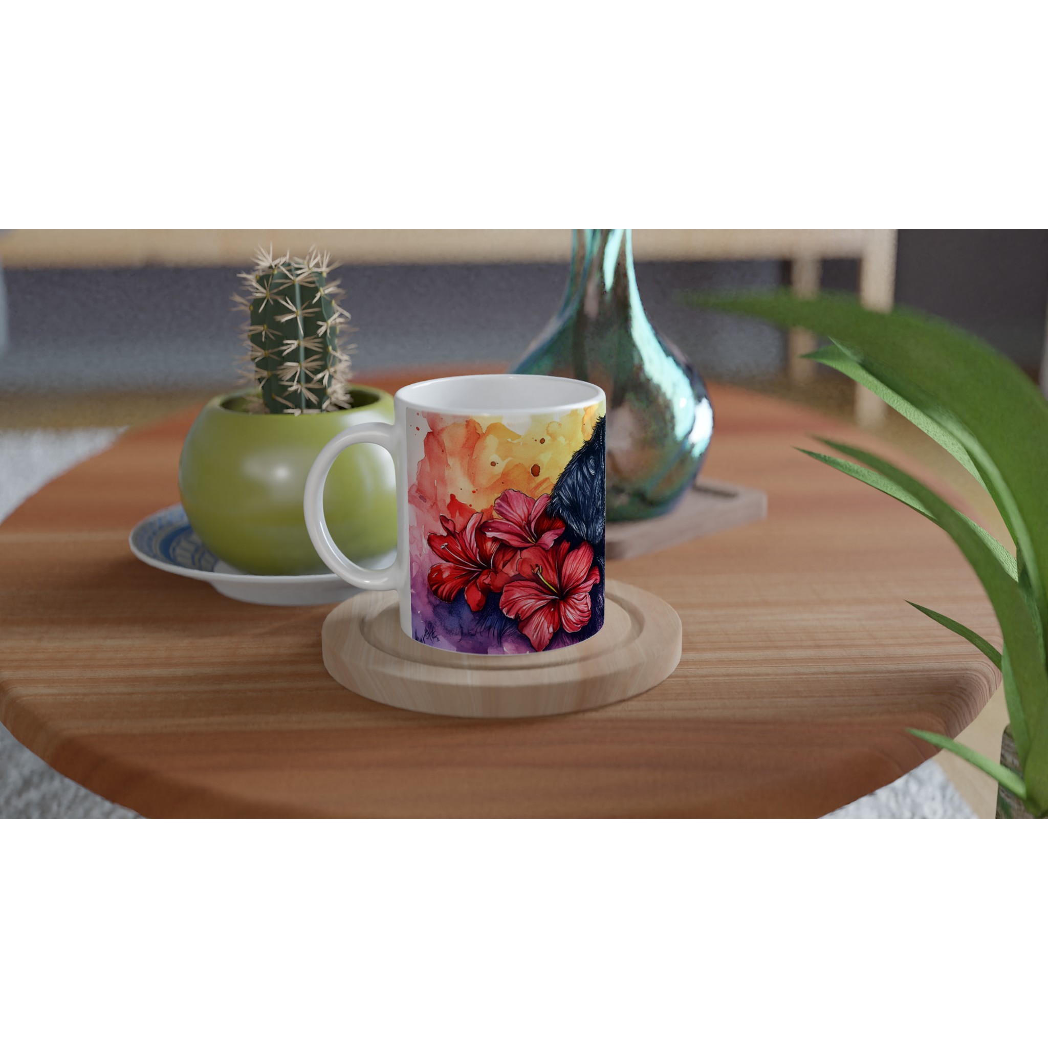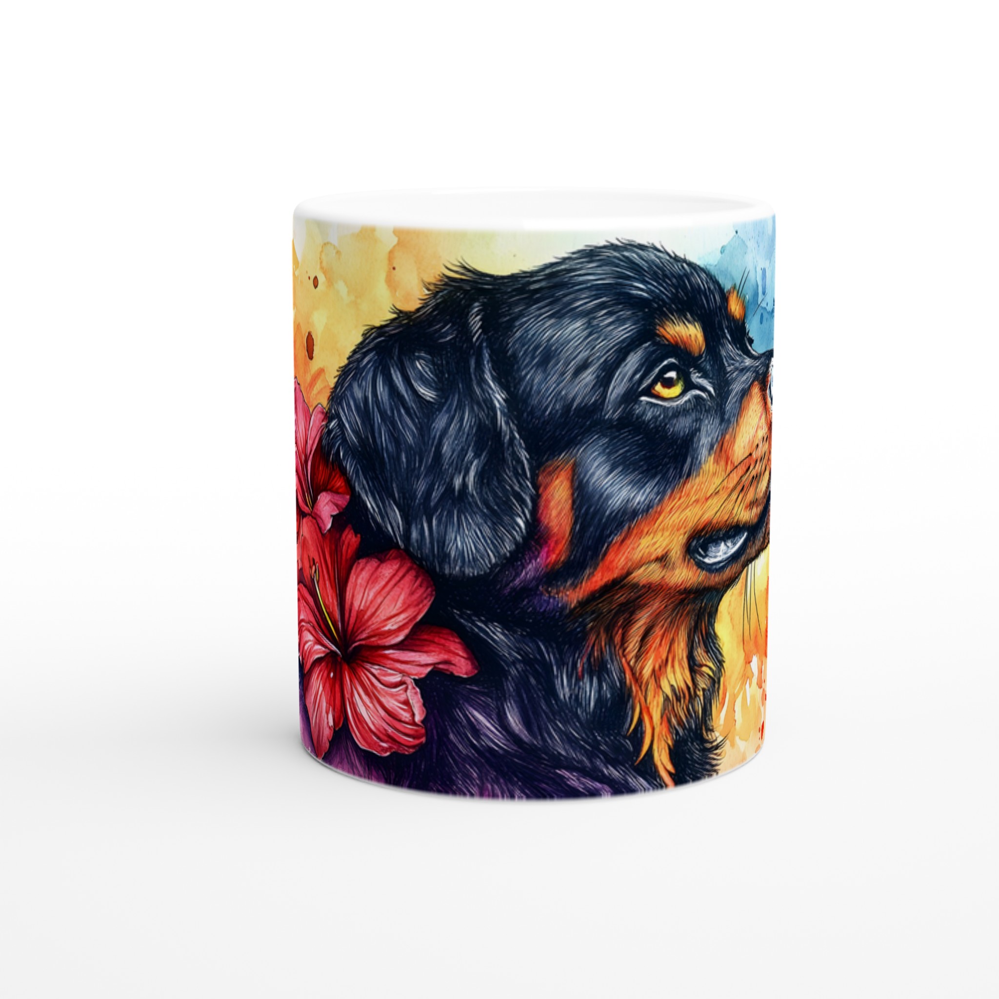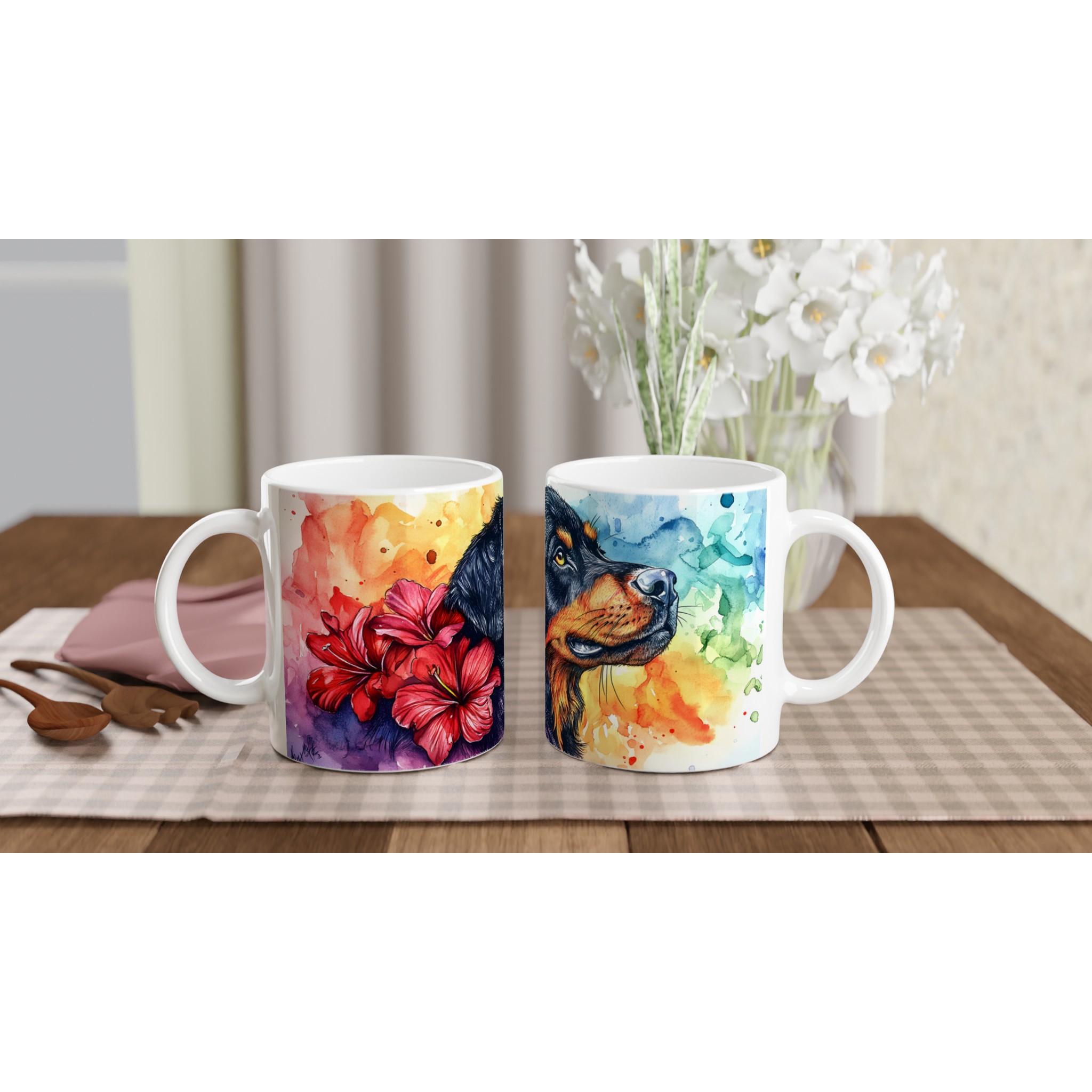 Väck dina sinnen varje morgon med denna livfulla keramikmugg, prydd med en majestätisk Rottweiler omgiven av frodiga röda hibiskusblommor mot en fantastisk akvarellbakgrund. De varma nyanserna av rött och orange blandas med svala blåa och gröna toner, vilket skapar en harmonisk och konstnärlig design som omedelbart lyfter humöret.