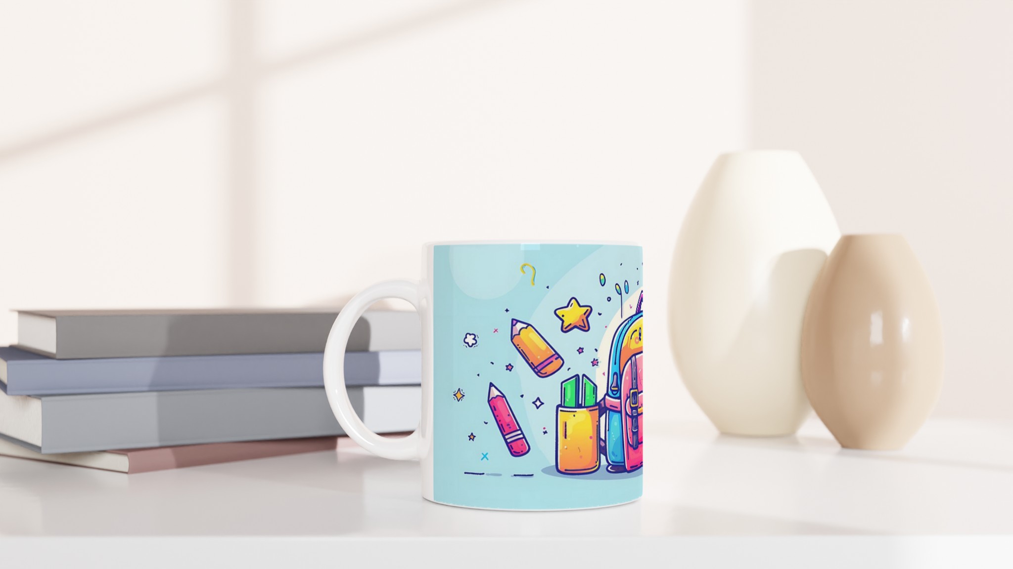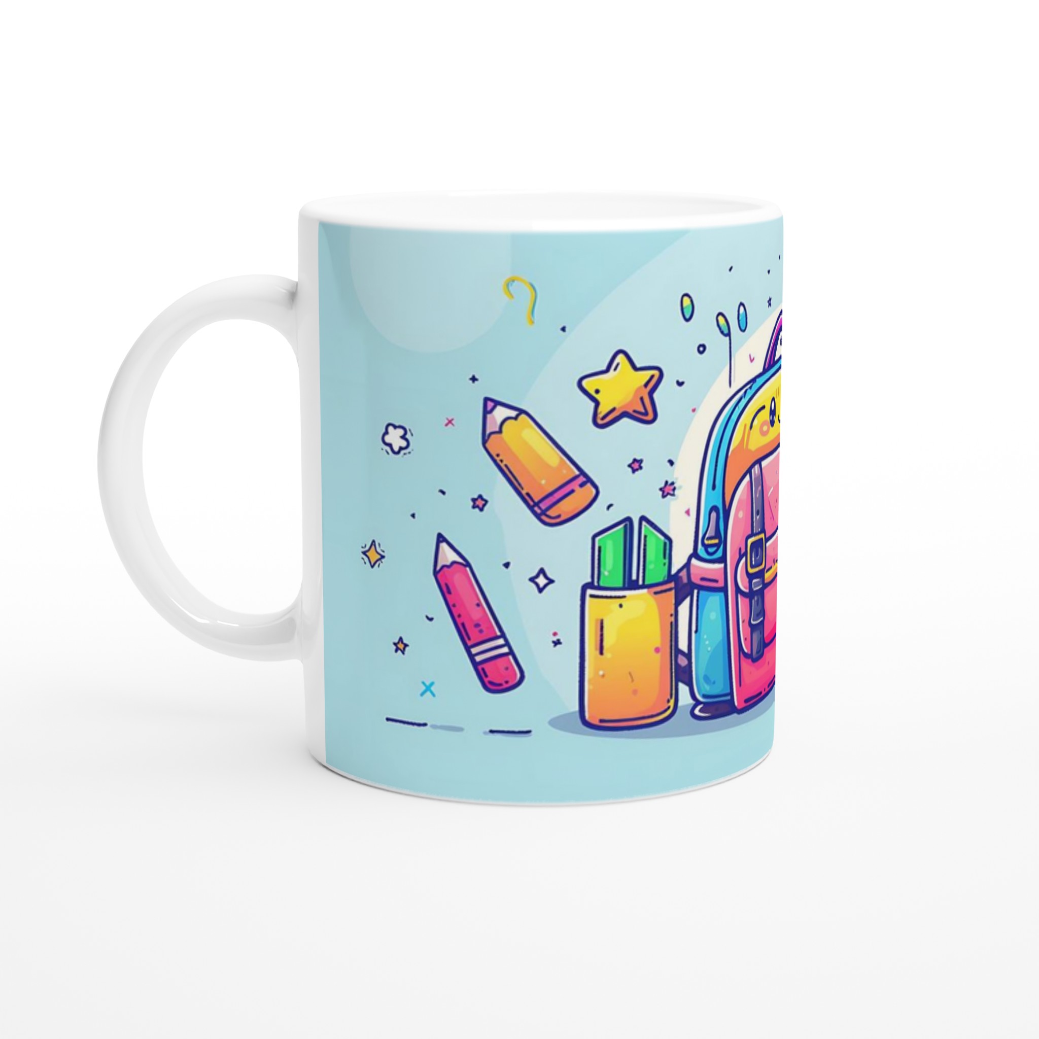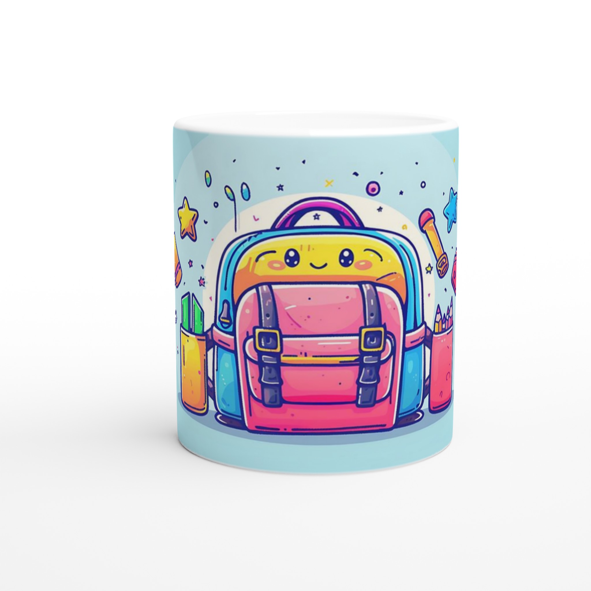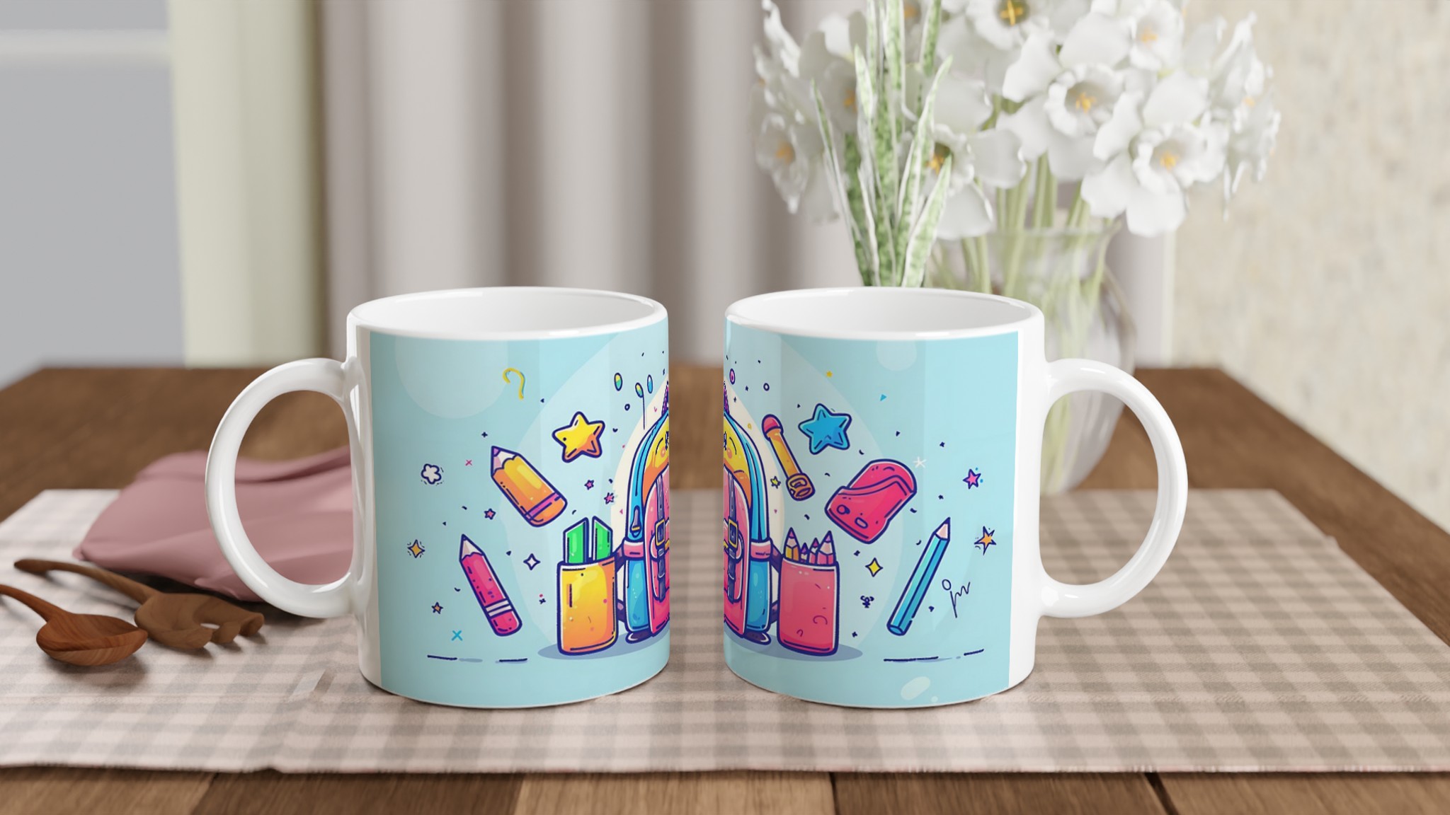 Väck kreativiteten och glädjen med vår ”Färgglad skolstart” keramiska mugg! Denna charmiga mugg är perfekt för alla små konstnärer och skolstartare, med sitt lekfulla motiv av en glad ryggsäck omgiven av pennor och suddgummin i livfulla färger. Det är den perfekta vardagsfavoriten för morgonkaffet (eller snarare, morgonmjölken!), kvällens varma choklad eller närhelst du vill njuta av en mysig stund. Den blanka ytan framhäver trycket med klara och levande färger, som håller sig fina även efter många turer i mikron och diskmaskinen, redo för dagens äventyr.