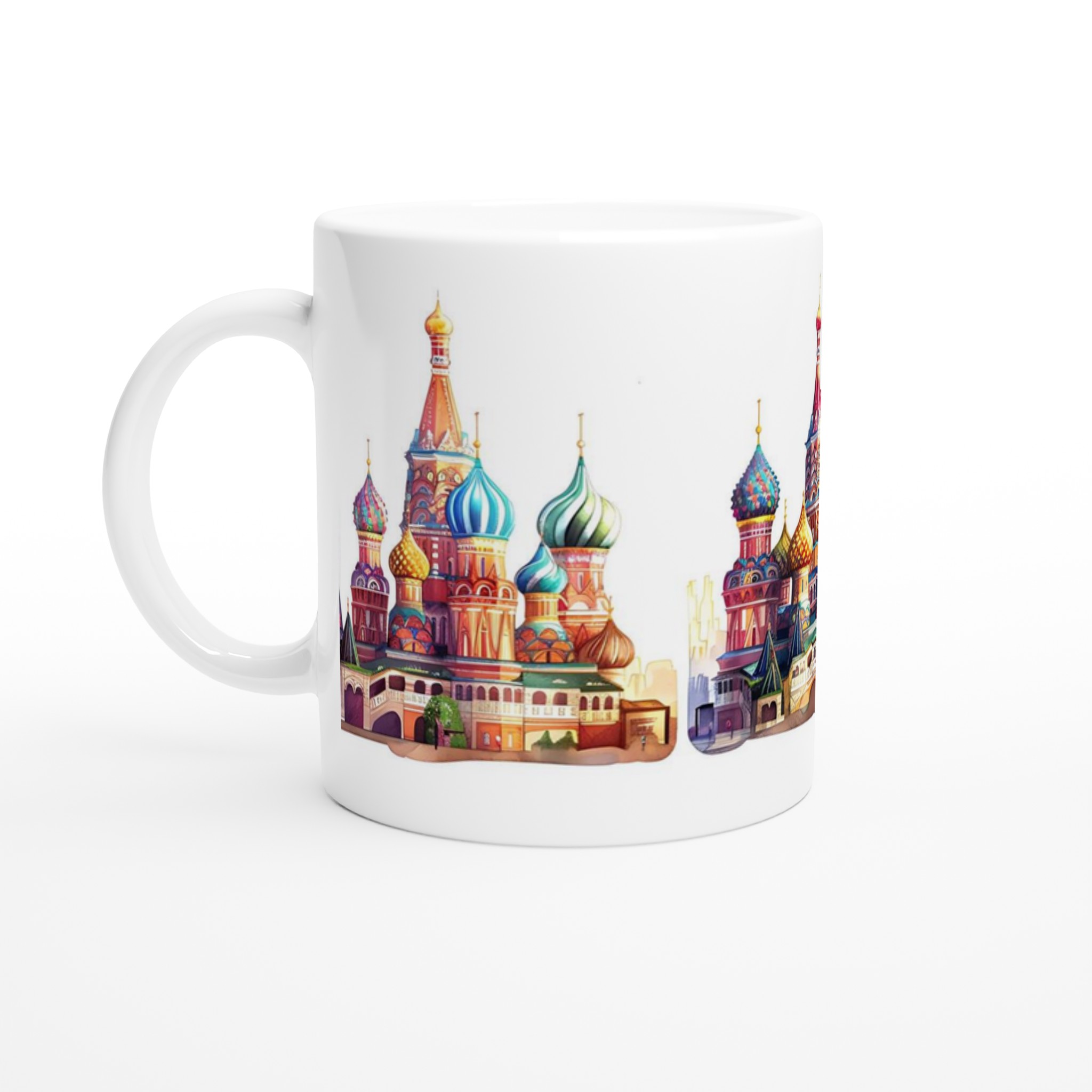 Väck dina sinnen med vår förtrollande 11oz keramikmugg, prydd med en livfull akvarellillustration av den ikoniska St. Basil’s katedral. Denna mugg fångar den ryska arkitekturens storslagenhet och glädje, med dess lekfulla kupoler i guld, rött, blått och grönt. Den blanka vita ytan ger ett skarpt och levande tryck som verkligen sticker ut, oavsett om det är en personlig design, ett roligt citat eller en present till någon du tycker om.
