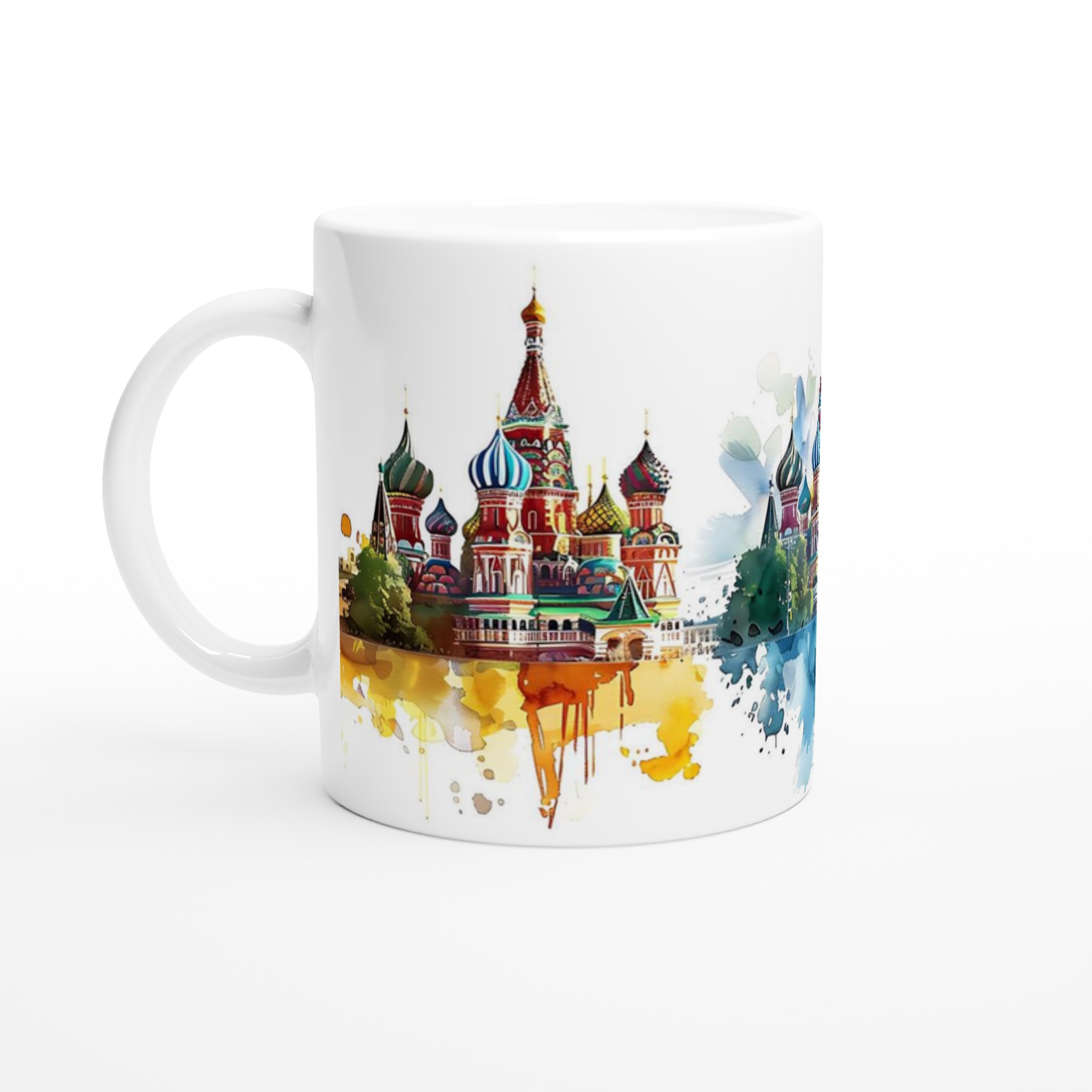 Inspirerad av den ikoniska St. Basil’s Katedral i Moskva, fångar denna akvarellmugg stadens levande färger och arkitektoniska skönhet. Den blanka vita ytan ger ett skarpt och levande tryck som verkligen sticker ut, oavsett om det är en personlig design, ett roligt citat eller en present till någon du tycker om.