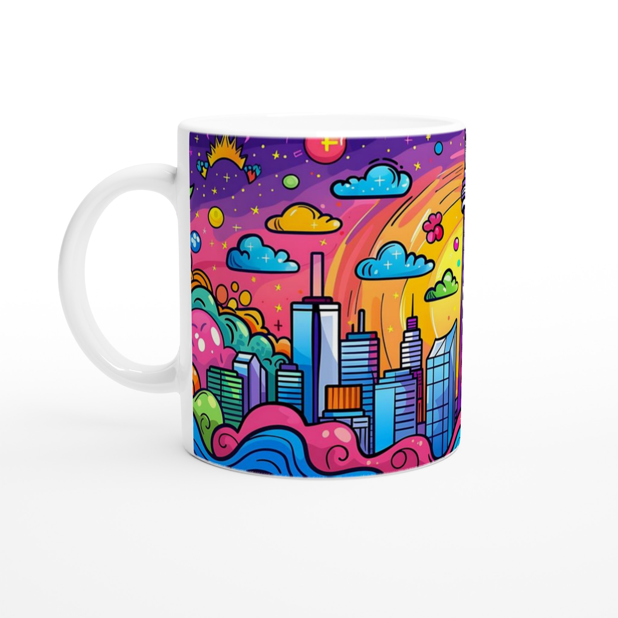 Inspirerad av en vibrerande popkonst-stadsbild med en palett som exploderar i rosa, lila, gult och blått, är denna mugg en hyllning till glädje och kreativitet. Den blanka vita ytan ger ett skarpt och levande tryck som verkligen sticker ut, oavsett om det är en personlig design, ett roligt citat eller en present till någon du tycker om.
