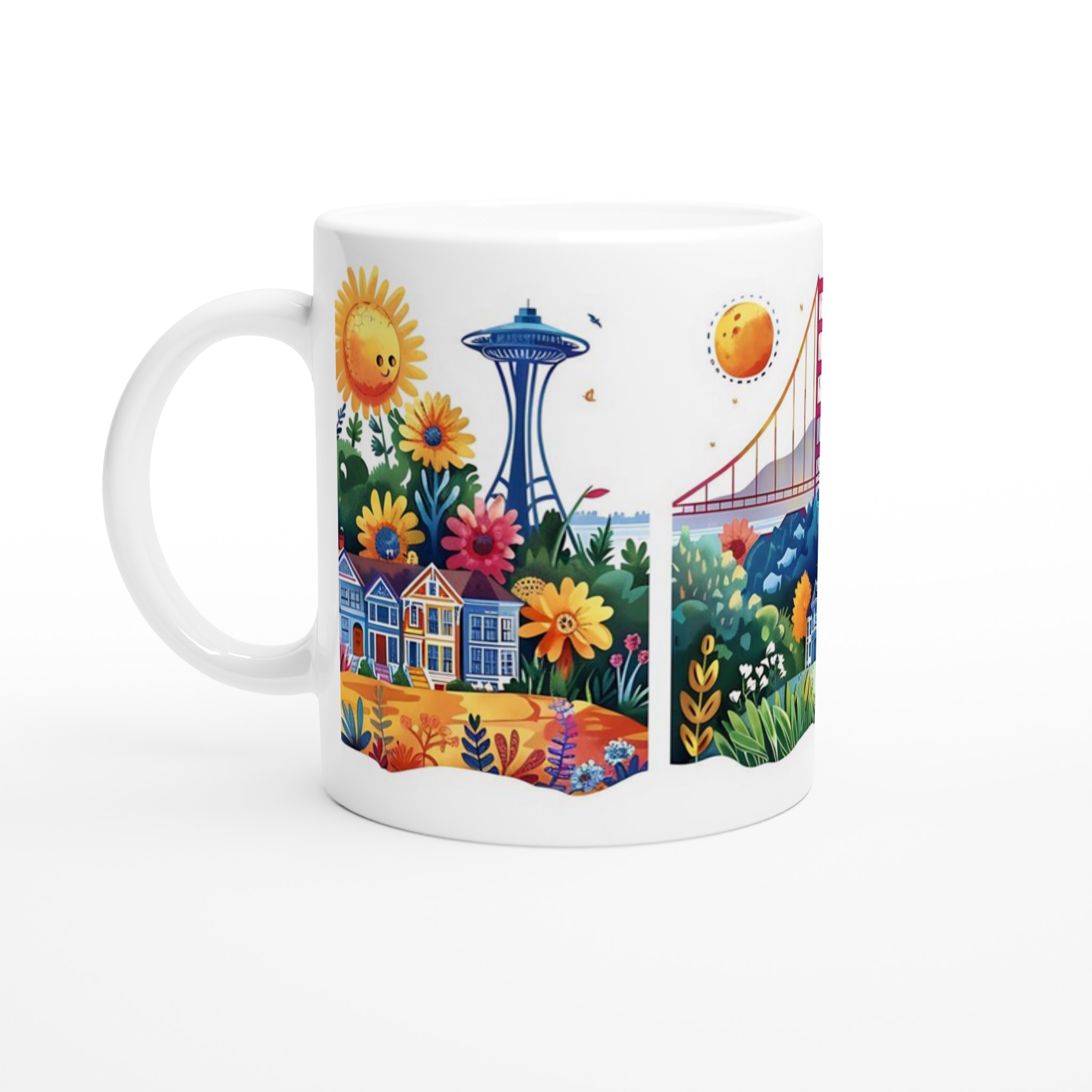 Denna mugg fångar essensen av ikoniska stadslandskap med en lekfull och färgstark twist. Låt den glada solen över Seattle, den majestätiska Golden Gate-bron, eller New Yorks imponerande silhuett förgylla din fikapaus. Varje detalj är framställd med en unik, handmålad känsla som för tankarna till en fantasifull sagovärld.
