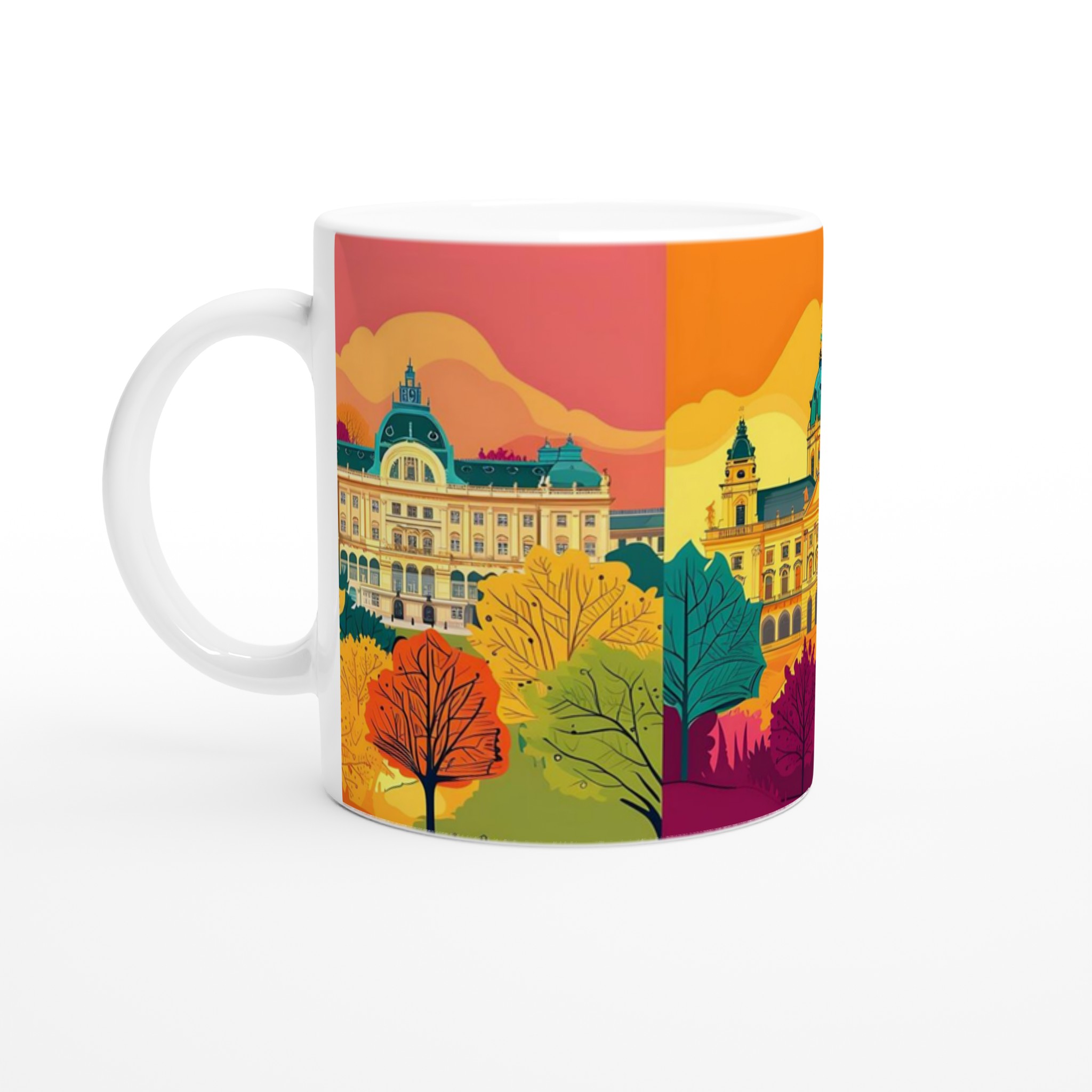 Vår mugg med den färgglada stadsbilden är inspirerad av ikonisk arkitektur i en palett av lugnande turkos, varm orange och dämpade rosa nyanser, som transporterar dig till en drömlik stadsvy med varje klunk. Denna unika design blandar klassiska byggnader med moderna, stiliserade landskap, perfekt för den som uppskattar konst och kultur i vardagen. Välj bland våra sju eleganta keramiska färger för att matcha din personliga stil – från klassisk Ceramic White till livfulla Ceramic Red eller Ceramic Blue.
