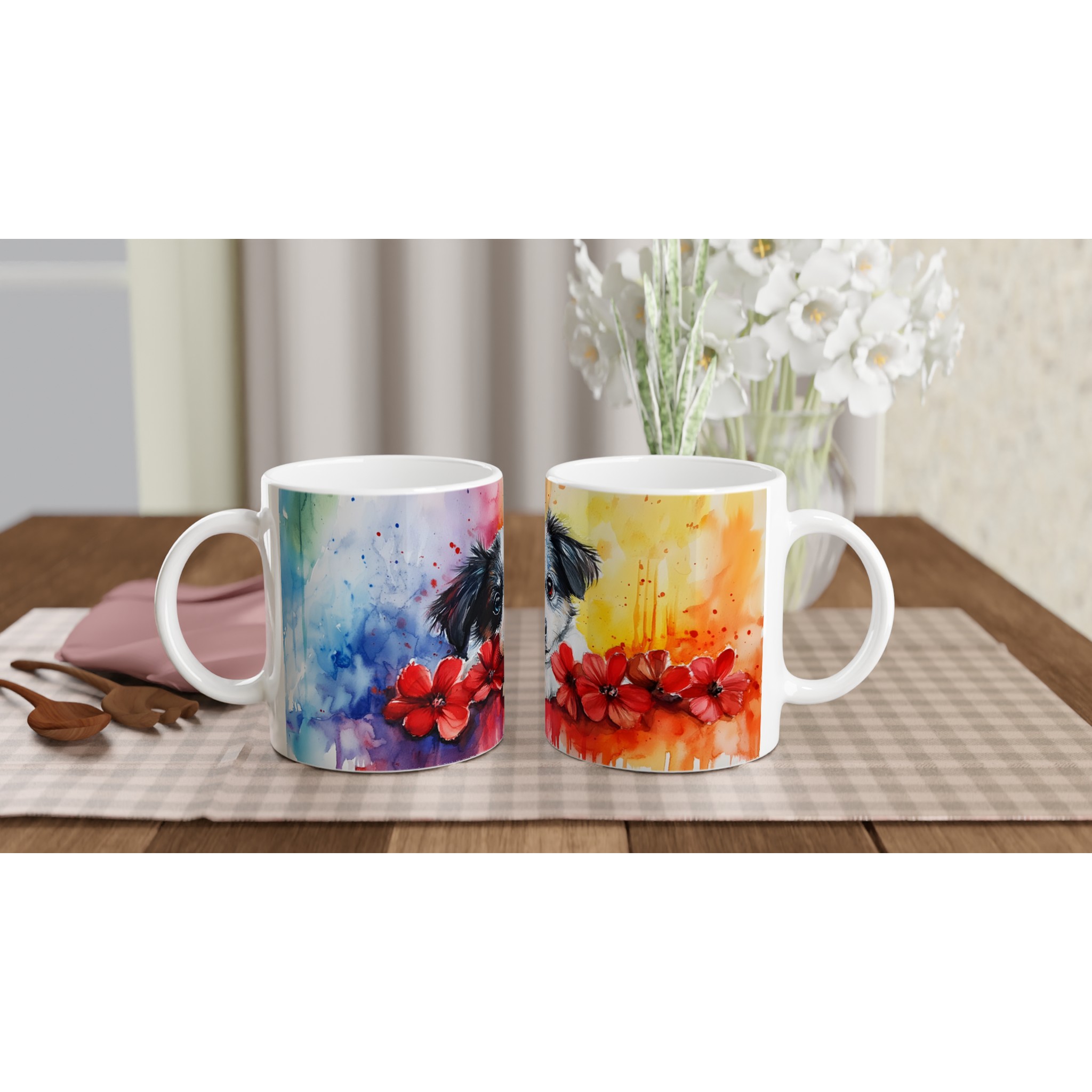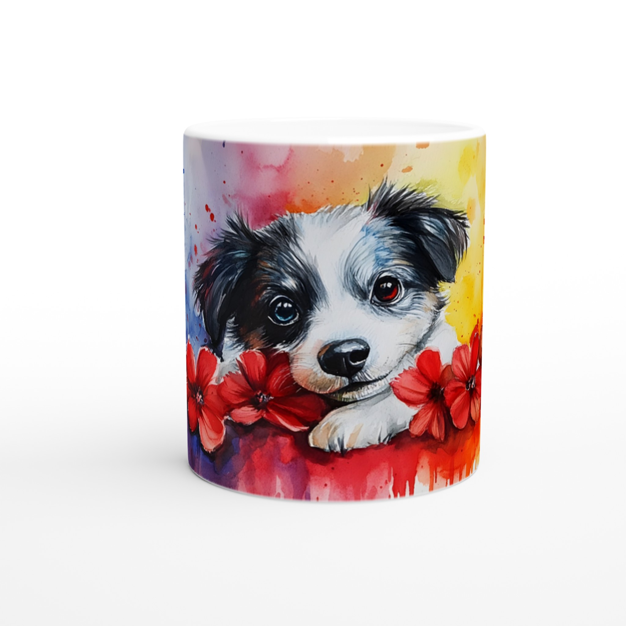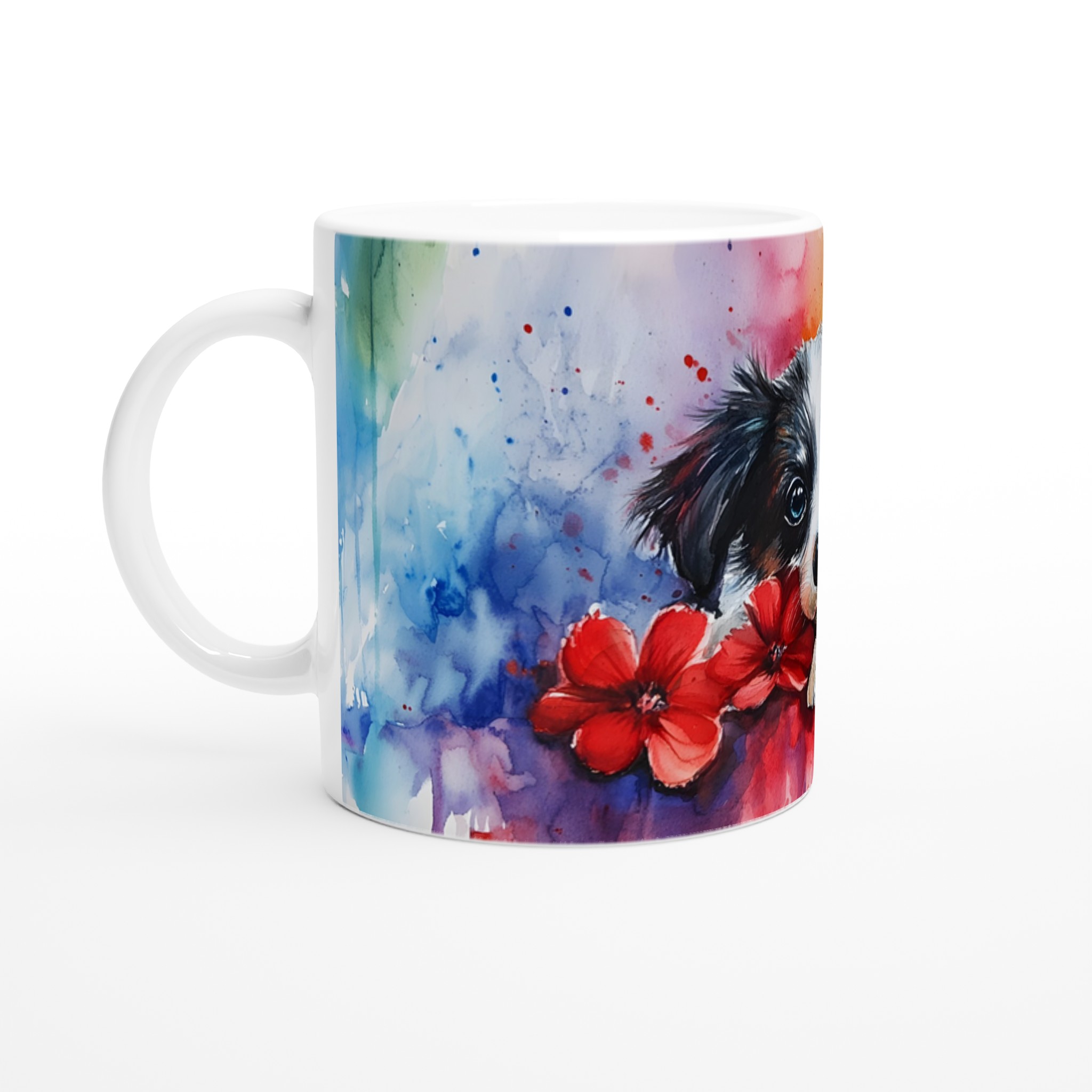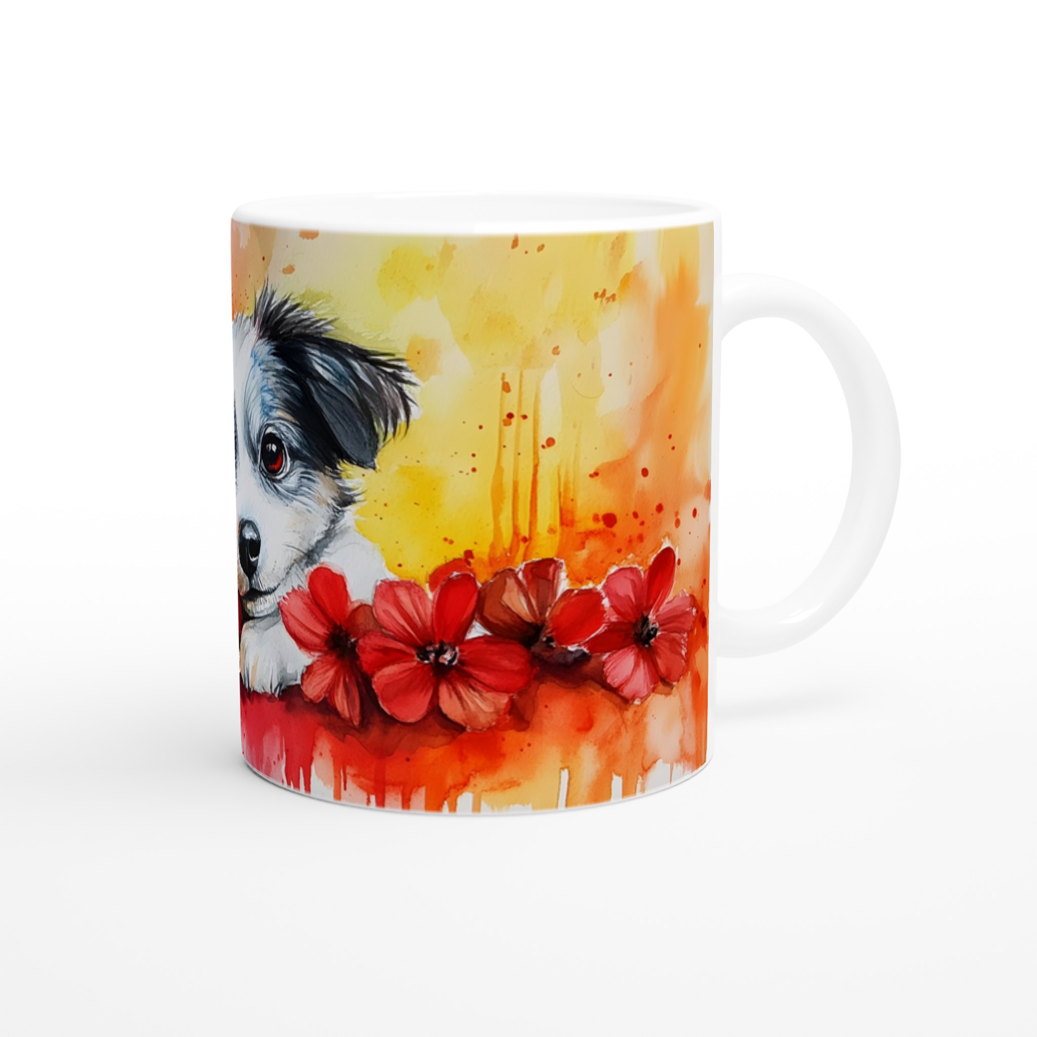 Vakna upp till glädje varje morgon med denna bedårande akvarellmugg, prydd med en söt valp omgiven av levande färger och lekfulla röda blommor. Denna mugg fångar den glada och sprudlande känslan av en ung hund i ett konstnärligt uttryck som lyser upp vilken stund som helst på dagen – vare sig det är med morgonkaffet, en värmande kopp te eller en härlig varm choklad. Den blanka vita ytan ser till att det charmiga trycket framträder klart och färgstarkt, vilket gör muggen till en riktig favorit i vardagen.