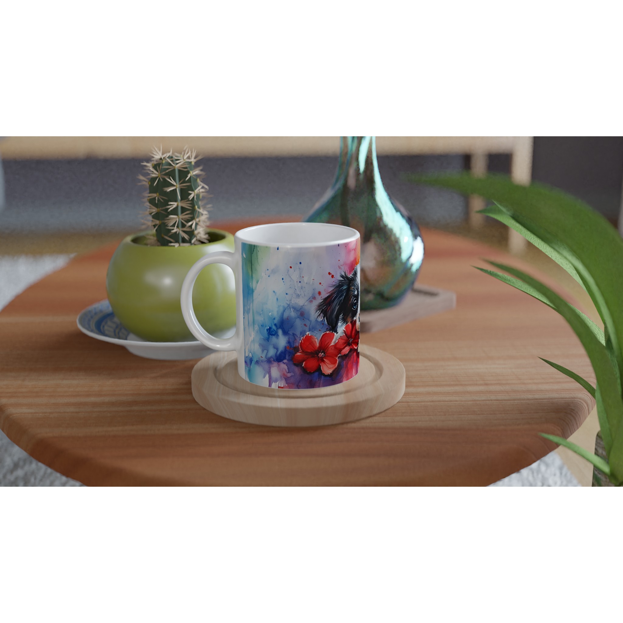 Tillverkad med hög kvalitet, behåller trycket sin lyster och sina livfulla färger även efter otaliga omgångar i både mikrovågsugn och diskmaskin. Muggen rymmer 11 oz (ca 3,25 dl), en lagom storlek för både jobb och hemmabruk. Den passar perfekt som en personlig vardagsmugg eller som en hjärtevärmande och uppskattad present till hundälskare, familj, vänner eller kollegor som uppskattar konst och lekfullhet.