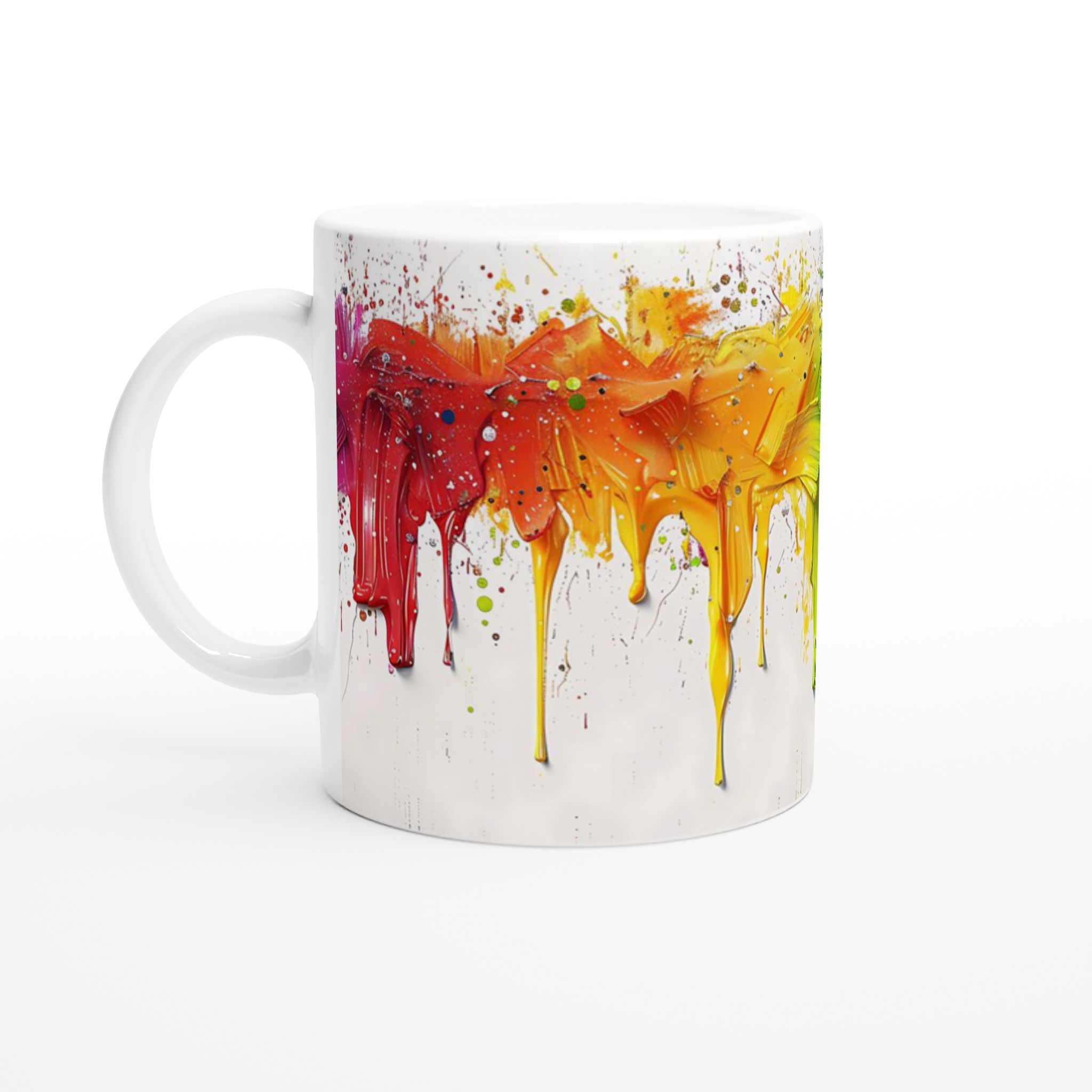 Lyft varje kaffestund med vår premium keramikmugg – stilren, hållbar och skapad för att låta ditt motiv glänsa. Inspirerad av den dynamiska paletten av smältande färger, är denna mugg en hyllning till glädje och kreativitet. Föreställ dig den livfulla känslan av rinnande färg som förvandlas till en konkret upplevelse i din hand, varje morgon.