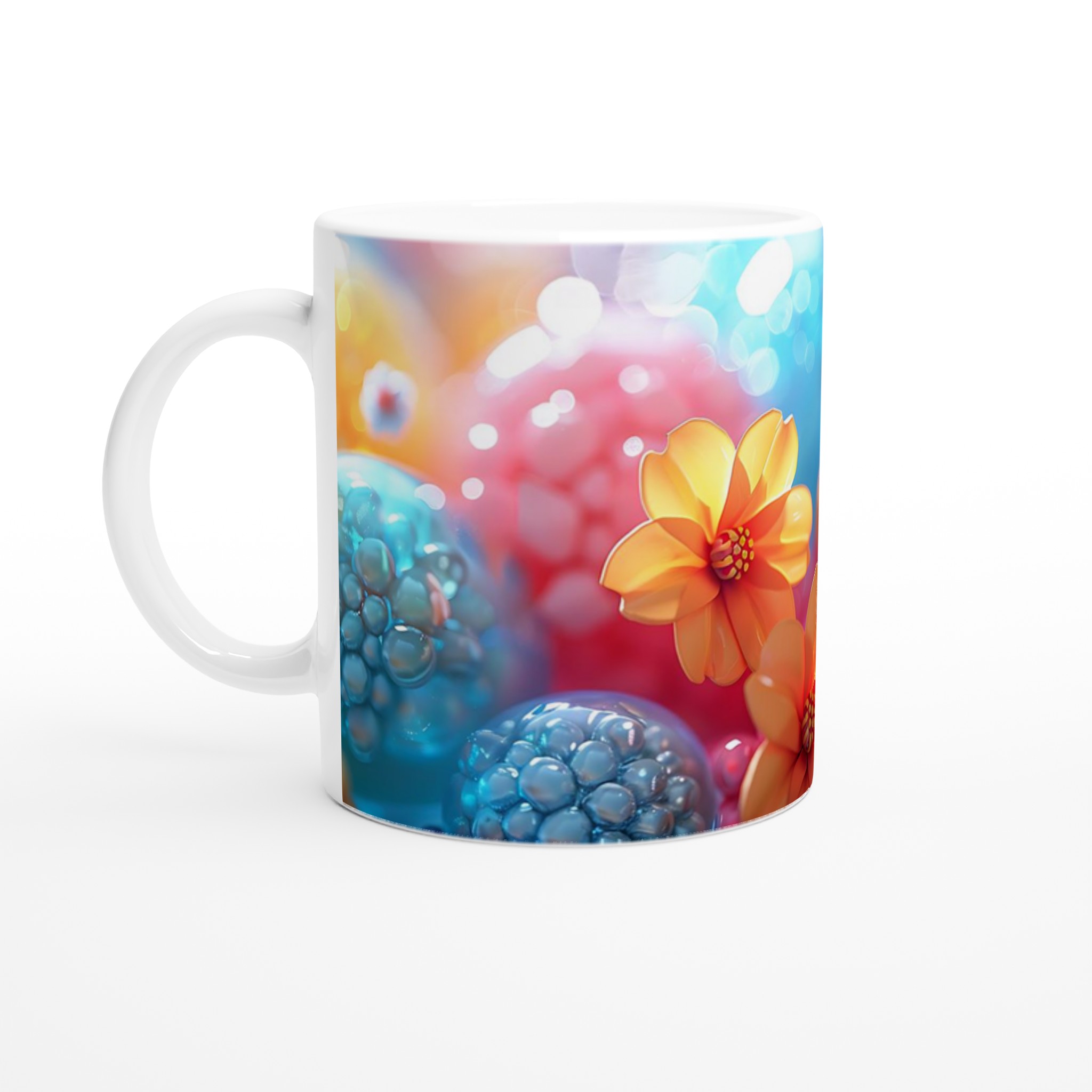 Den blanka vita ytan ger ett skarpt och levande tryck som verkligen sticker ut, oavsett om det är en personlig design, ett roligt citat eller en present till någon du tycker om. Inspirerad av en explosion av glädje och färg, med skimrande bubblor och blommor i rosa, gult och blått, är denna mugg den perfekta duken för att få dina egna ljusa designer att poppa.