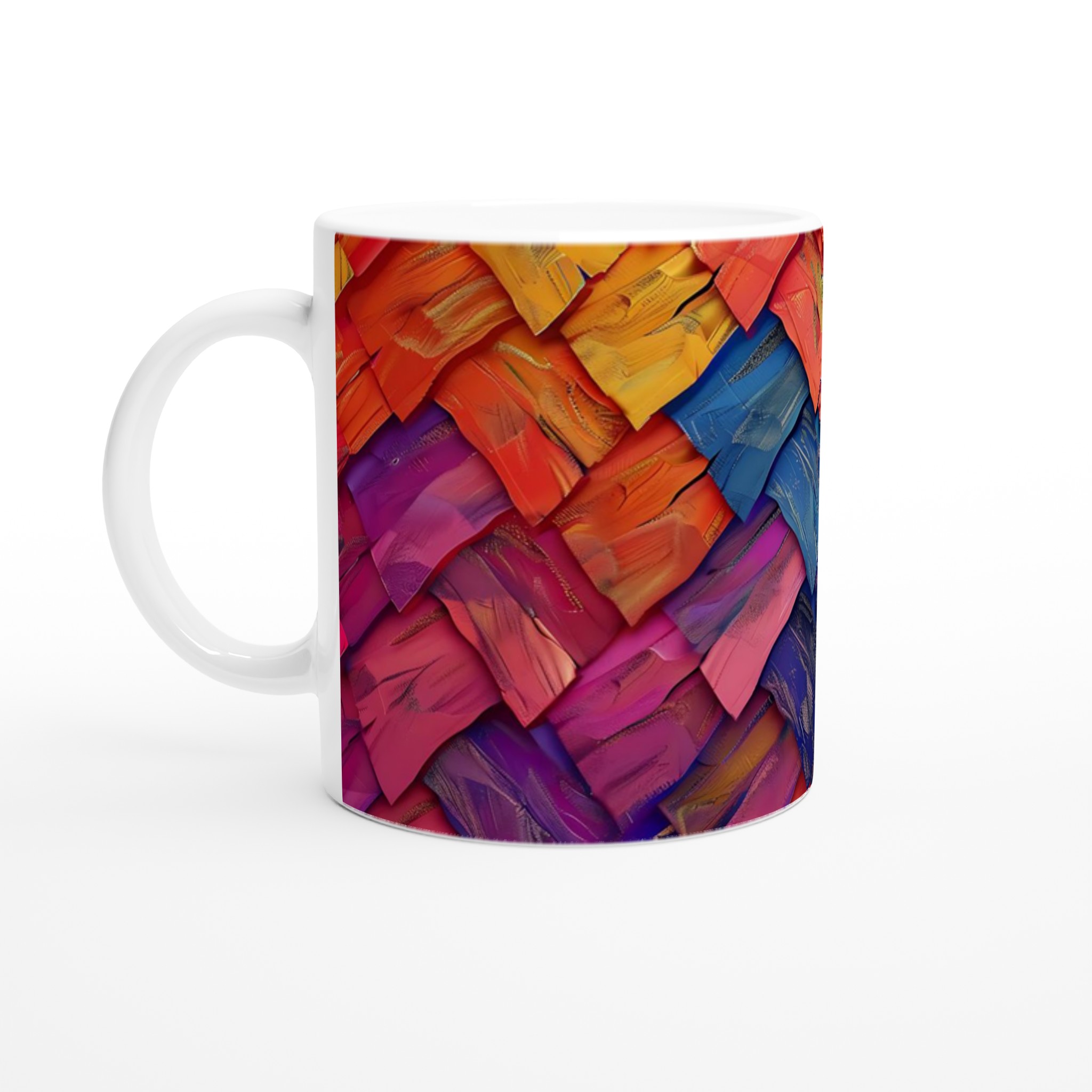 Lyft varje kaffestund med vår premium keramikmugg – stilren, hållbar och skapad för att låta ditt motiv glänsa. Inspirerad av abstrakt konst och en explosion av färger, ger denna mugg en kreativ touch till din vardag. De rika, sammanflätade nyanserna av magenta, orange, gult, blått och lila skapar en dynamisk känsla som förvandlar varje sipp till en upplevelse.