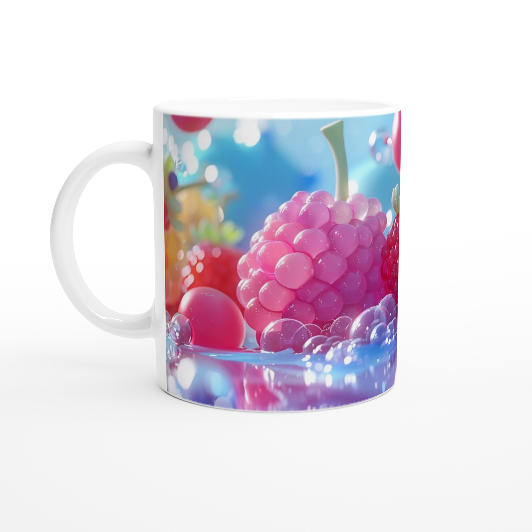 Den blanka vita ytan ger ett skarpt och levande tryck som verkligen sticker ut, oavsett om det är en personlig design, ett roligt citat eller en present till någon du tycker om. Inspirerad av bilden, där levande färger och lekfulla former möts i en drömlik komposition, är denna mugg den perfekta bakgrunden för att få dina egna kreativa uttryck att poppa. Föreställ dig din design omgiven av den ljusa, bubbliga energin från en sommaräng fylld med saftiga bär!