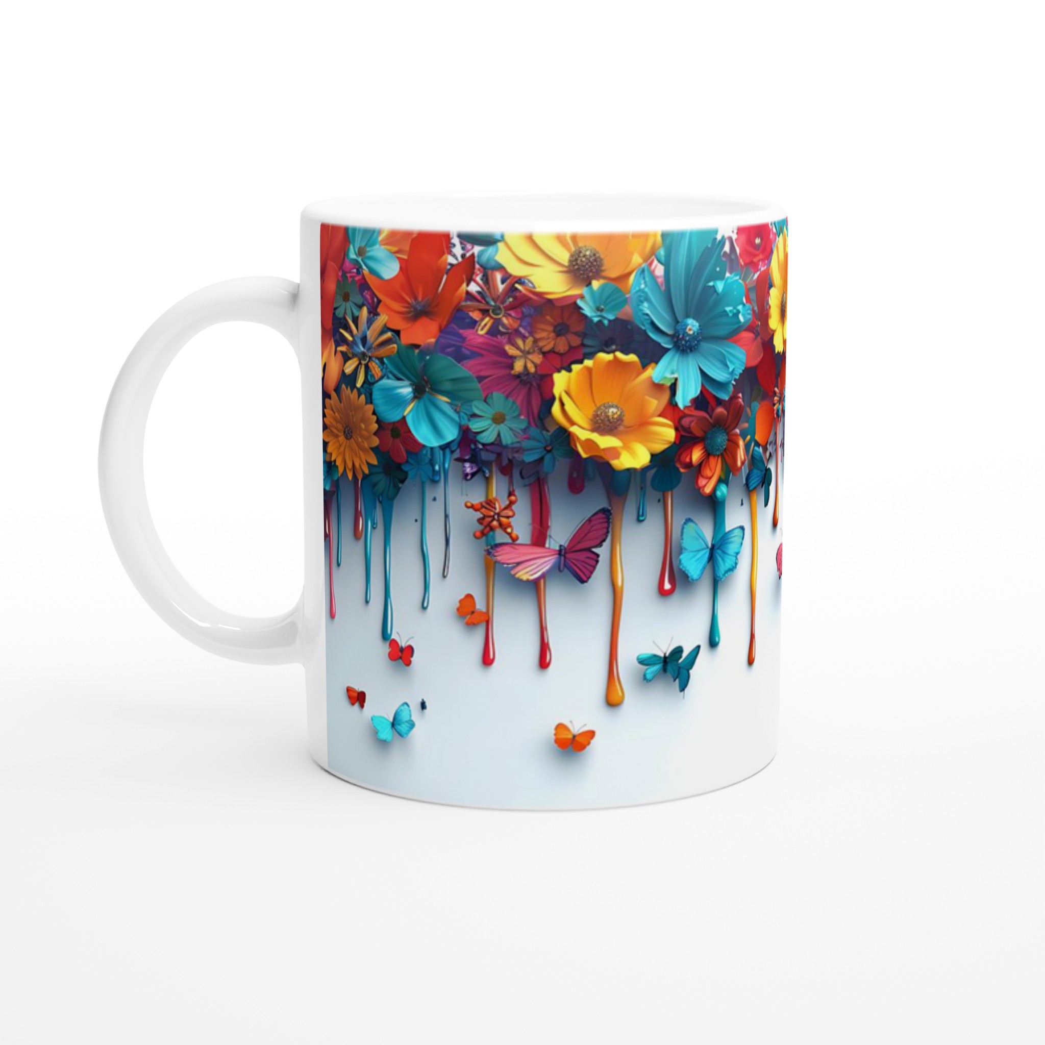 Inspirerad av naturens livfulla palett med flytande färger och lekfulla fjärilar, erbjuder denna mugg en explosion av glädje och färg. Den blanka vita ytan ger ett skarpt och levande tryck som verkligen sticker ut, oavsett om det är en personlig design, ett roligt citat eller en present till någon du tycker om.