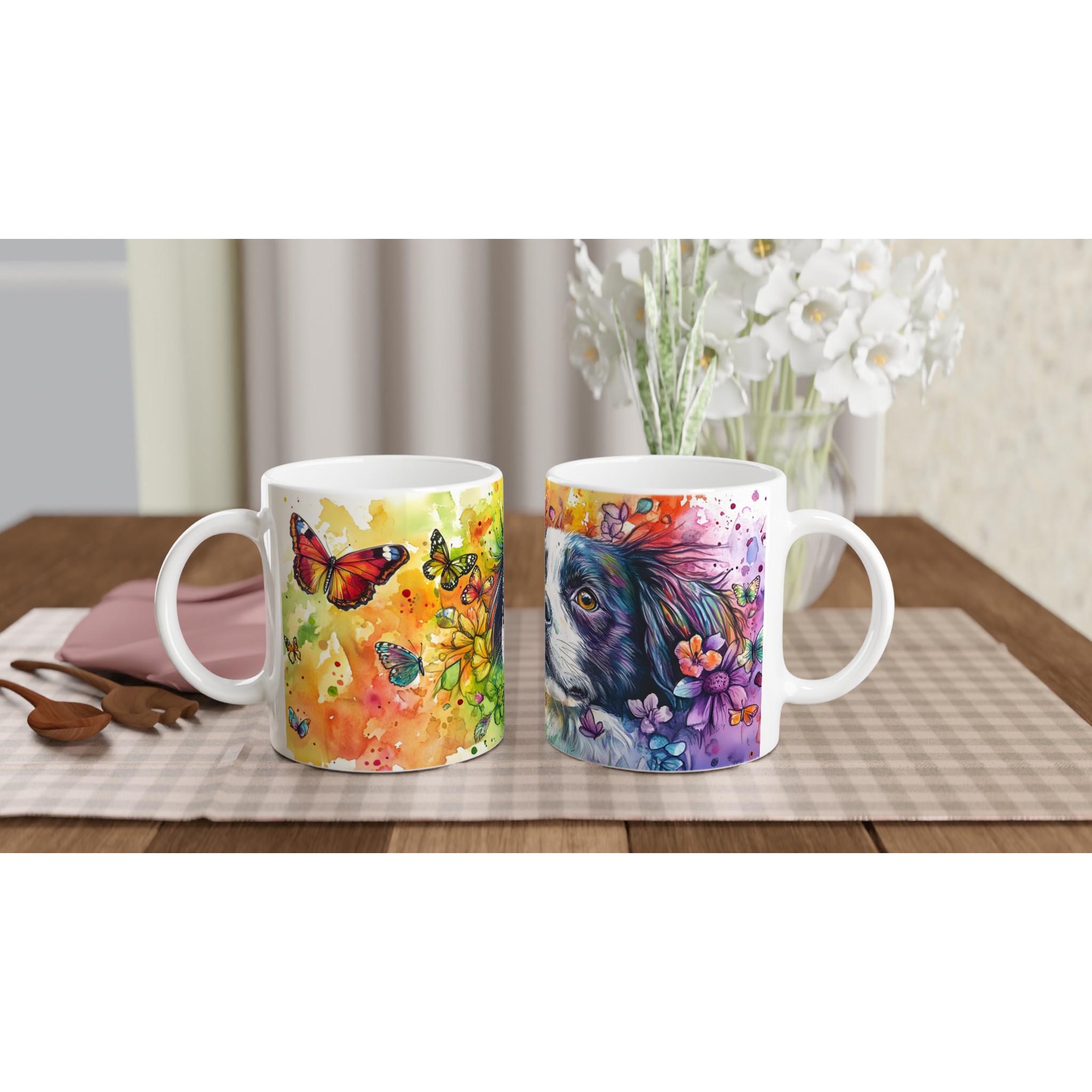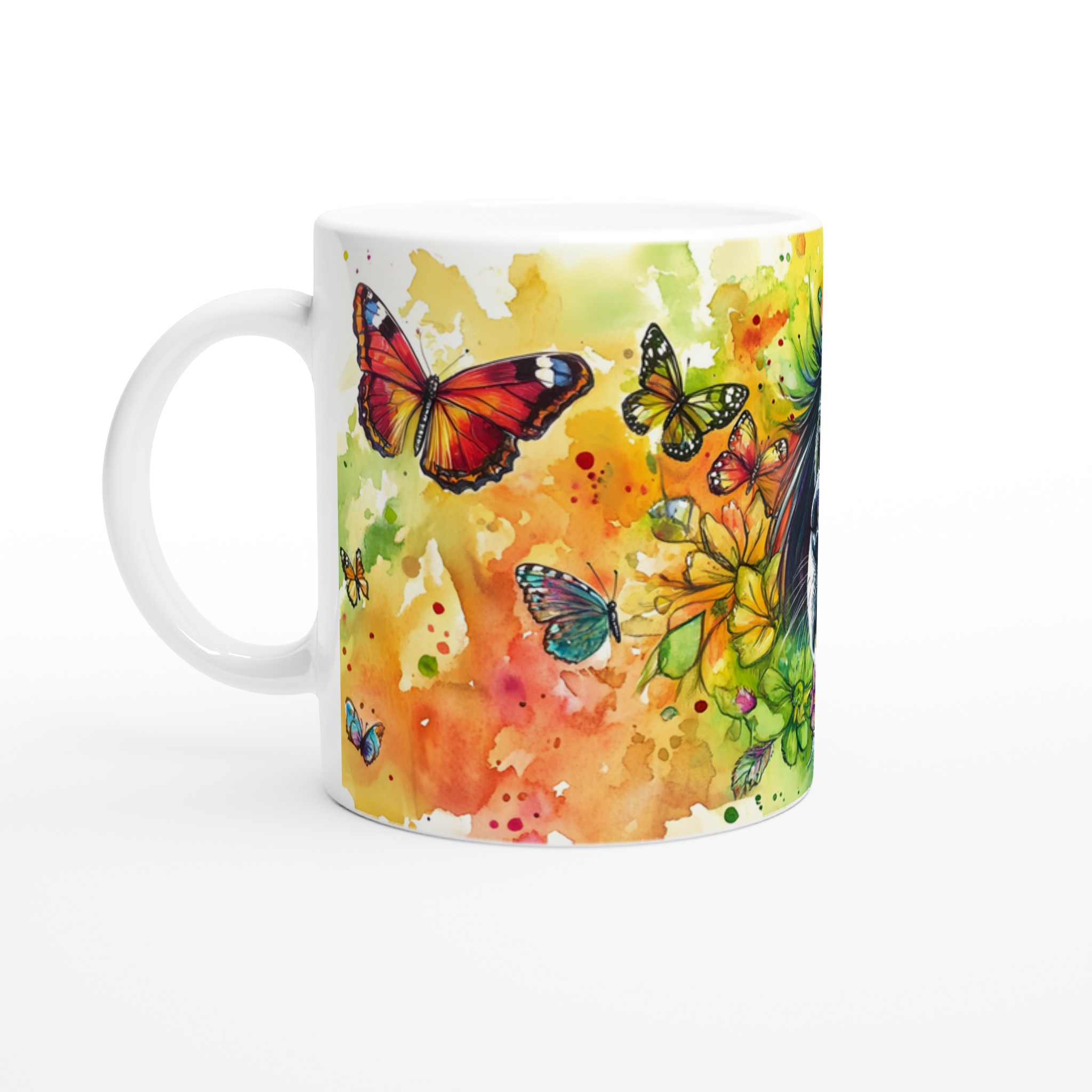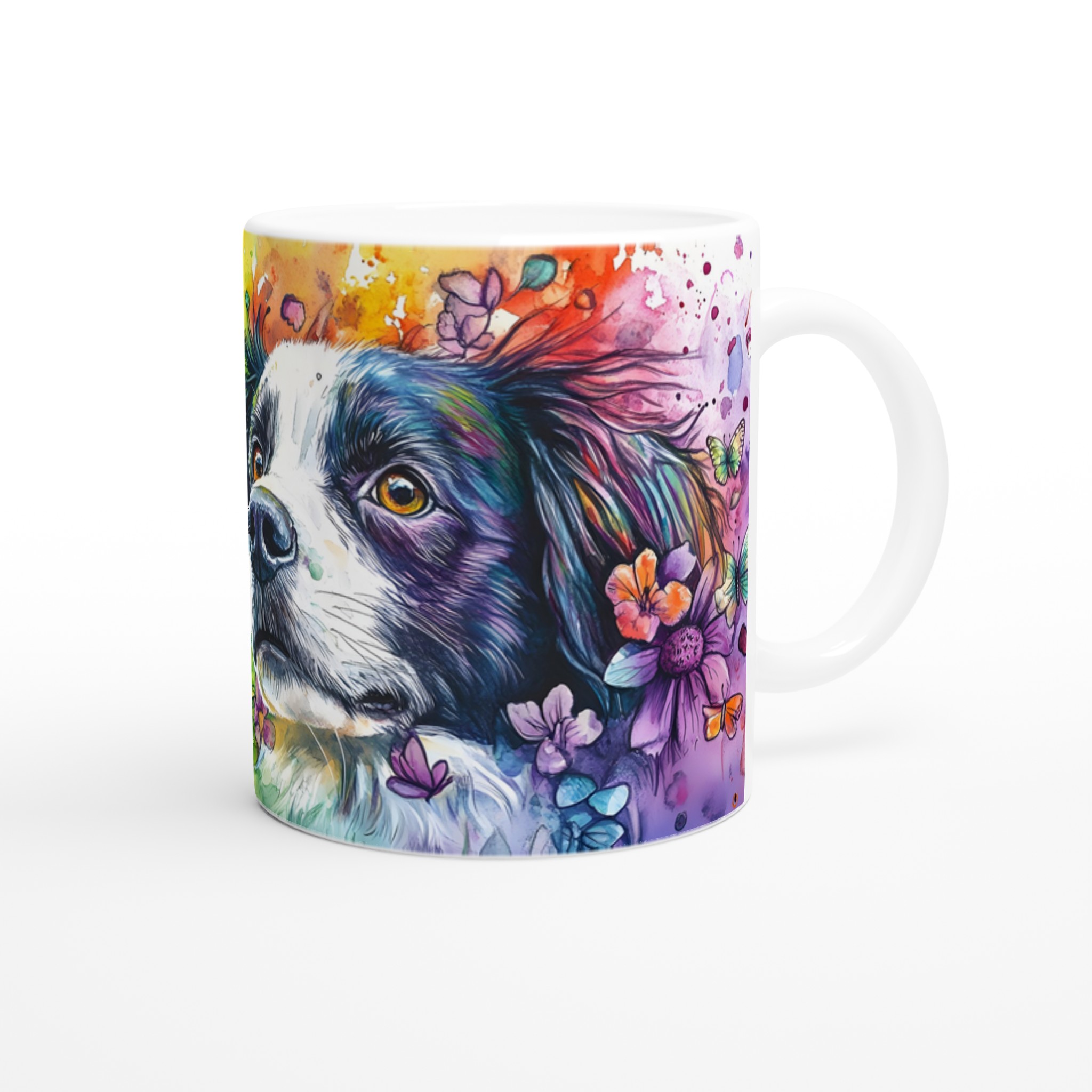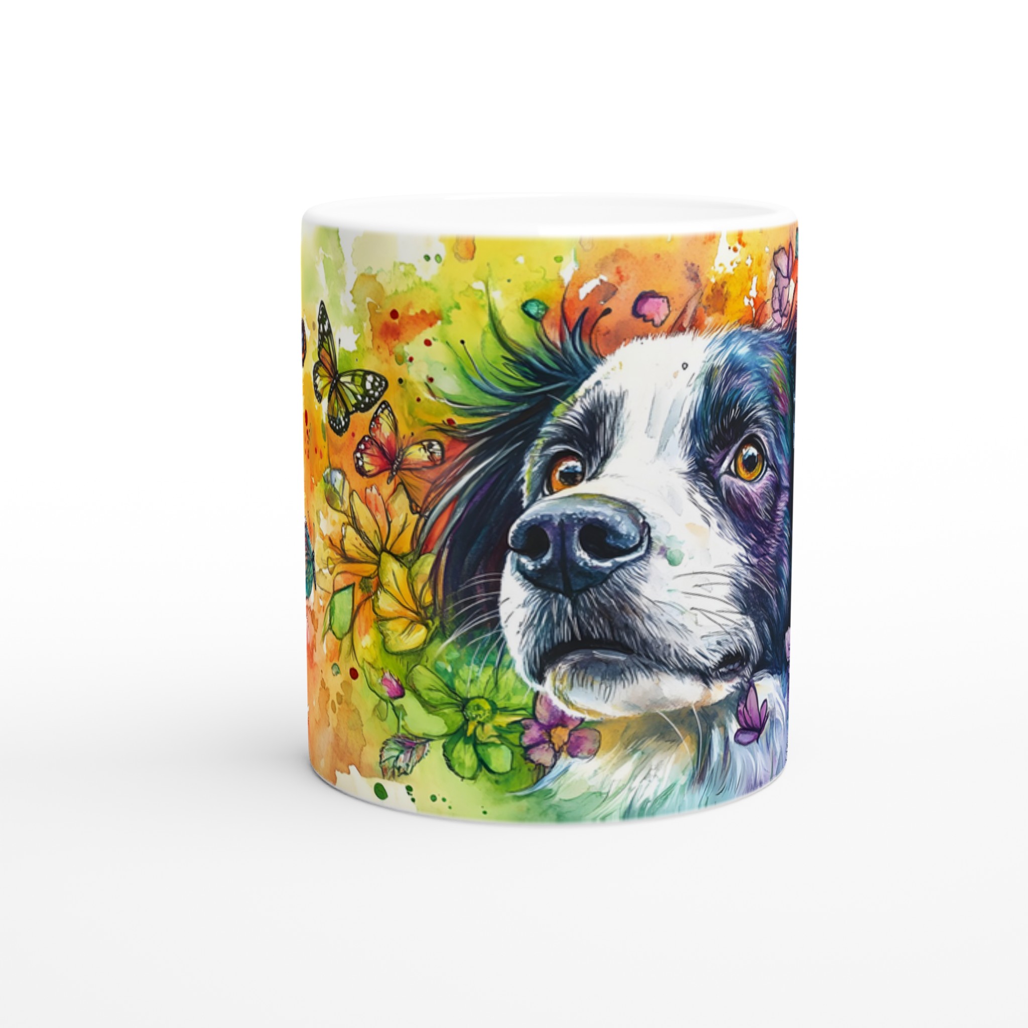 Vakna upp med ett leende varje morgon med vår färgsprakande keramiska mugg, prydd med en livfull akvarellillustration av en älskvärd Border Collie omgiven av fjärilar och blommor. Denna unika design, med sin rika palett av gul, orange, grön och lila, fångar glädjen och charmen hos din fyrbenta vän, vilket gör varje klunk till en liten fest. Perfekt för alla djurälskare som vill addera en touch av konstnärlig glädje till sin vardag.