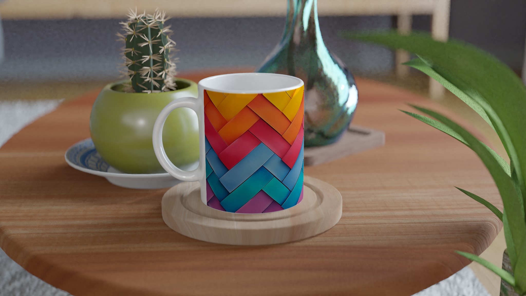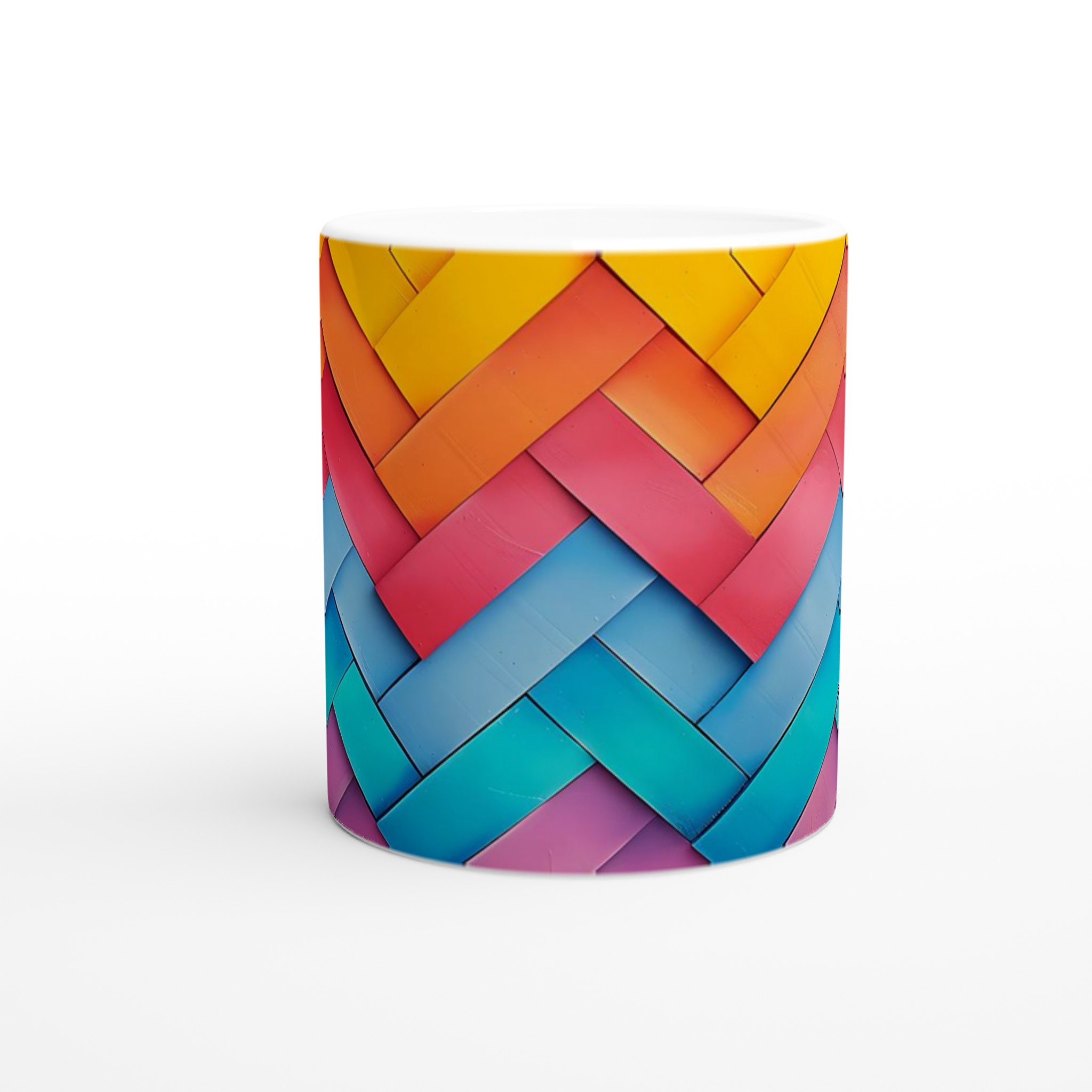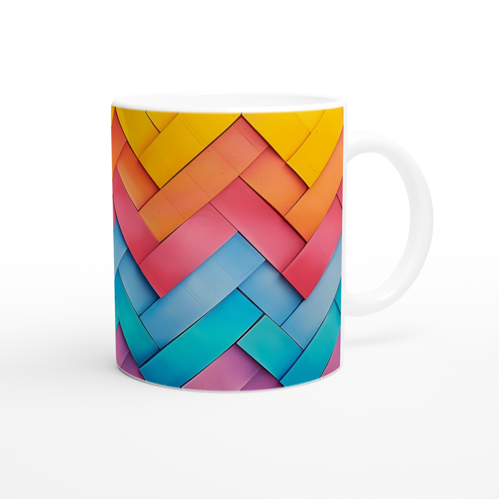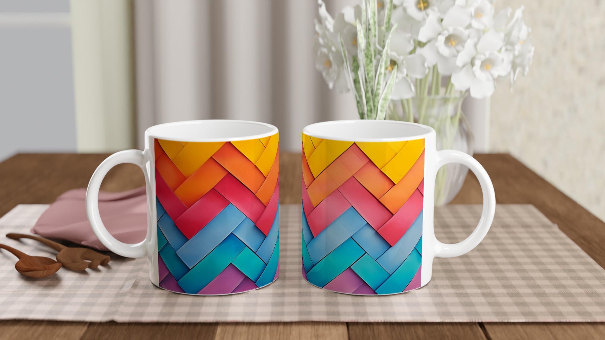 Lys upp din dag med denna färgsprakande keramikmugg, inspirerad av den glada och dynamiska chevron-designen. Med dess livfulla färger som smälter samman i en harmonisk gradient, är denna mugg en perfekt energiboost för morgonkaffet, en värmande kopp te eller en härlig varm choklad. Varje klunk blir en fest för sinnena, och den blanka ytan får ditt valda tryck att framträda klart och färgstarkt.