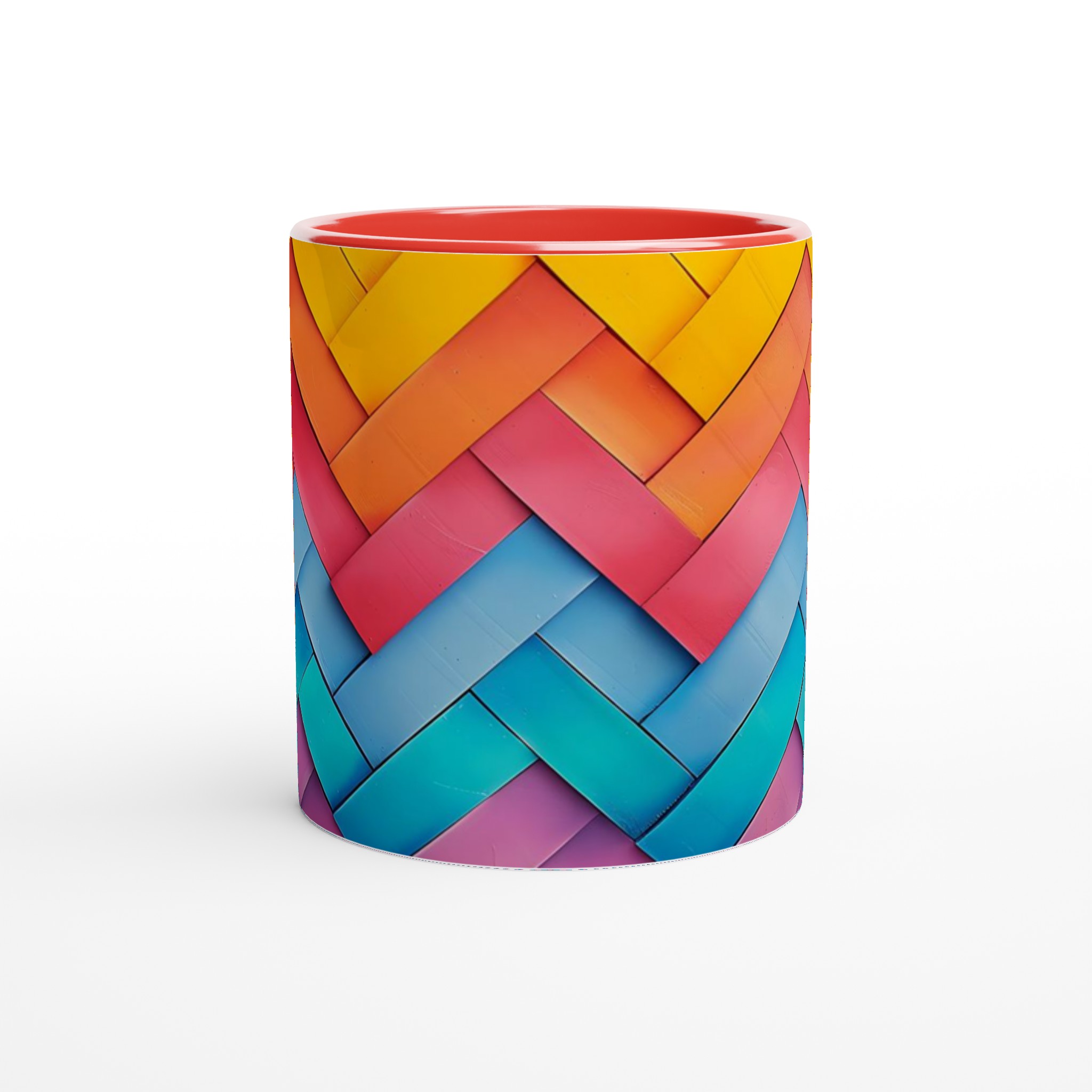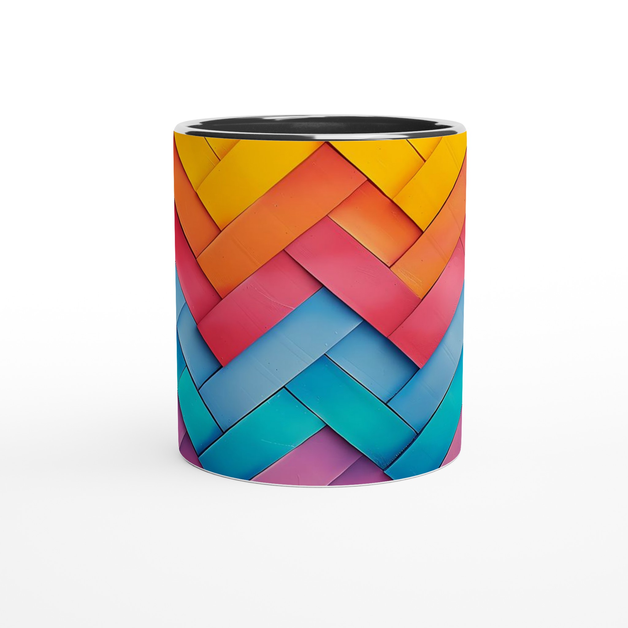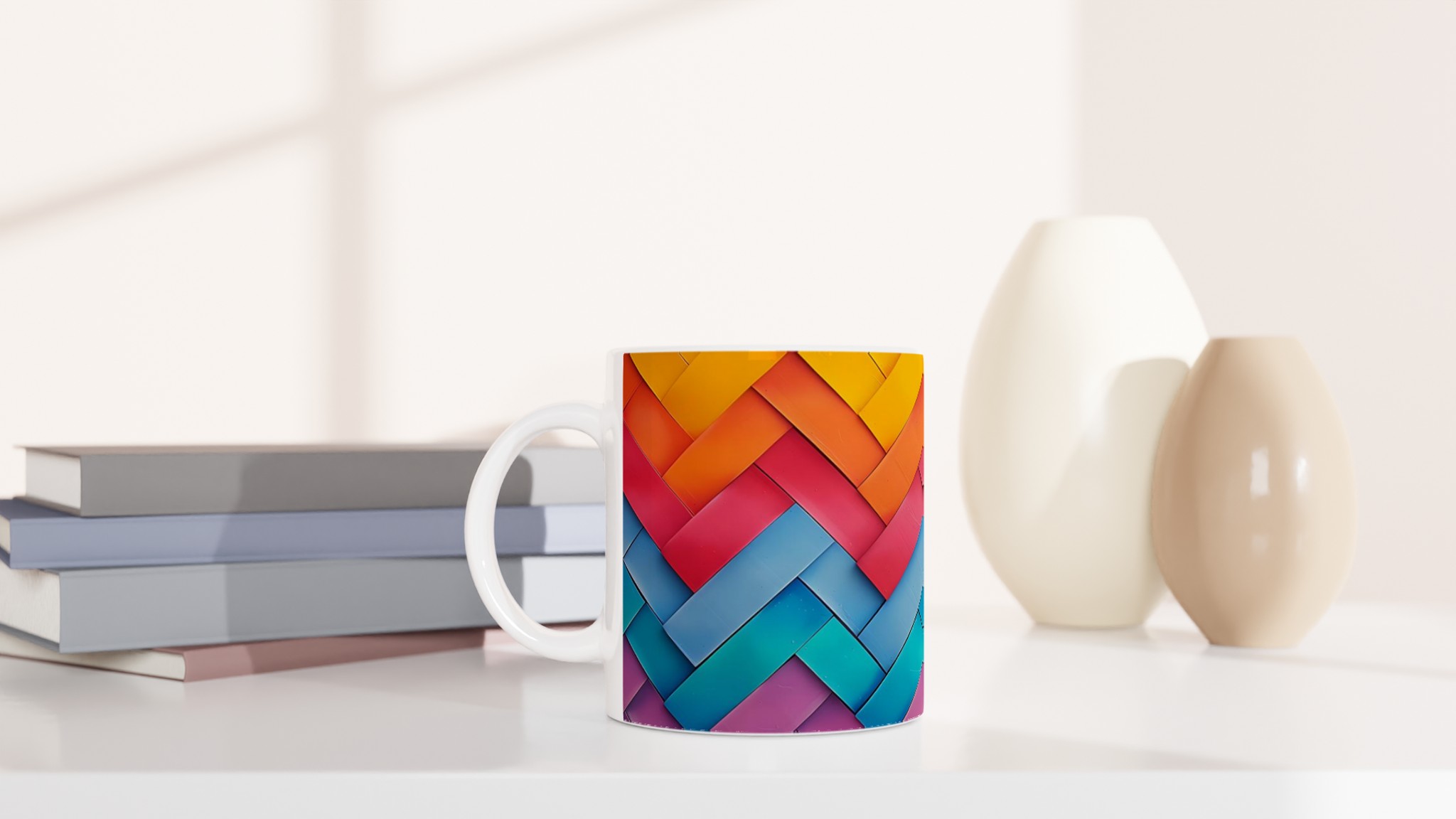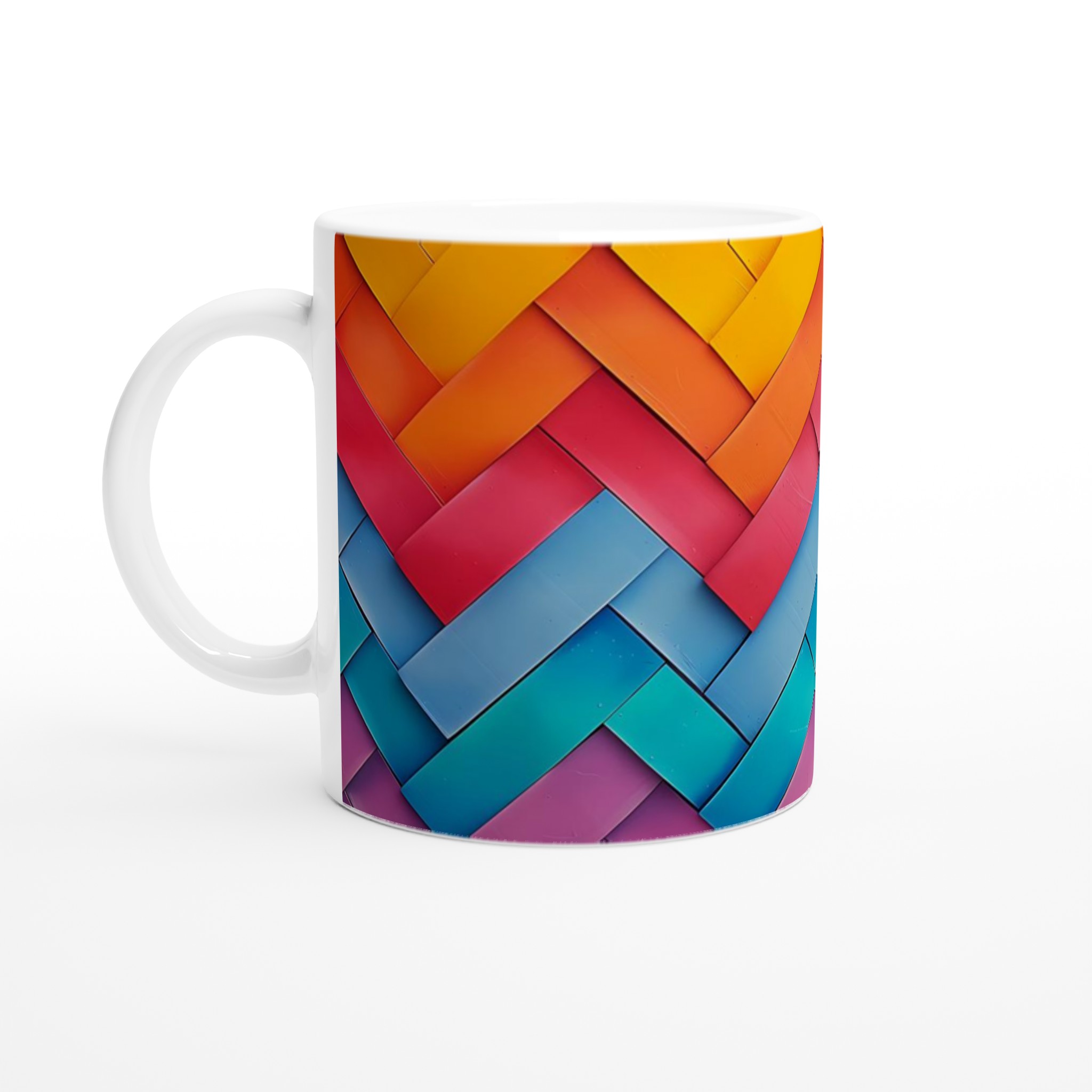 Lys upp din dag med denna färgsprakande keramikmugg, inspirerad av den glada och dynamiska chevron-designen. Med dess livfulla färger som smälter samman i en harmonisk gradient, är denna mugg en perfekt energiboost för morgonkaffet, en värmande kopp te eller en härlig varm choklad. Varje klunk blir en fest för sinnena, och den blanka ytan får ditt valda tryck att framträda klart och färgstarkt.