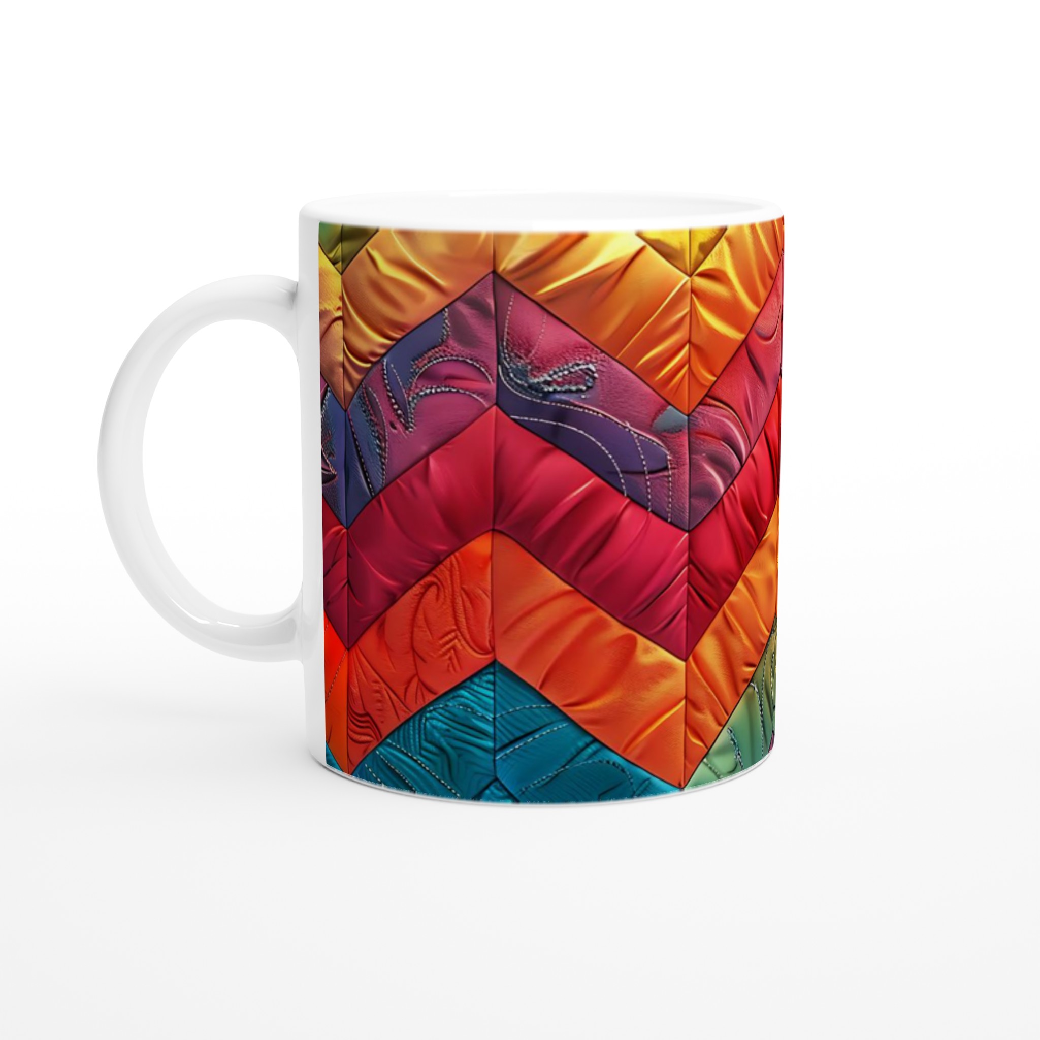 Inspirerad av den livfulla paletten av färgstarka textilier och den dynamiska chevronmönstret, är denna mugg mer än bara en dryckesbehållare; den är en inbjudan att omfamna glädje och stil. Den blanka ytan ger ett skarpt och levande tryck som verkligen sticker ut, oavsett om det är en personlig design, ett roligt citat eller en present till någon du tycker om.