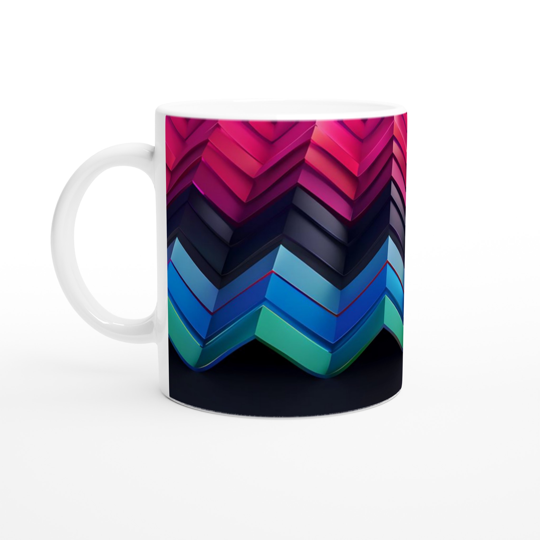 Inspirerad av den livfulla regnbågen av chevronmönster, ger denna mugg en explosion av färg och modern design till din dryckesupplevelse. Den blanka vita ytan ger ett skarpt och levande tryck som verkligen sticker ut, oavsett om det är en personlig design, ett roligt citat eller en present till någon du tycker om.