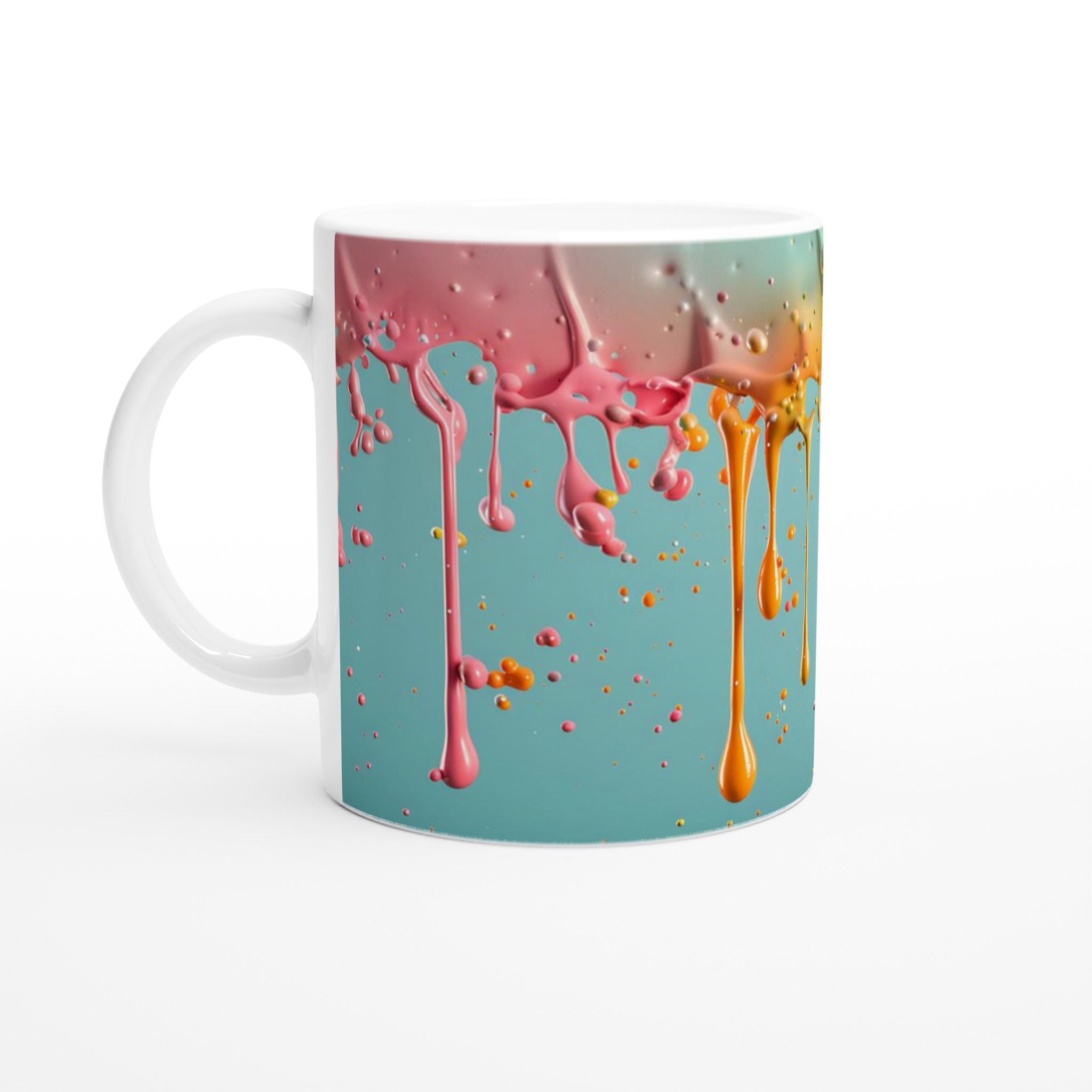 Inspirerad av lekfulla färgsplashar och en känsla av glädje, blir denna mugg mer än bara ett dryckeskärl. Den blanka vita ytan ger ett skarpt och levande tryck som verkligen sticker ut, oavsett om det är en personlig design, ett roligt citat eller en present till någon du tycker om.