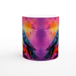 Väck dina sinnen med denna unika keramikmugg, prydd med en explosionsartad akvarellfågel som fångar ögat med sina levande färger mot en djup svart bakgrund. Varje sipp blir en konstupplevelse – perfekt för morgonkaffet, en stunds avkoppling med te eller en värmande kopp choklad. Den blanka vita ytan agerar som en perfekt duk för det dynamiska trycket, vilket gör denna mugg till en omedelbar favorit för den som uppskattar konst och färg.