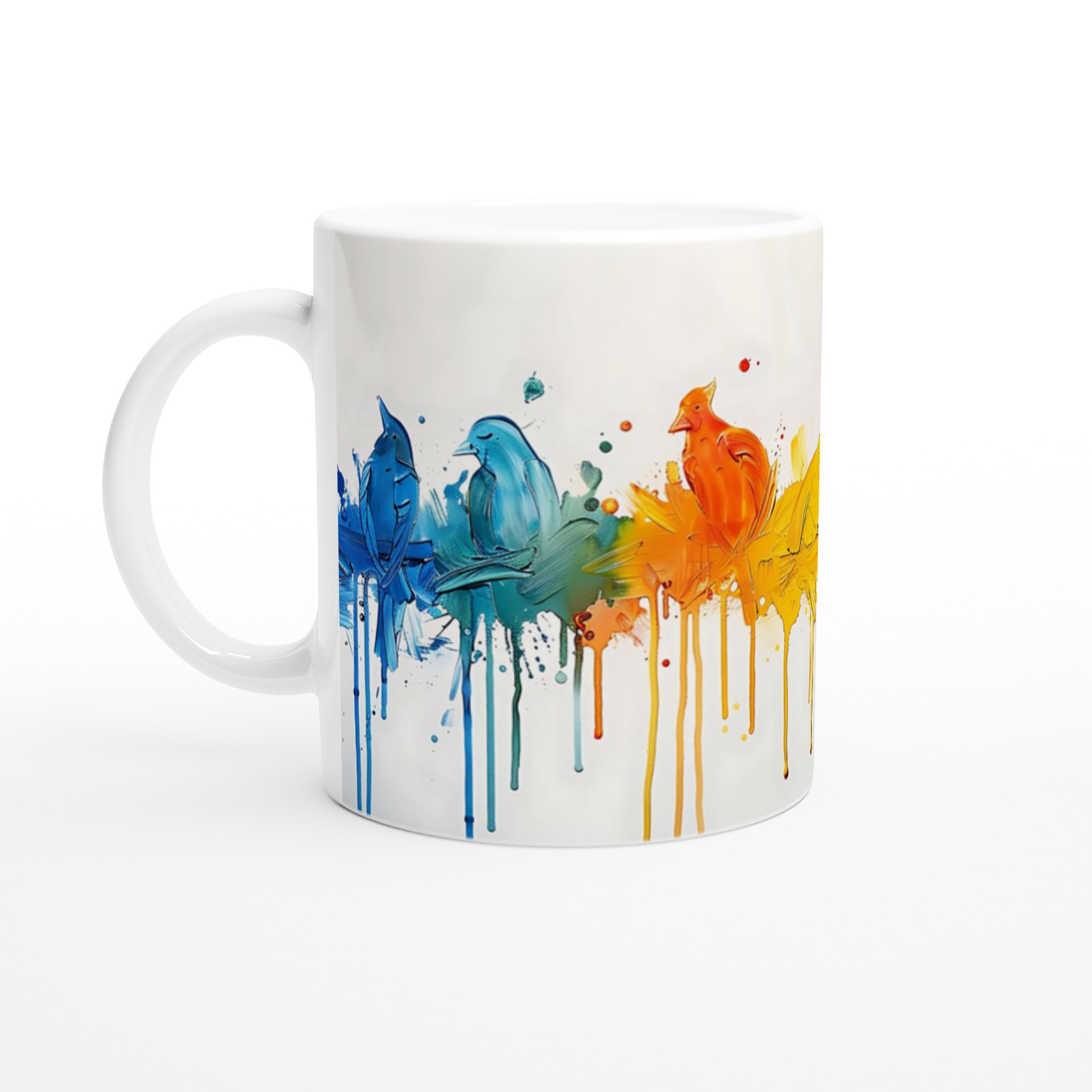Lyft varje kaffestund med vår premium keramikmugg – stilren, hållbar och skapad för att låta ditt motiv glänsa. Denna mugg är en hyllning till färg och glädje, med ett livfullt konstnärligt tryck av fåglar i en palett av blått, grönt, gult, rosa och rött, komplett med lekfulla färgdroppar. Den blanka vita ytan ger ett skarpt och levande tryck som verkligen sticker ut, oavsett om det är en personlig design, ett roligt citat eller en present till någon du tycker om.