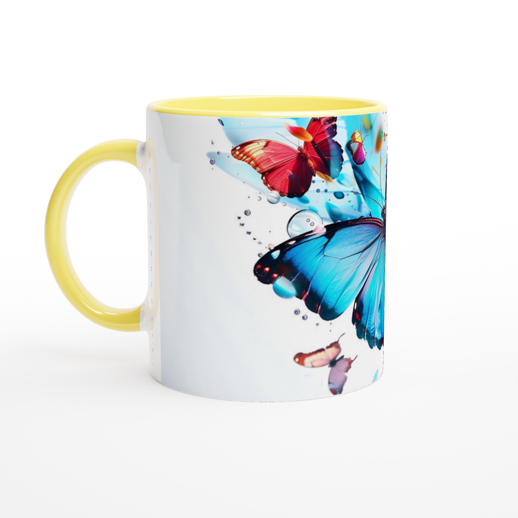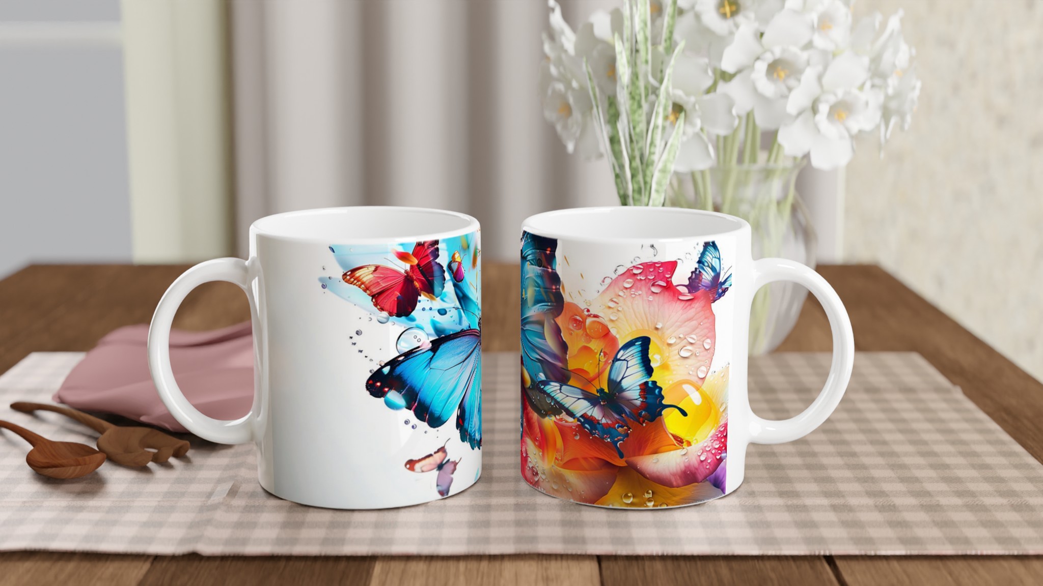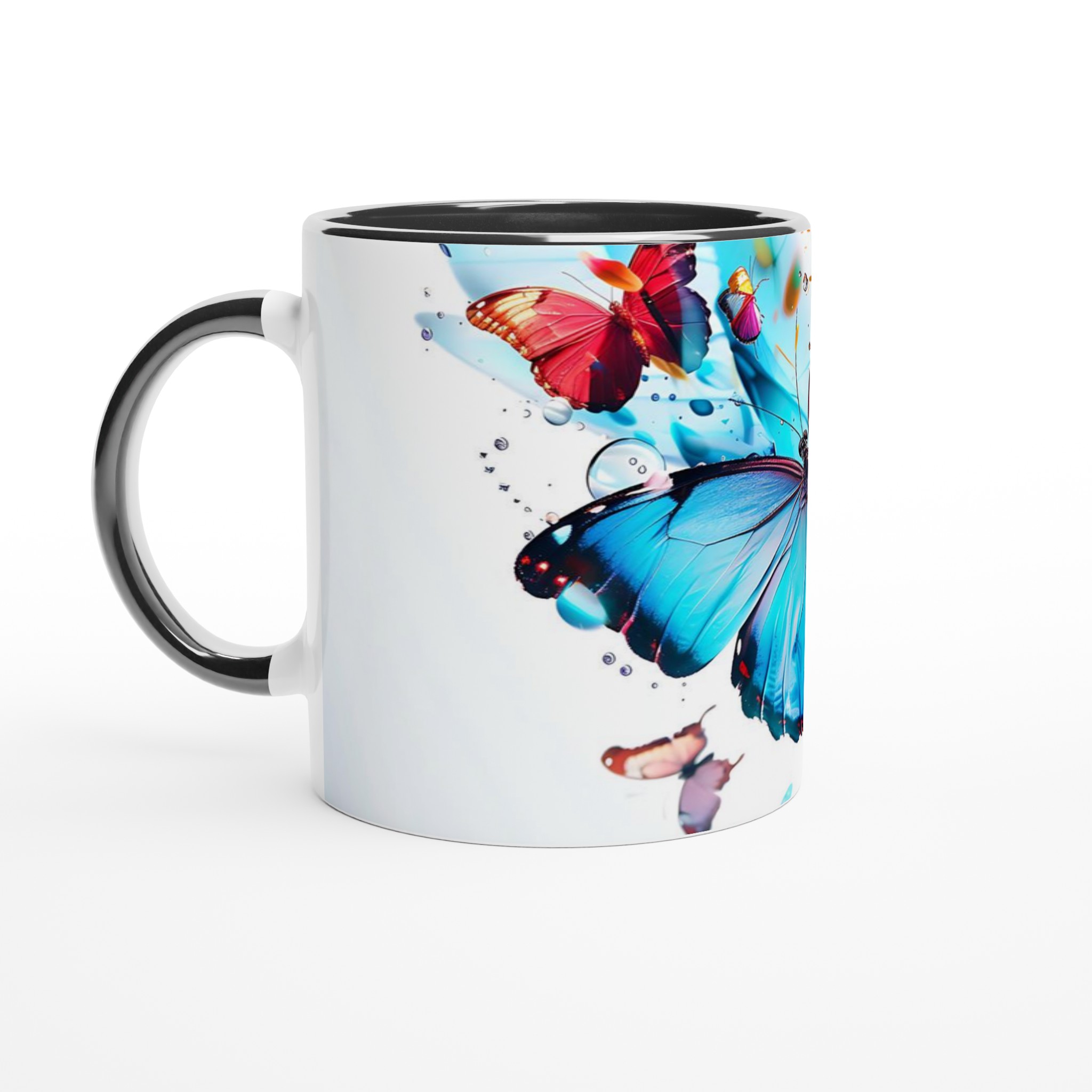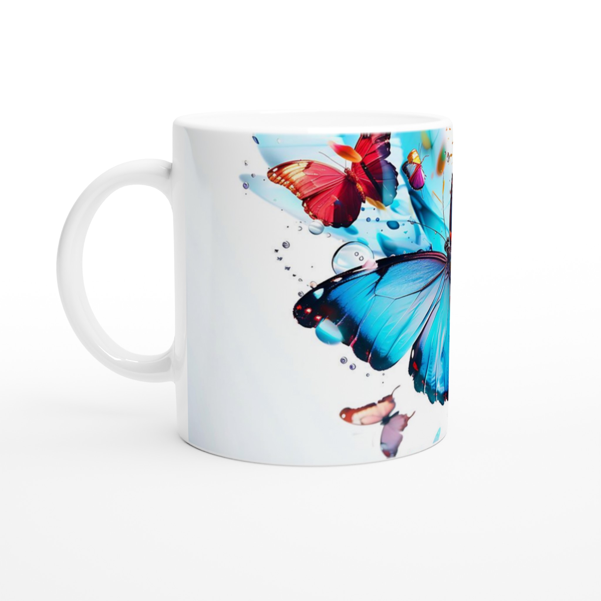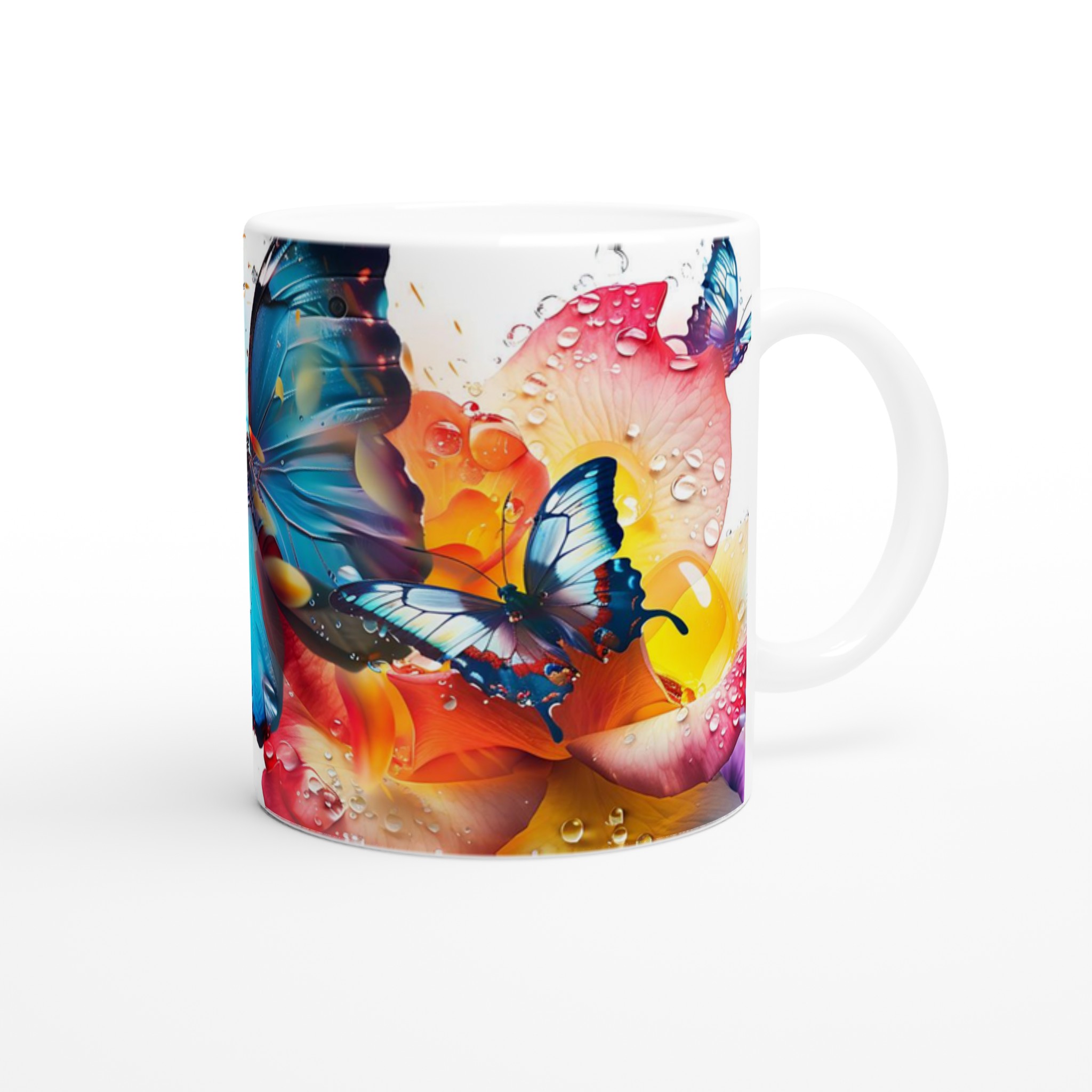 Låt din morgonkaffemugg blomma ut i full prakt med vår Färgsprakande Fjärilsmugg. Inspirerad av bilden, där levande fjärilar dansar över daggfriska blomblad i en explosion av akvarellblått, rosarött och soligt gult, är denna mugg designad för att bringa glädje till varje klunk. Den blir snabbt en vardagsfavorit, perfekt för ditt morgonkaffe, kvällens varma choklad eller när du bara vill njuta av en kopp te. Den blanka vita ytan ser till att de livfulla trycken framhävs med klara och levande färger, som håller sig fina även efter många turer i mikron och diskmaskinen.