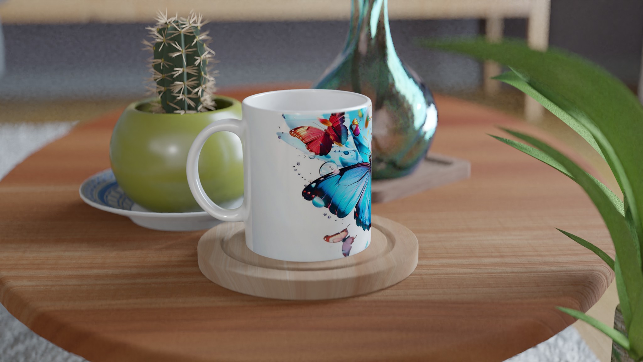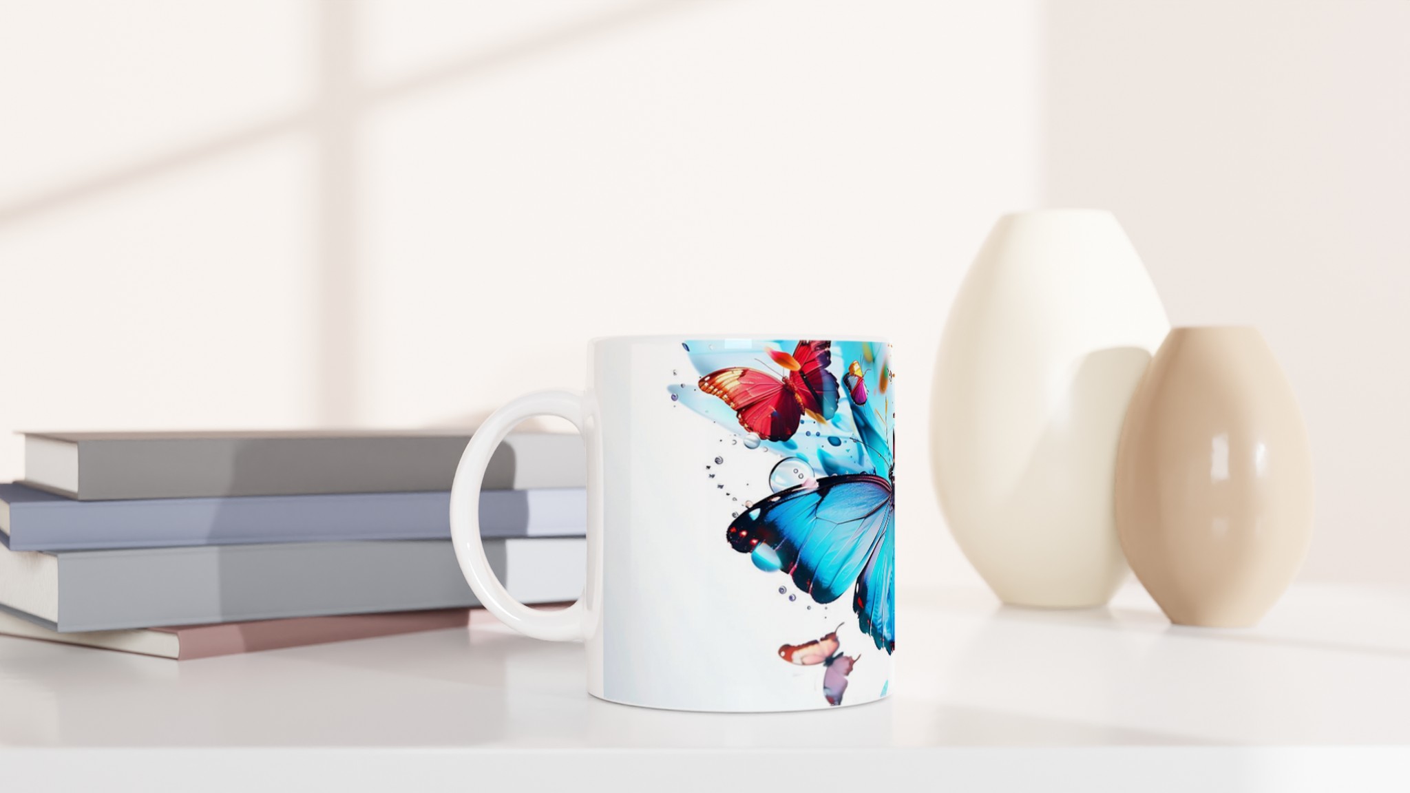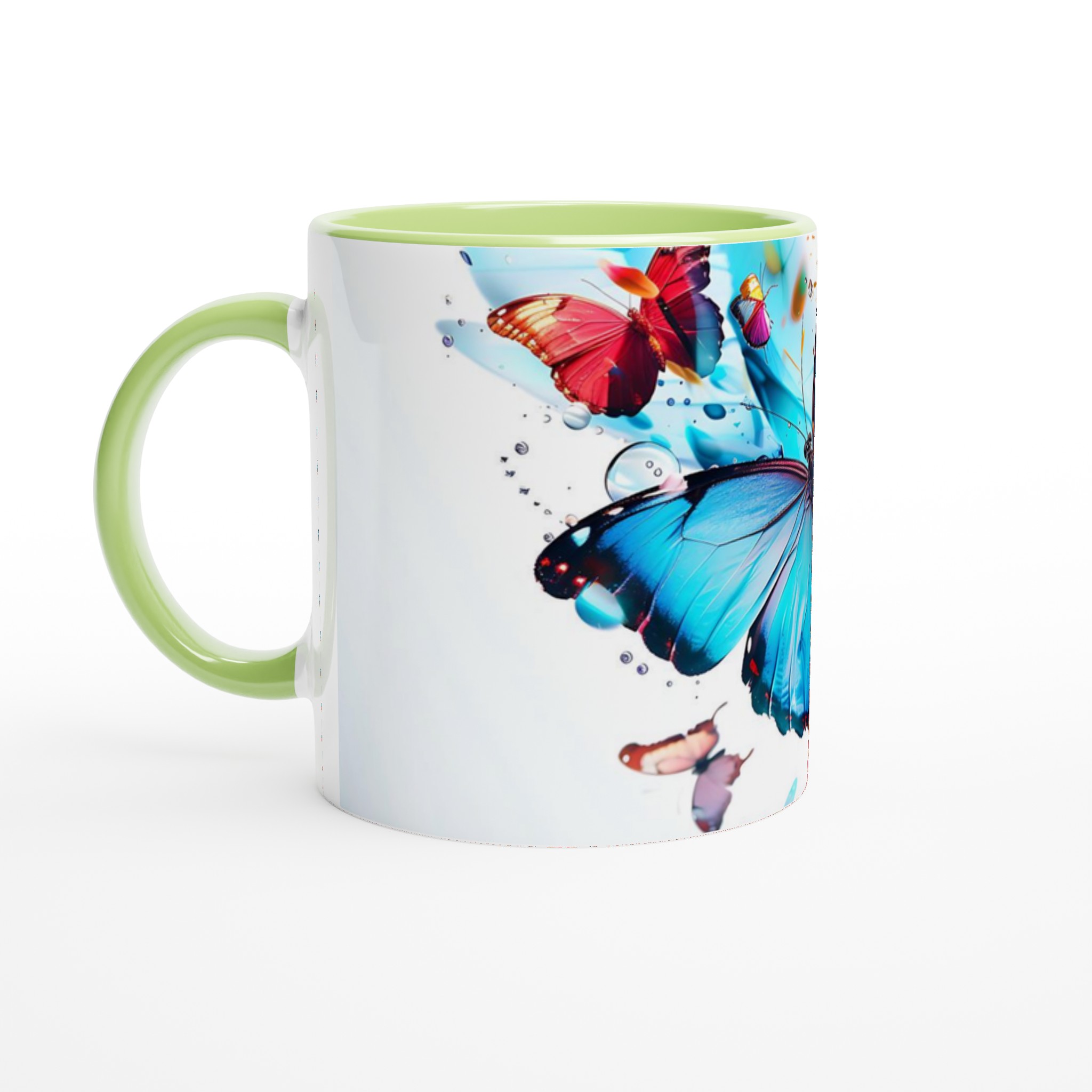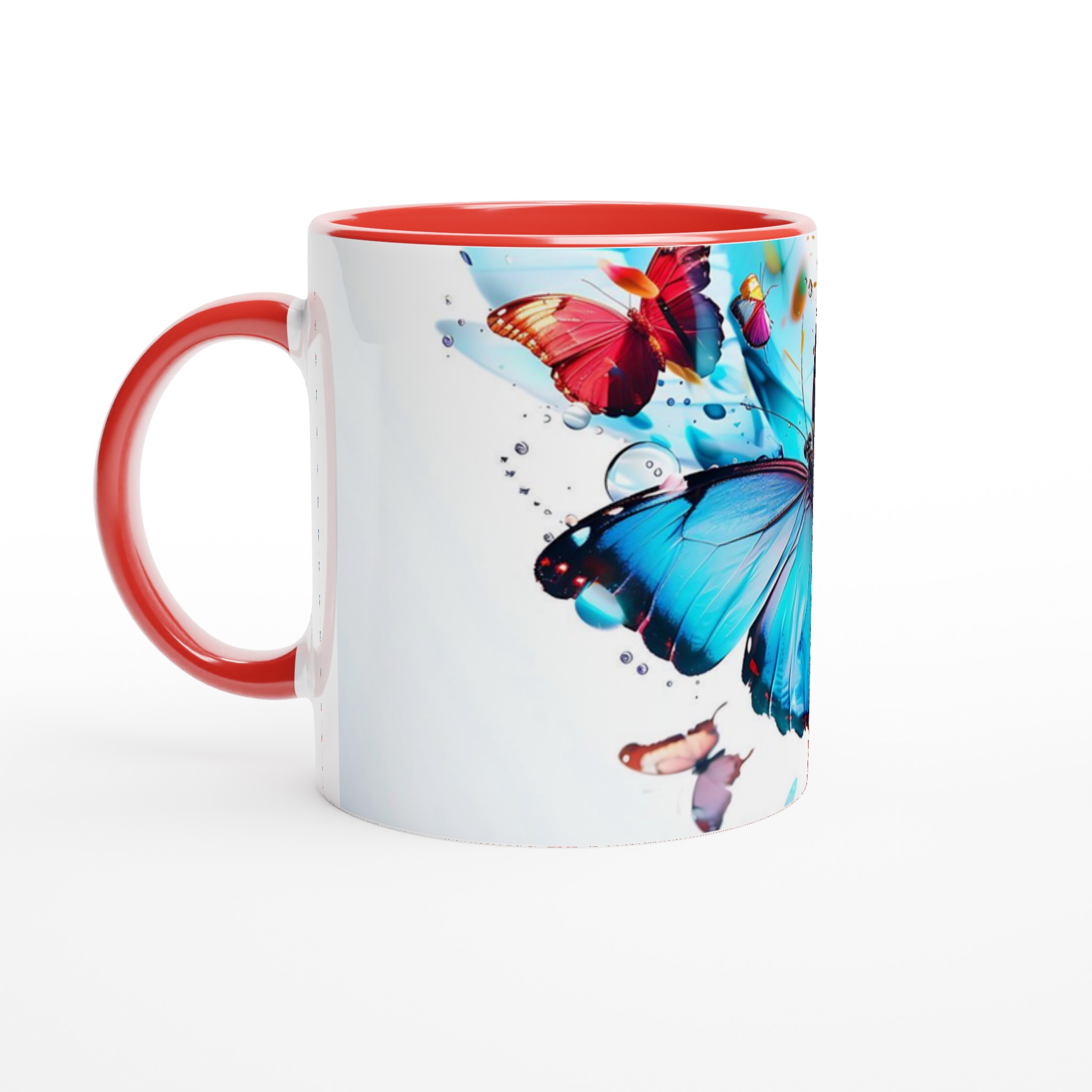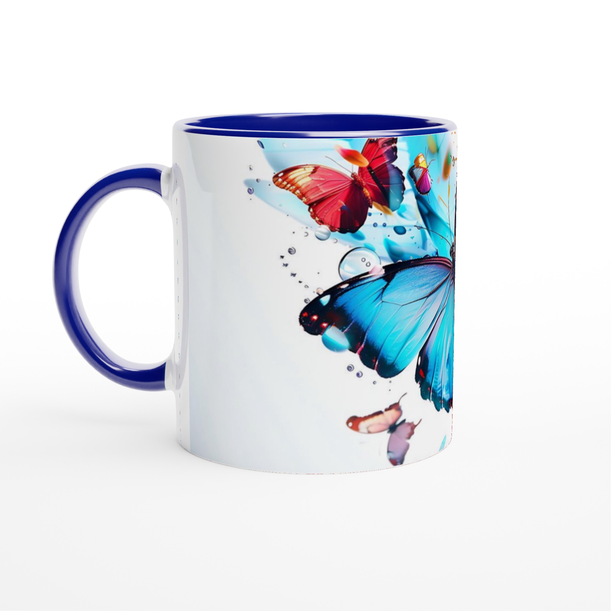 Låt din morgonkaffemugg blomma ut i full prakt med vår Färgsprakande Fjärilsmugg. Inspirerad av bilden, där levande fjärilar dansar över daggfriska blomblad i en explosion av akvarellblått, rosarött och soligt gult, är denna mugg designad för att bringa glädje till varje klunk. Den blir snabbt en vardagsfavorit, perfekt för ditt morgonkaffe, kvällens varma choklad eller när du bara vill njuta av en kopp te. Den blanka vita ytan ser till att de livfulla trycken framhävs med klara och levande färger, som håller sig fina även efter många turer i mikron och diskmaskinen.
