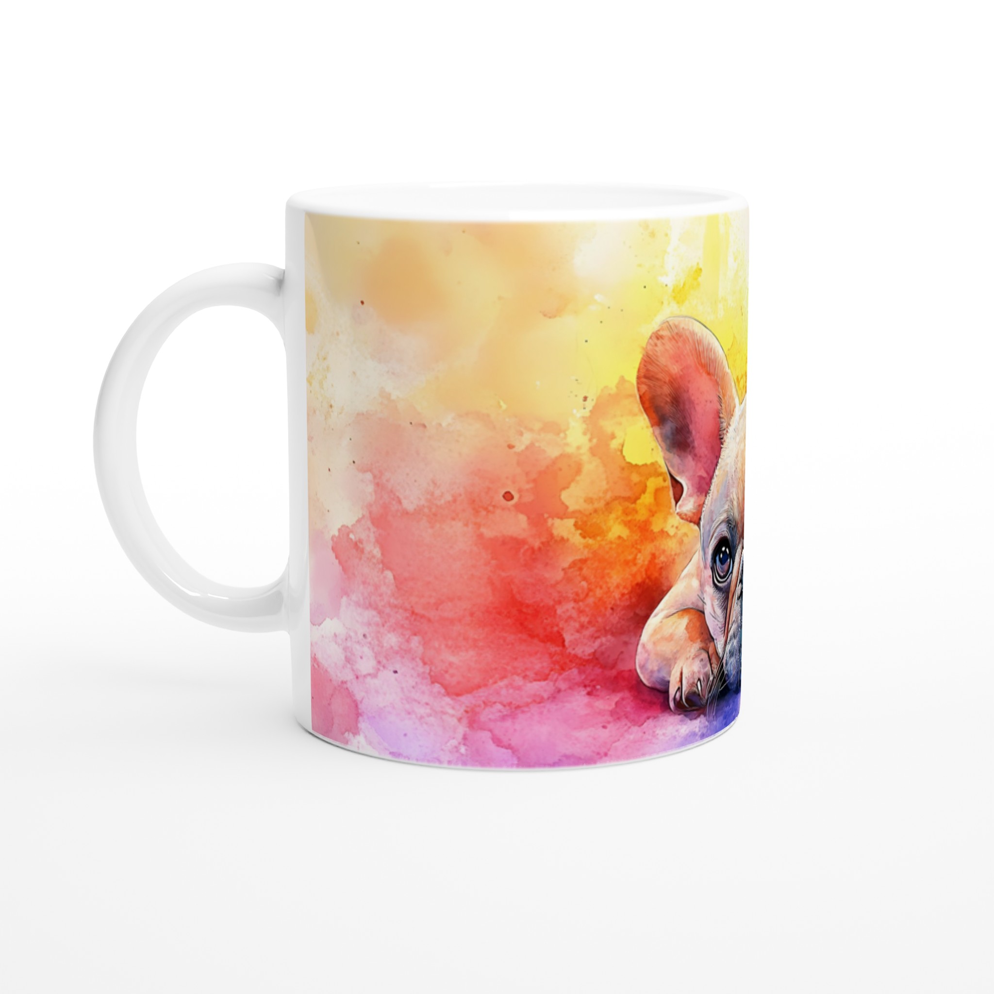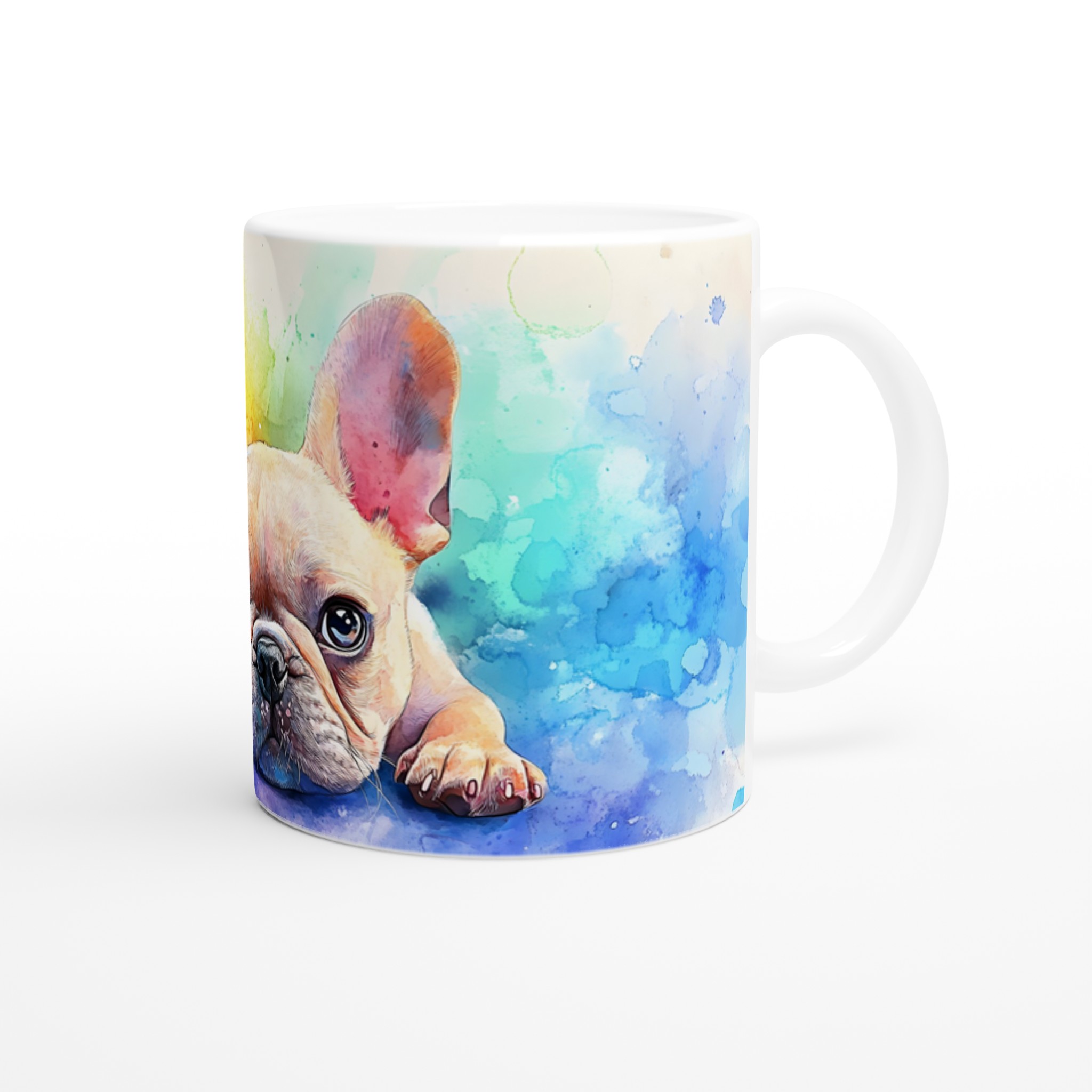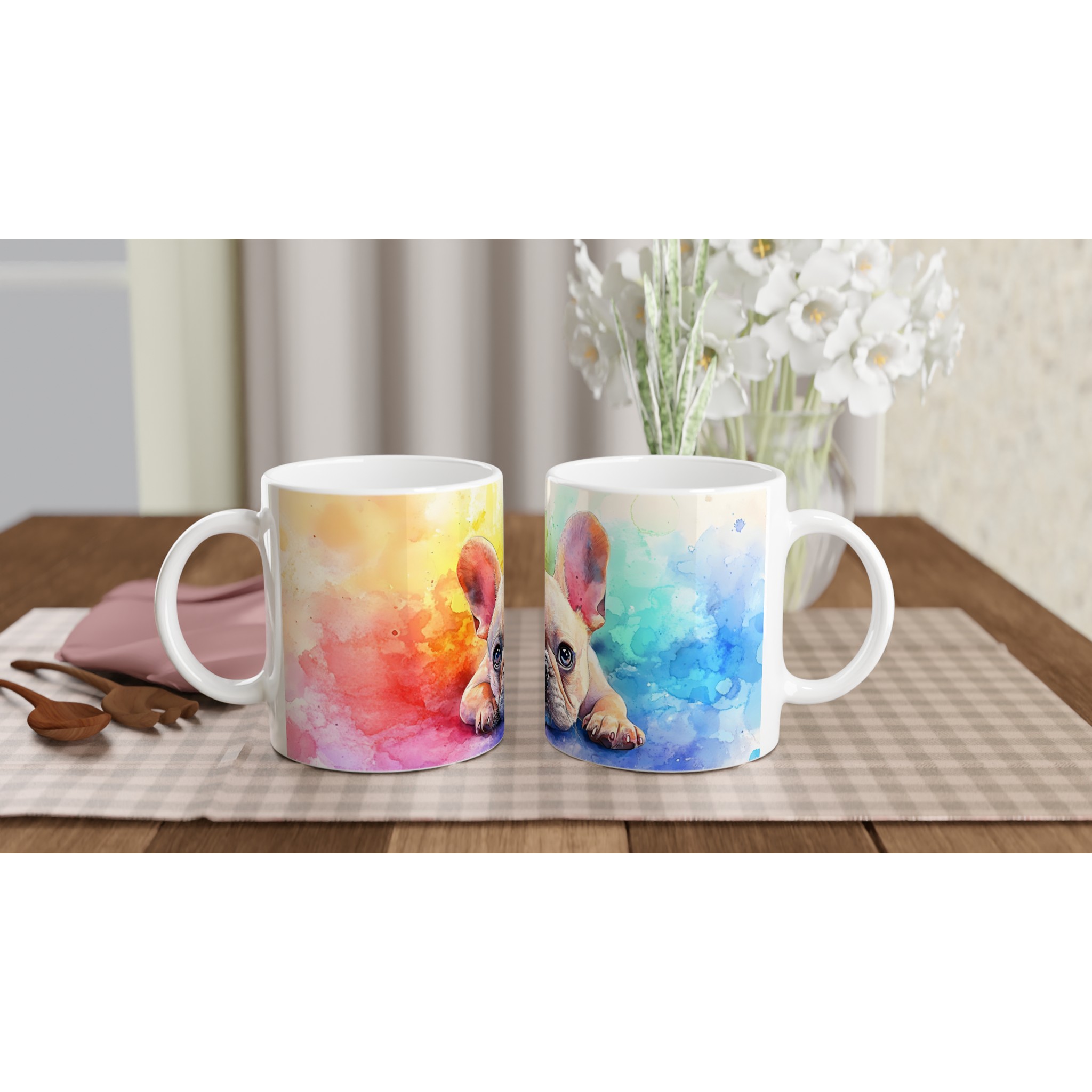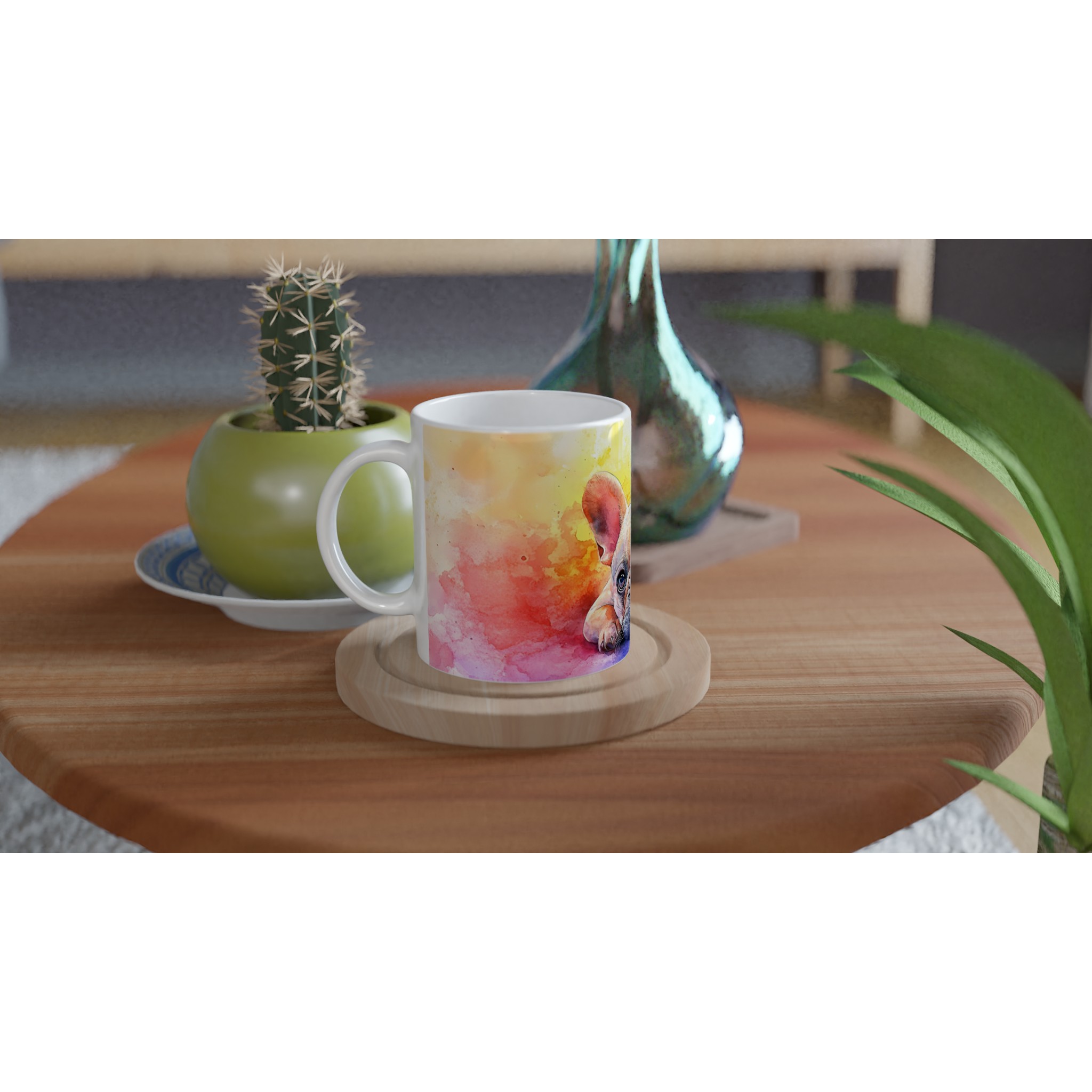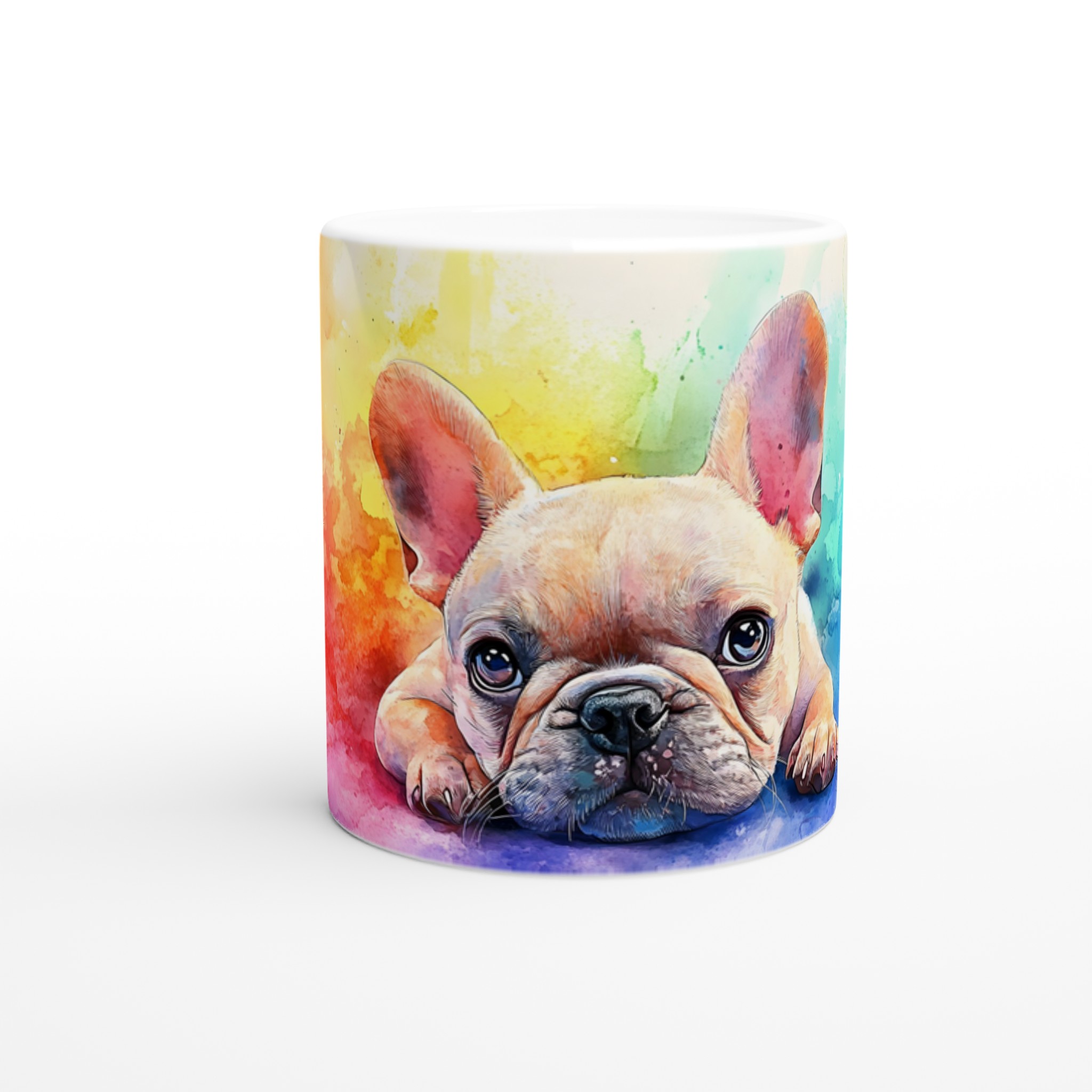 Starta dagen med ett leende eller ge bort en hjärtevärmande gåva med denna bedårande keramikmugg! Med ett charmigt akvarellporträtt av en söt fransk bulldog omgiven av livfulla, flytande färger – från mjuka gula och orange toner till djupa blå och lila nyanser – är denna mugg en riktig glädjespridare. De uttrycksfulla ögonen och den lekfulla posen fångar omedelbart hjärtat, vilket gör varje fika till en liten fest.