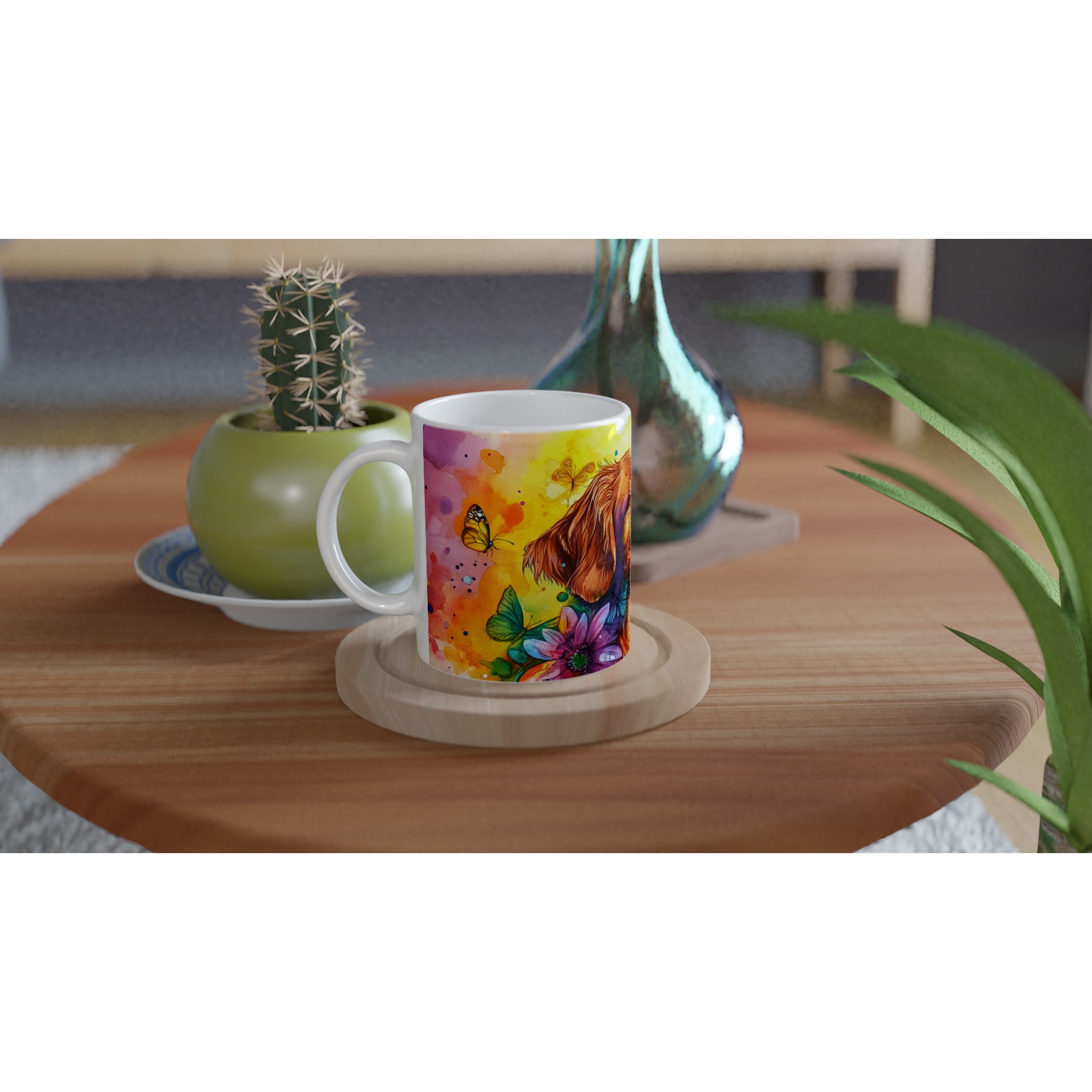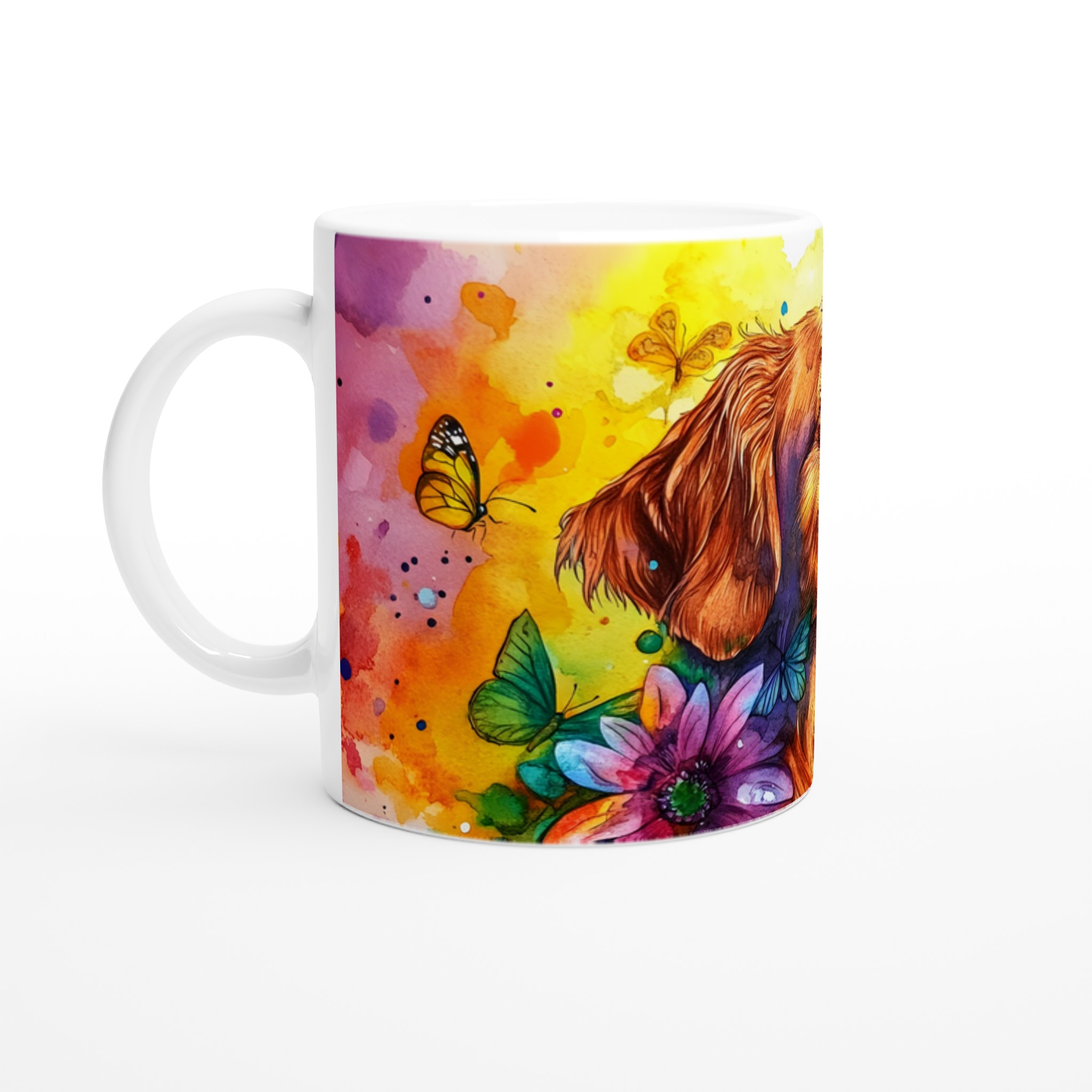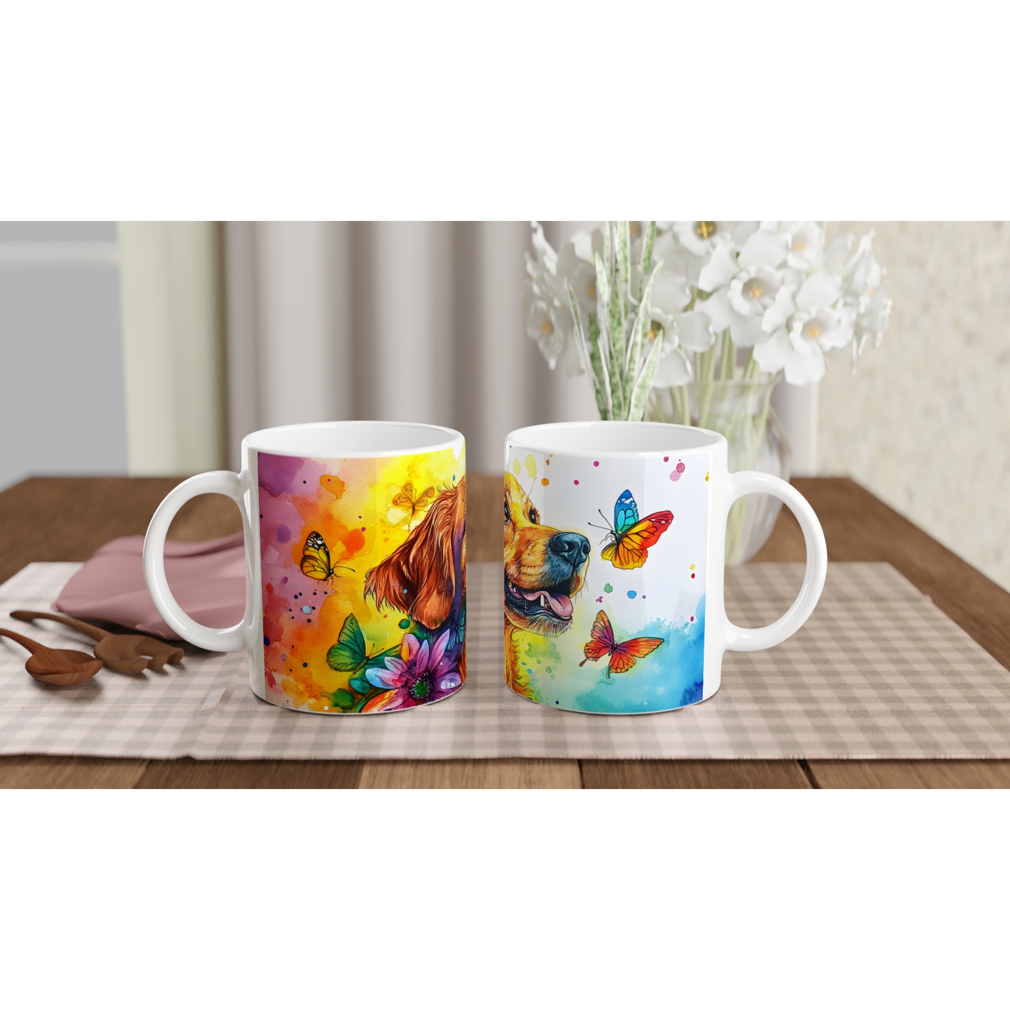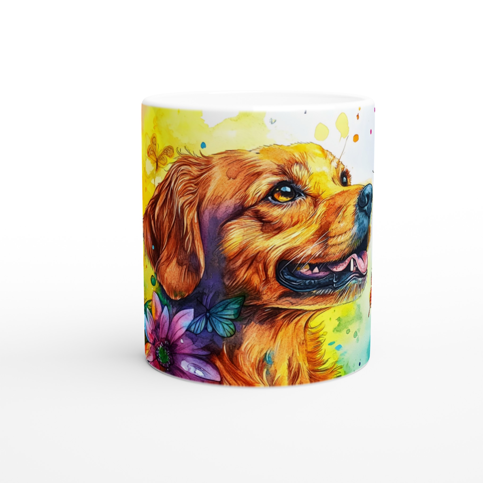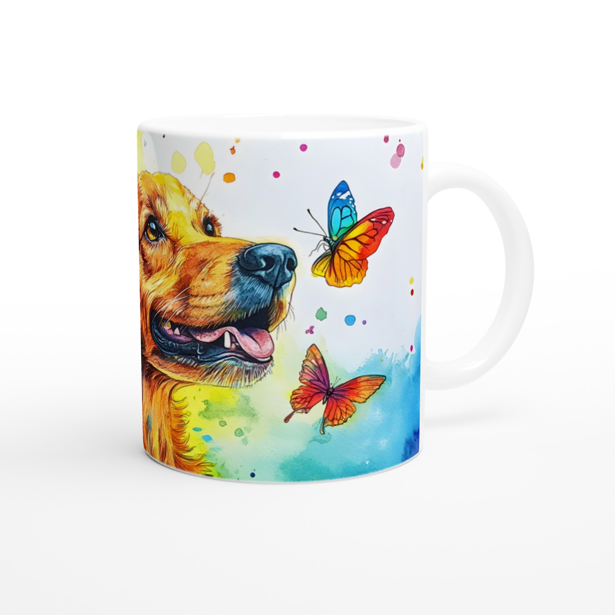 Lys upp din dag med vår underbara keramikmugg med en livfull akvarelldesign av en charmig Golden Retriever, omgiven av lekfulla fjärilar och färgglada blommor. Denna mugg är en hyllning till glädje och natur, perfekt för alla som älskar hundar och konstnärliga uttryck. Med sin varma färgpalett och drömlika estetik blir varje fikapaus en liten flykt till en blomstrande sommaräng.