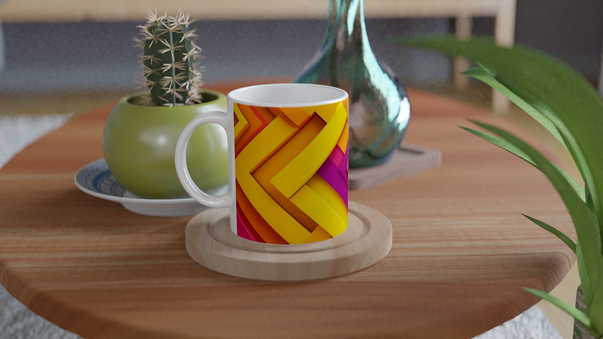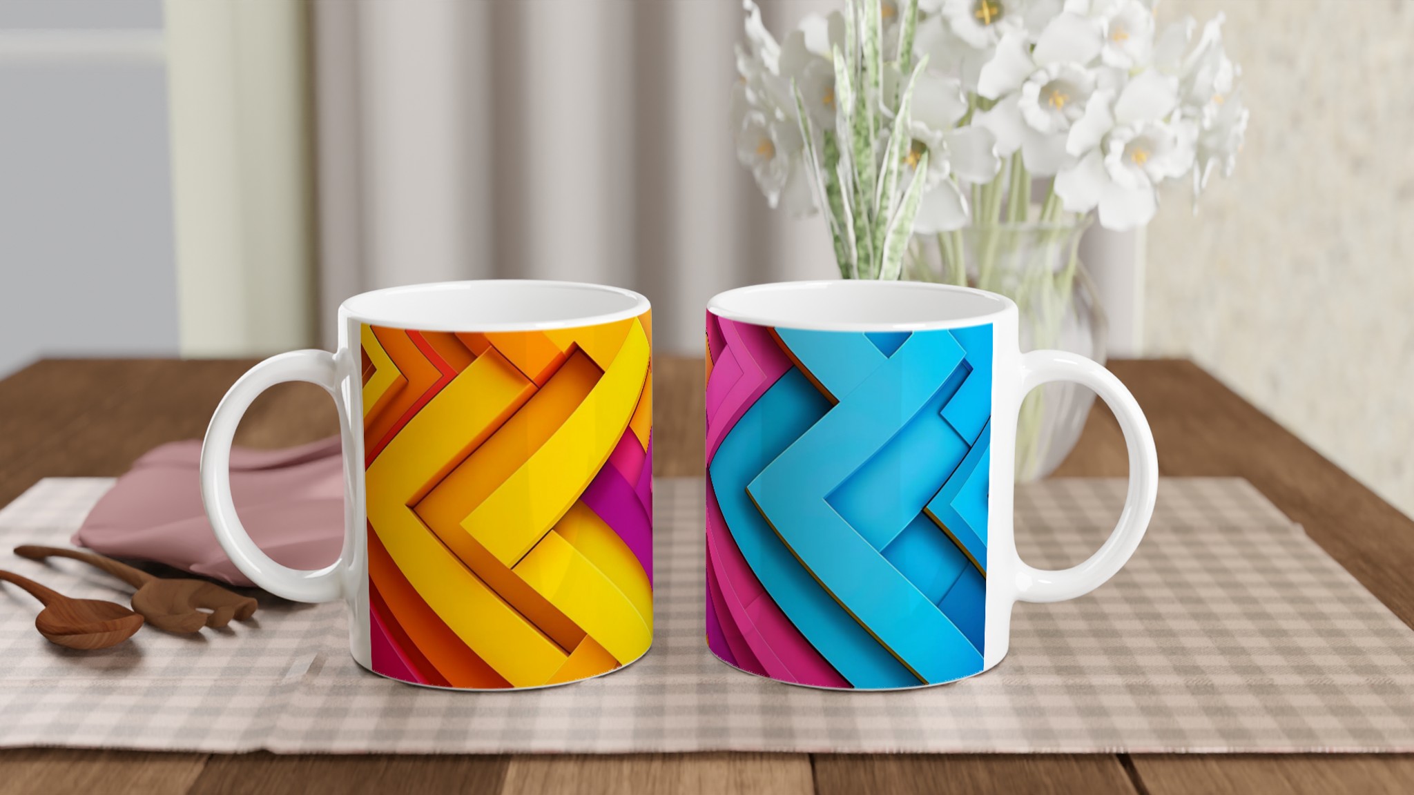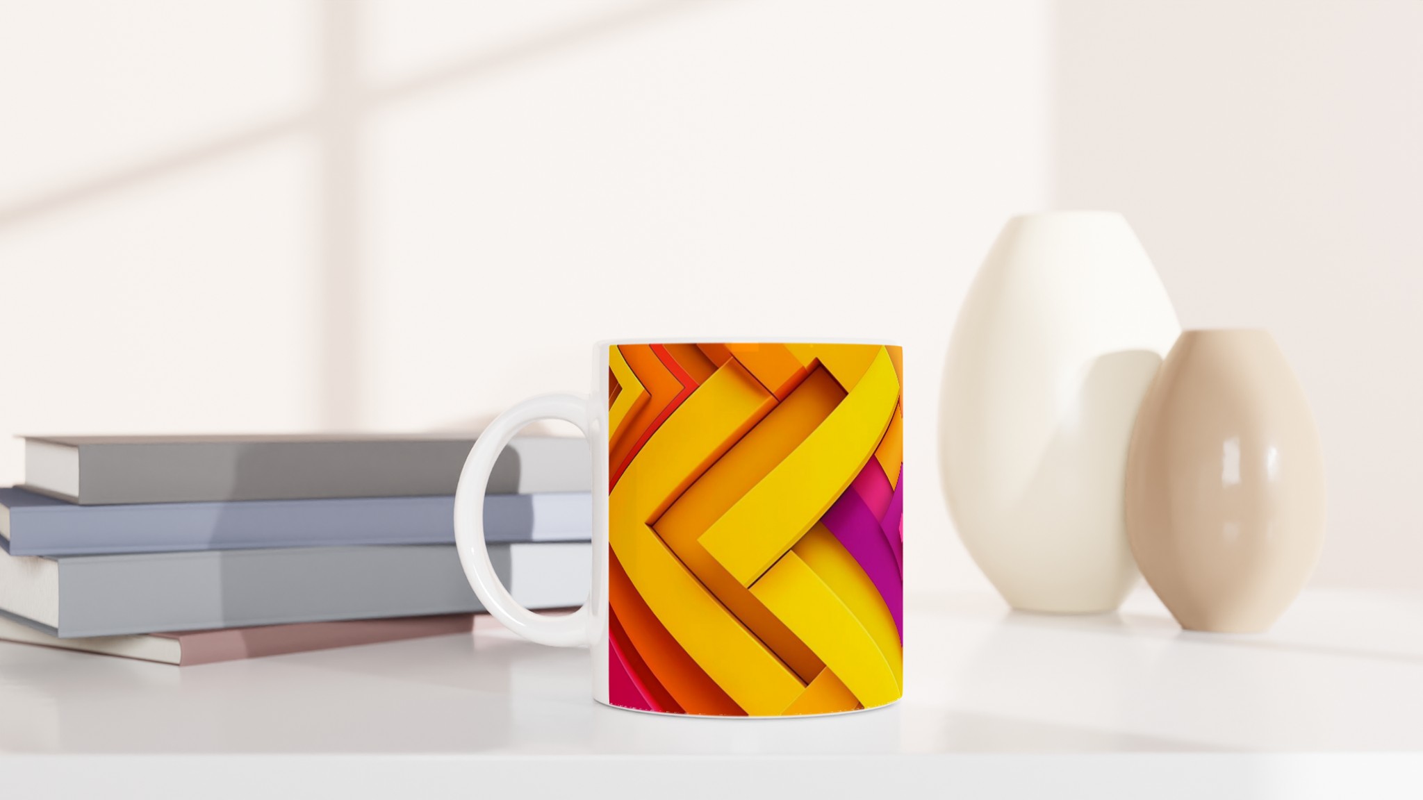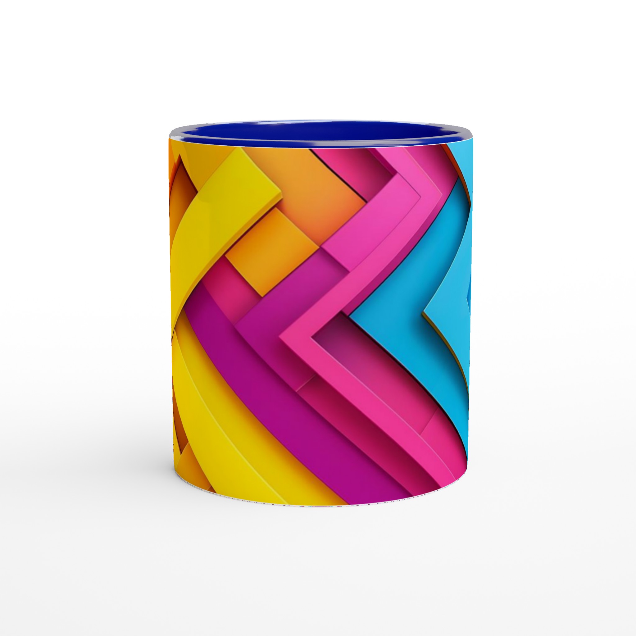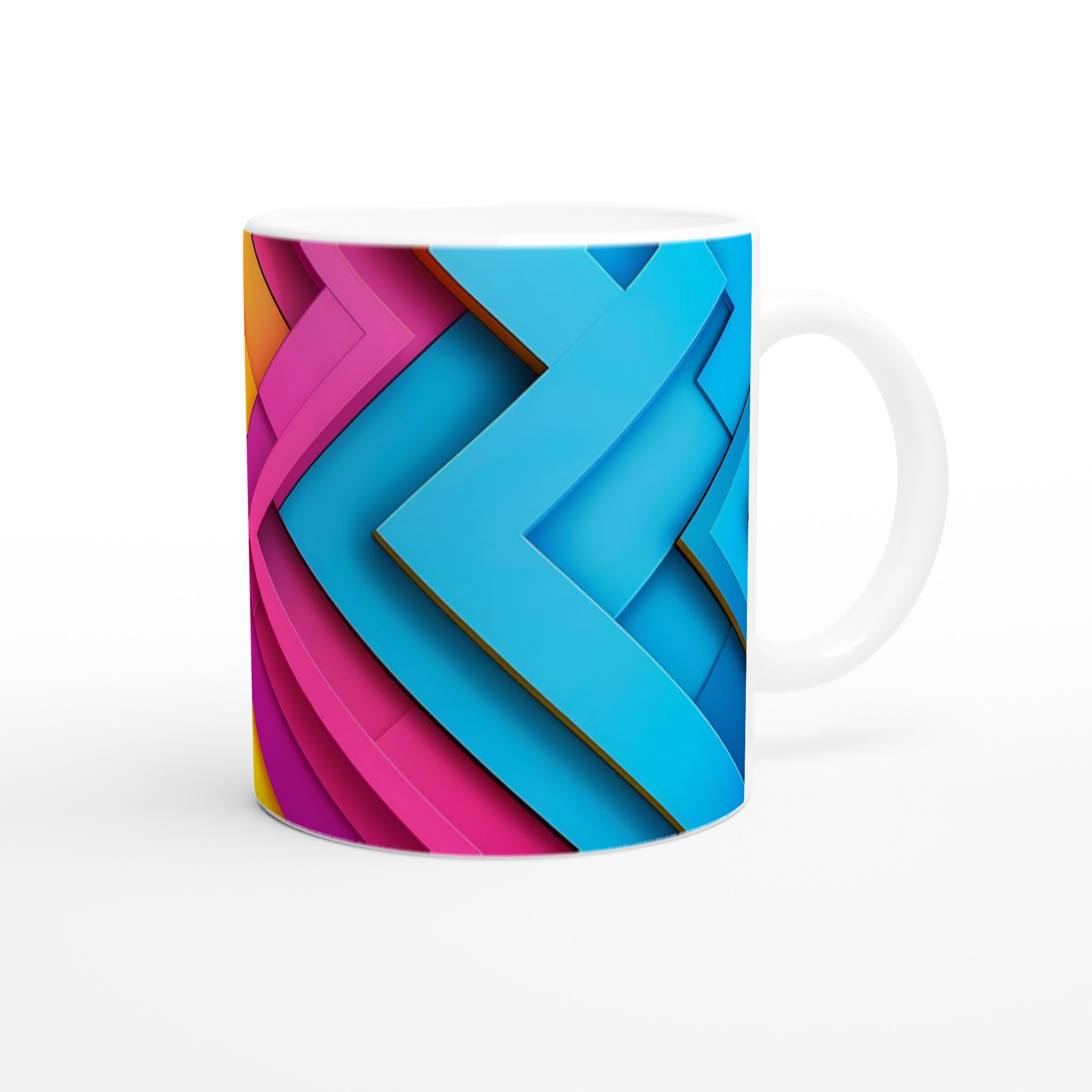 Väck dina morgnar till liv med denna iögonfallande keramikmugg, prydd med ett dynamiskt grafiskt mönster i livfulla nyanser av gult, orange, fuchsia och blått. Dess stilrena och vackra design gör den till den perfekta följeslagaren för alla dagens stunder – oavsett om det är morgonkaffet, en värmande kopp te eller en härlig varm choklad. Den blanka ytan gör att de färgstarka trycken framträder klart och tydligt, vilket gör muggen till en riktig favorit i vardagen.
