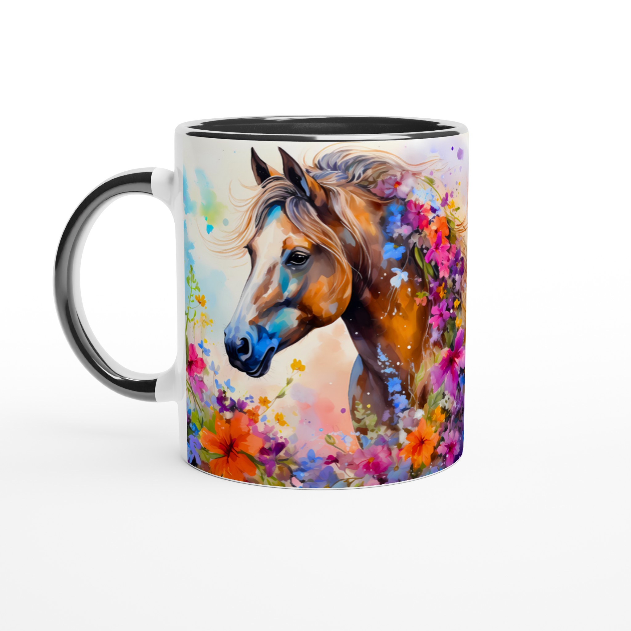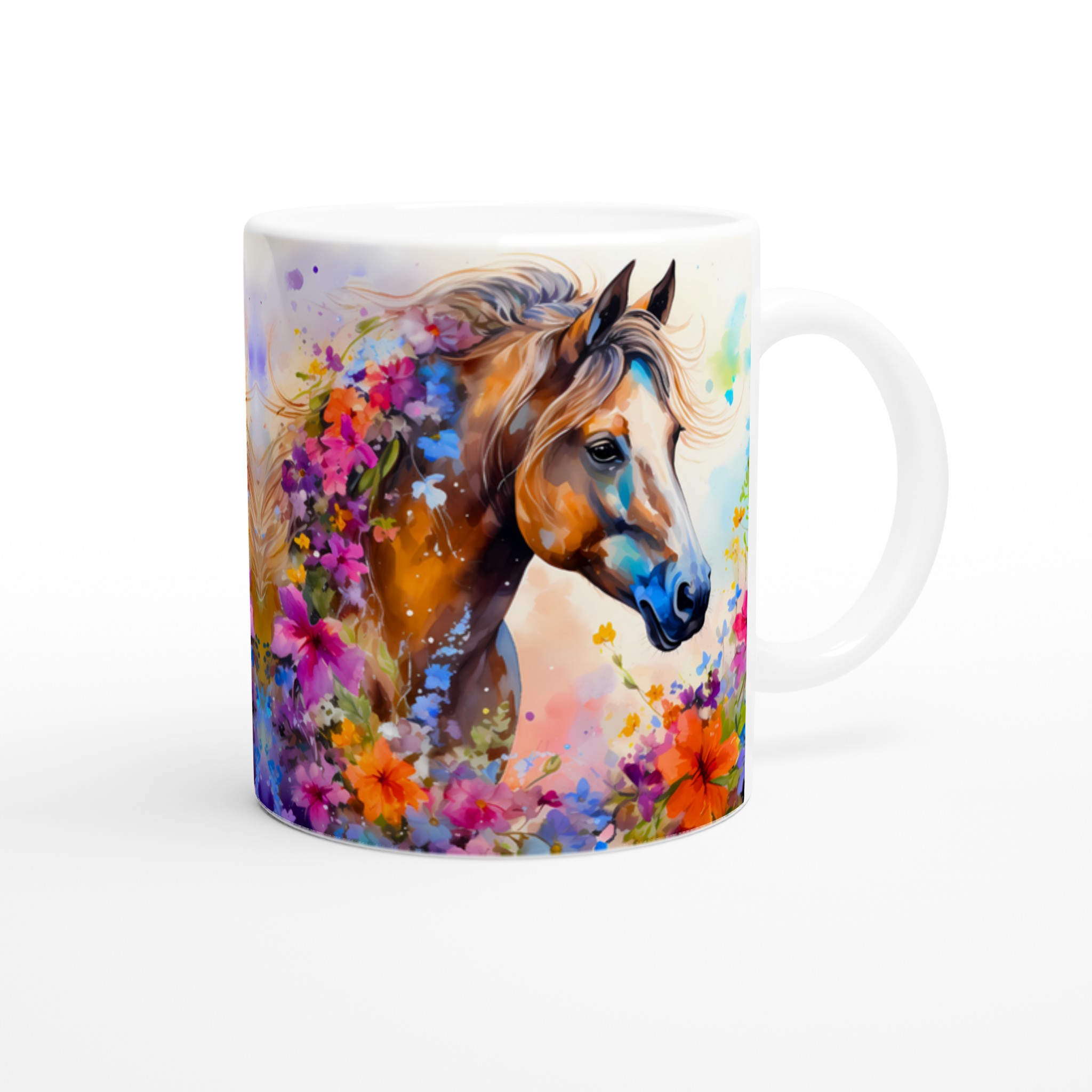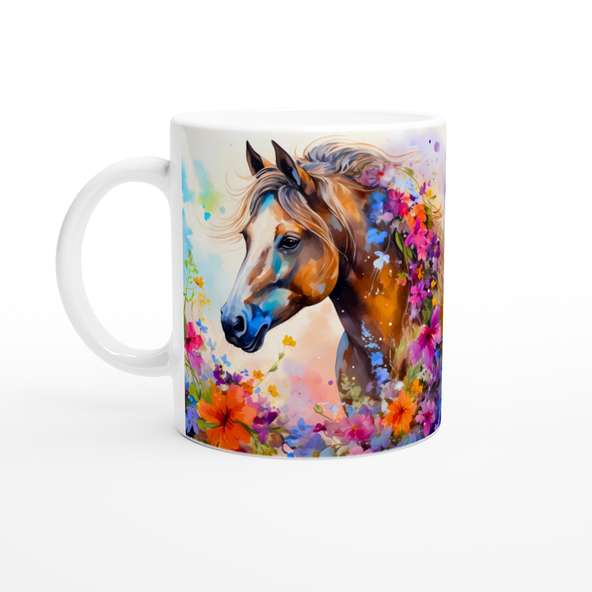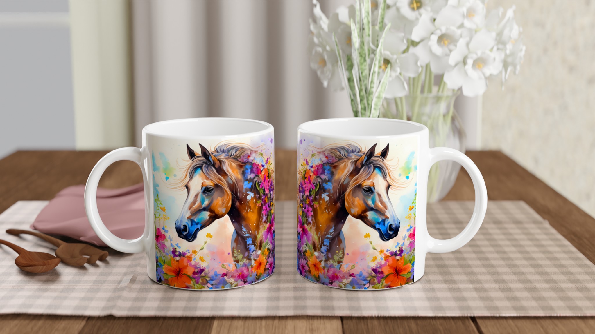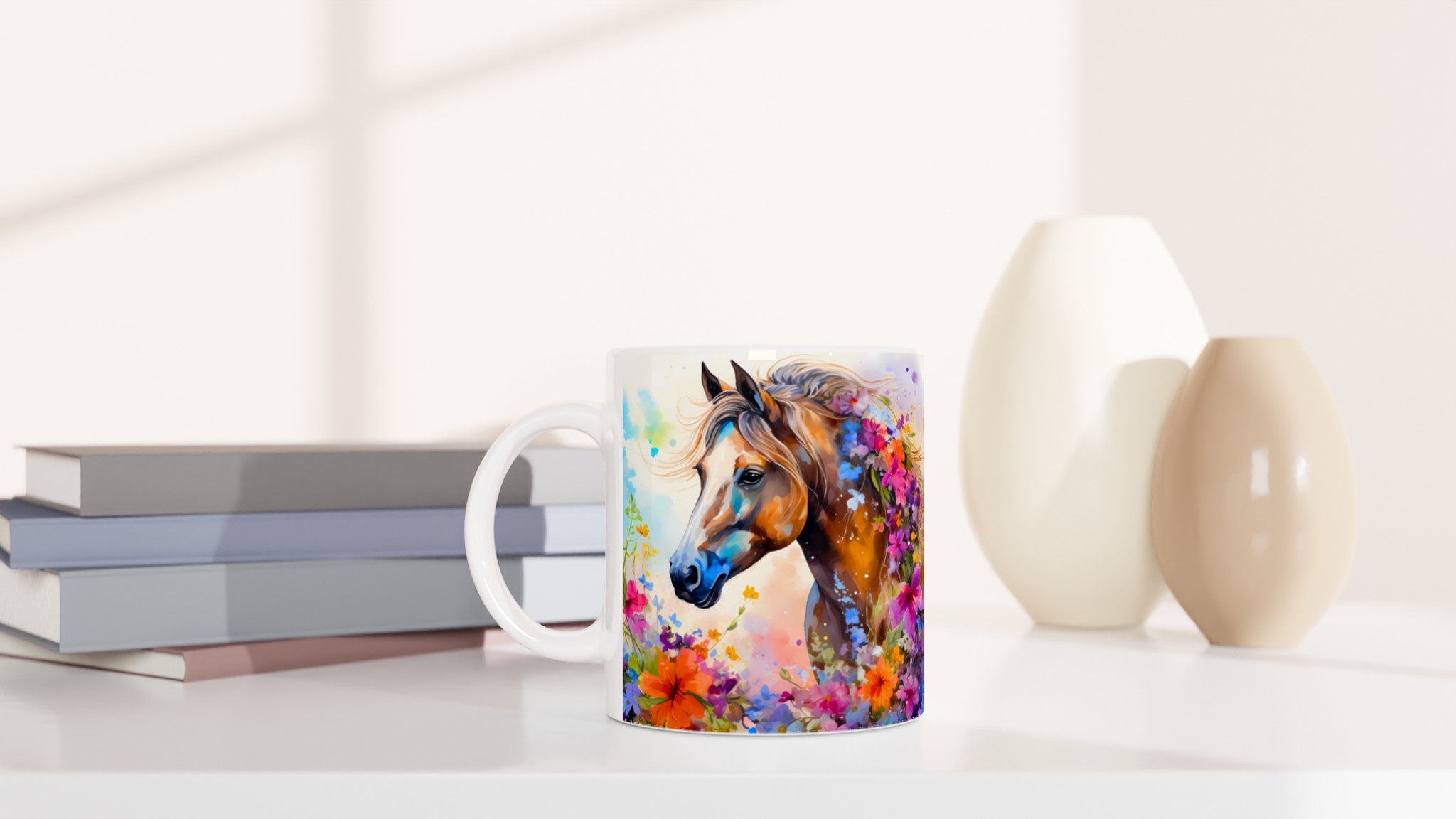 Lyft din fikastund med denna magiska keramiska mugg, som fångar den livfulla skönheten hos en häst omgiven av ett exploderande blomsterhav i akvarellstil. Varje klunk blir en upplevelse, inspirerad av de drömska färgerna och det konstnärliga uttrycket. Denna mugg är mer än bara en kopp – det är ett litet konstverk som förgyller din vardag, perfekt för dig som älskar djur, natur och konst.
