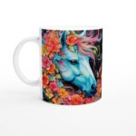Väck dina sinnen varje morgon med denna färgsprakande keramiska mugg, prydd med ett majestätiskt hästmotiv omgivet av en explosion av livfulla blommor. De intensiva färgerna – från turkos och lila till vibrerande orange och rosa – dansar mot den mörka bakgrunden och skapar en känsla av mystik och glädje. Denna mugg är mer än bara en kopp; den är ett konstverk som lyfter din fikastund till nya höjder, perfekt för att reflektera din unika stil och kärlek till färg.