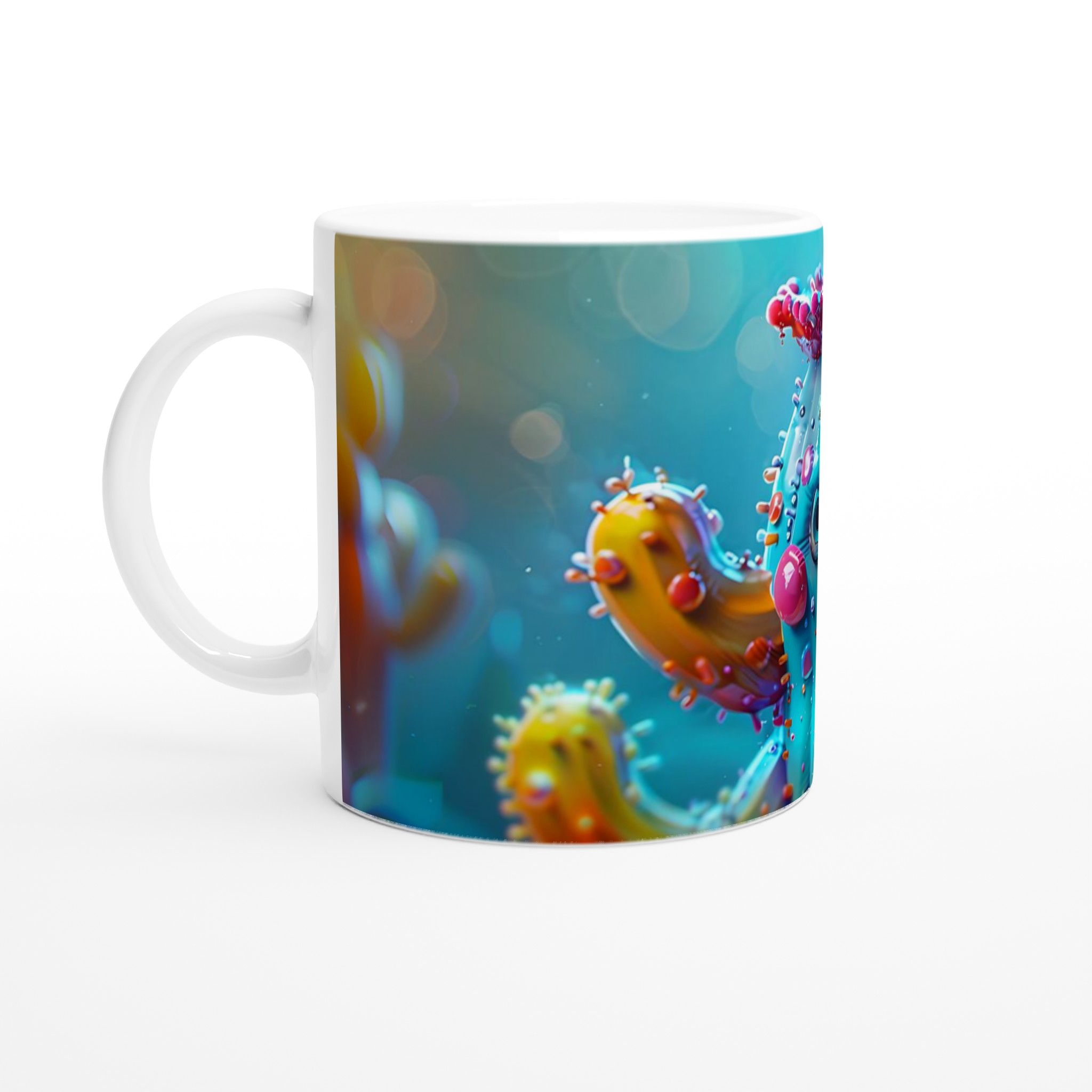 Inspirerad av fantasin, är denna mugg en explosion av glädje och färg, med en lekfull kaktusliknande design som fångar ögat och sätter igång samtal. Den blanka vita ytan ger ett skarpt och levande tryck som verkligen sticker ut, oavsett om det är en personlig design, ett roligt citat eller en present till någon du tycker om.