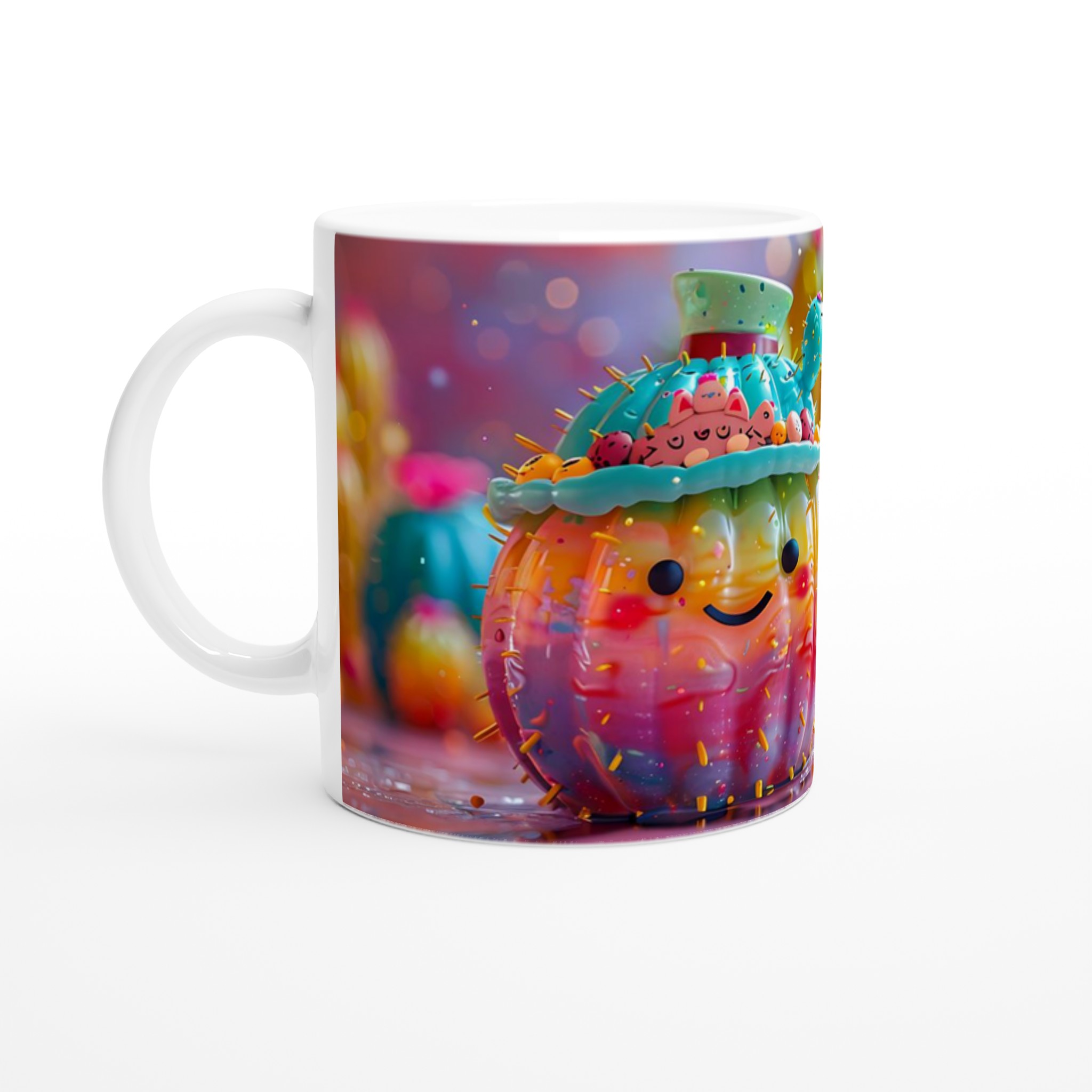 Inspirerad av den glada och färgstarka kaktusvärlden, ger denna mugg en omedelbar känsla av lekfullhet och charm till din dryckesupplevelse. Den blanka vita ytan ger ett skarpt och levande tryck som verkligen sticker ut, oavsett om det är en personlig design, ett roligt citat eller en present till någon du tycker om.