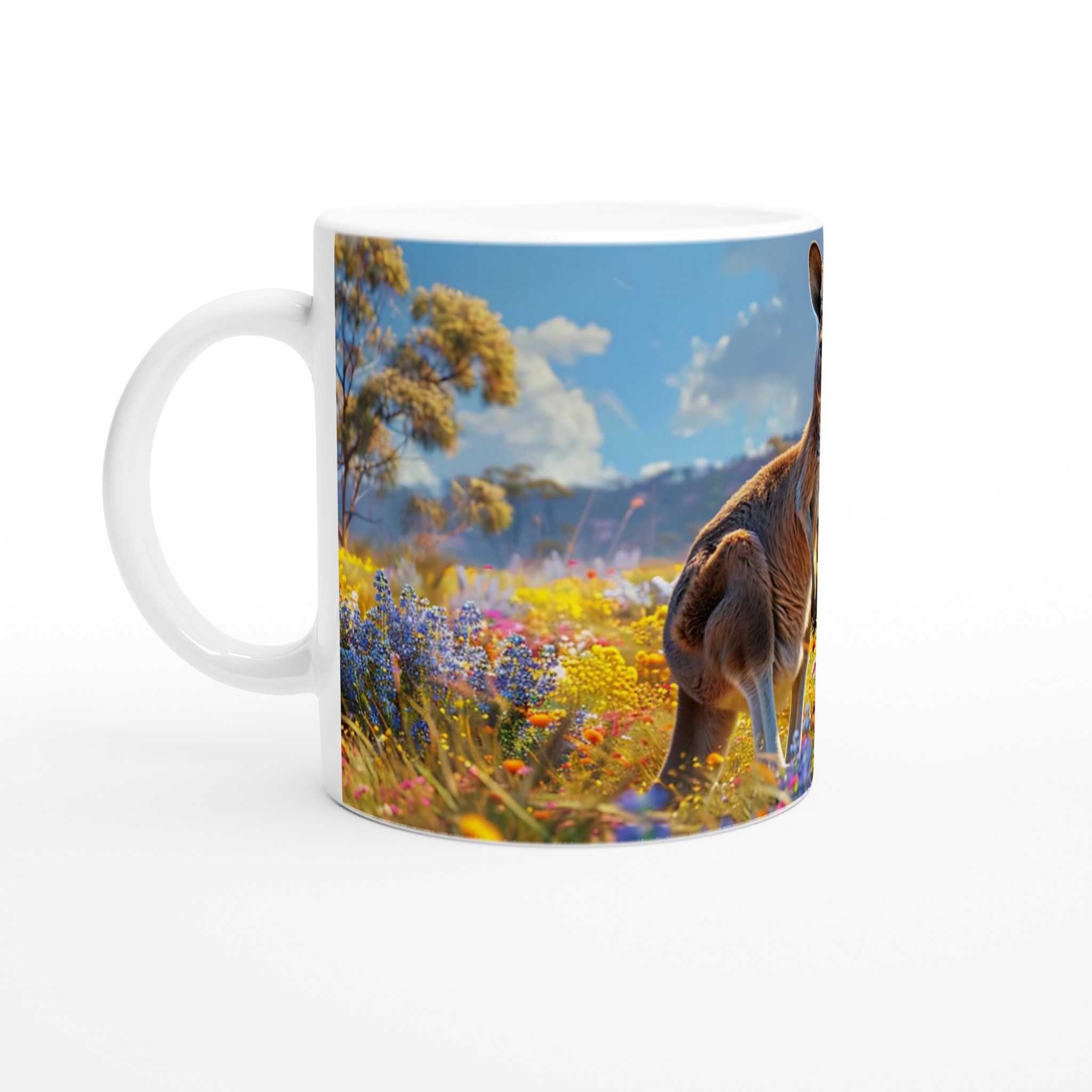 Föreställ dig att vakna upp till en explosion av färg och vild charm! Vår ”Färgsprakande Känguru” mugg fångar den livfulla skönheten hos en känguru mitt i ett hav av blomstrande vildblommor. Denna design är inte bara en bild, utan en inbjudan till att drömma dig bort till Australiens soliga slätter varje gång du tar en klunk. Med en kapacitet på 11 oz (ca 3,25 dl) är den perfekt för morgonkaffe, te, varm choklad eller din favoritdryck på jobbet. En idealisk storlek för både hem och kontor.