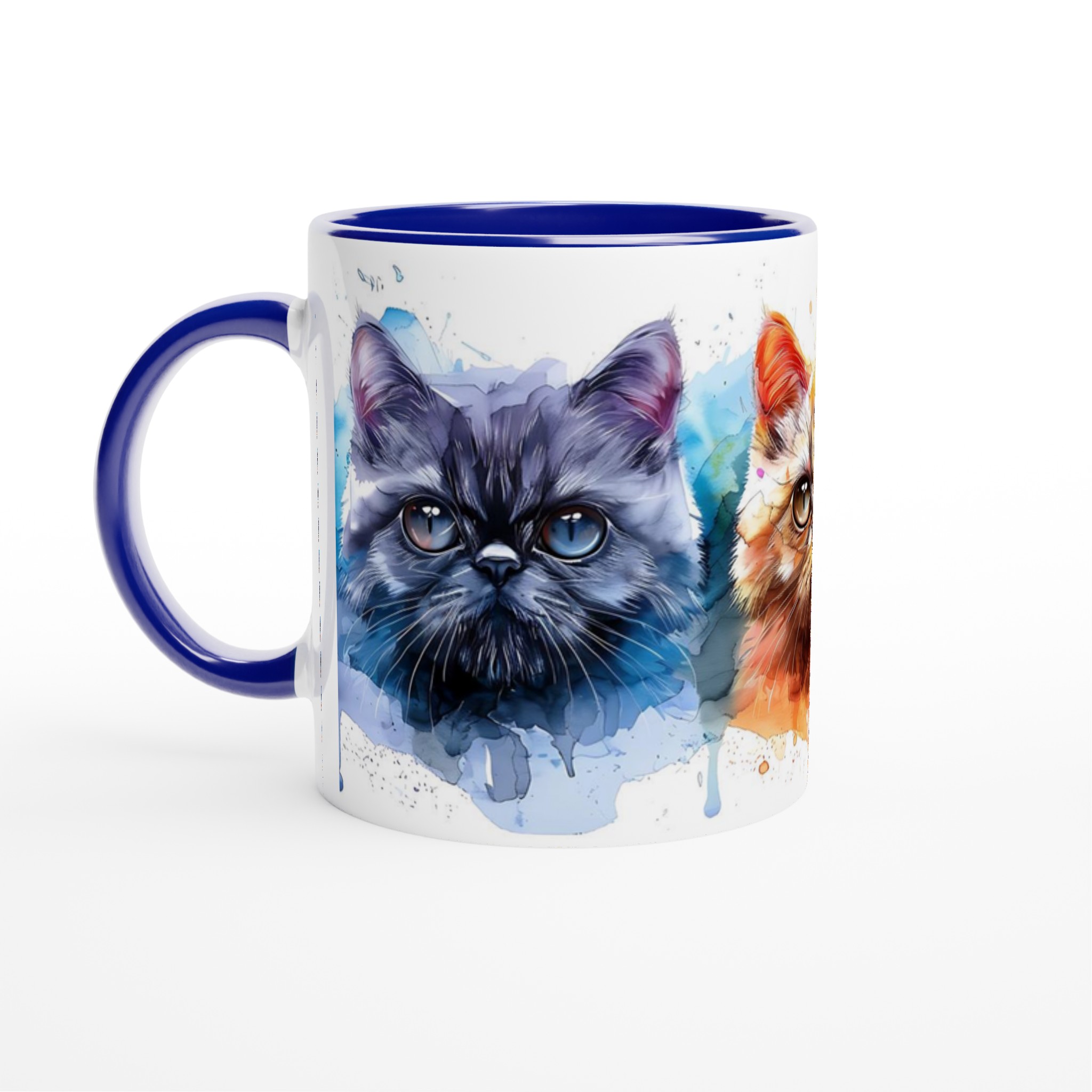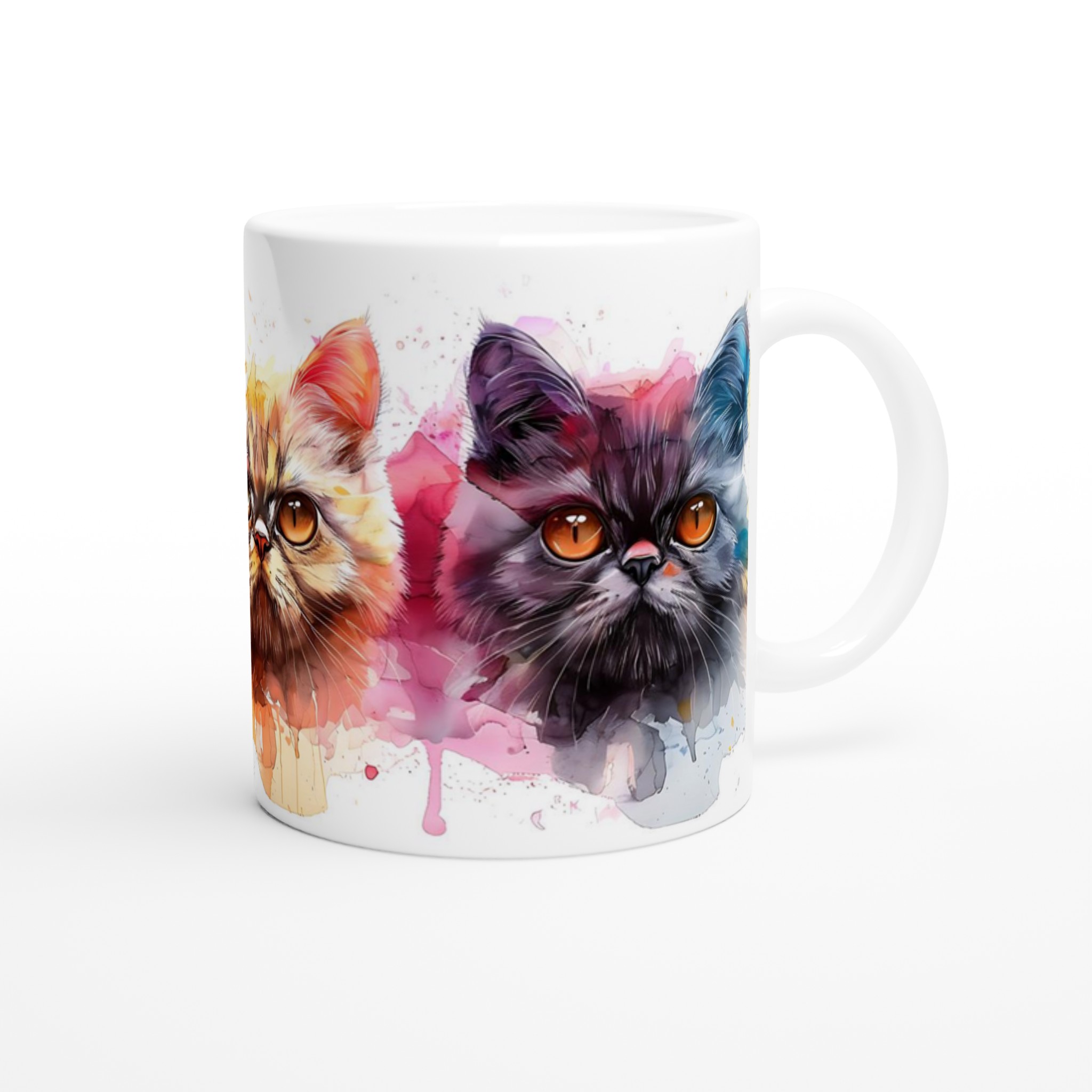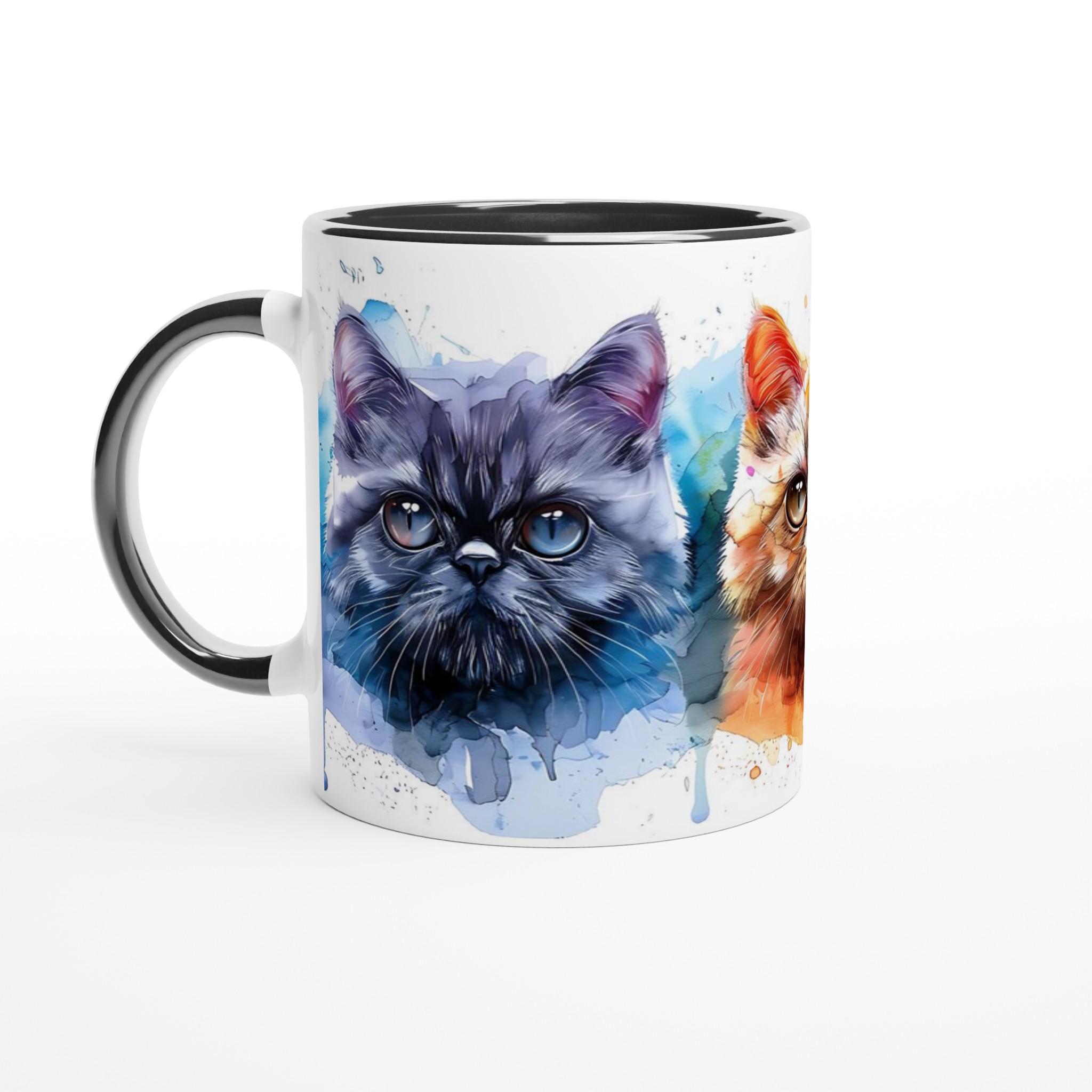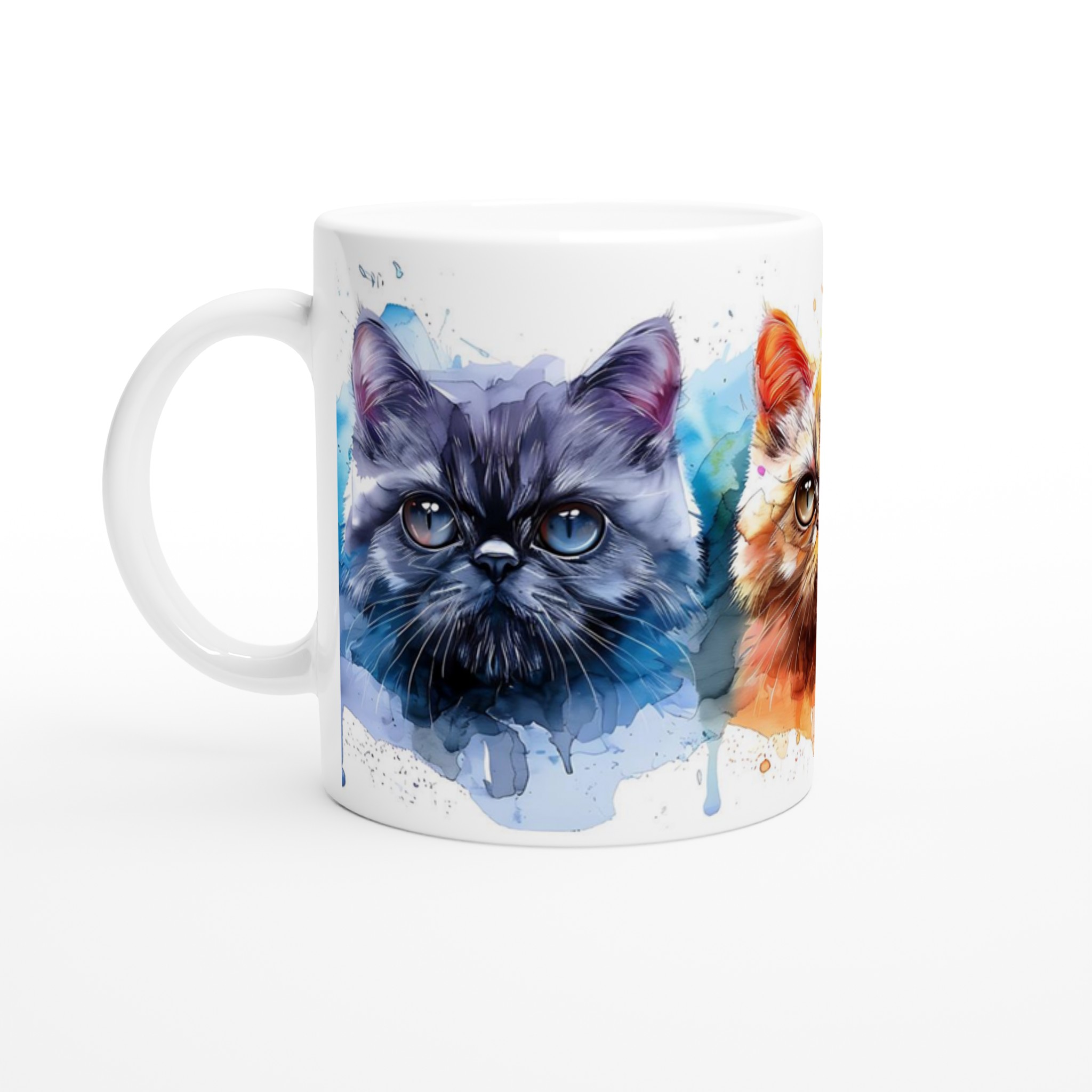 Ge din fikastund en konstnärlig touch med denna unika keramiska mugg, prydd med livfulla akvarellporträtt av charmiga katter. Varje katt är framställd med en explosion av färgstarka penseldrag som fångar deras personlighet – från den mystiska blåtonade skönheten till den lekfulla orangea och den drömska lila. Denna mugg blir snabbt en vardagsfavorit, perfekt för morgonkaffet, kvällens varma choklad eller när du bara vill njuta av en kopp te.