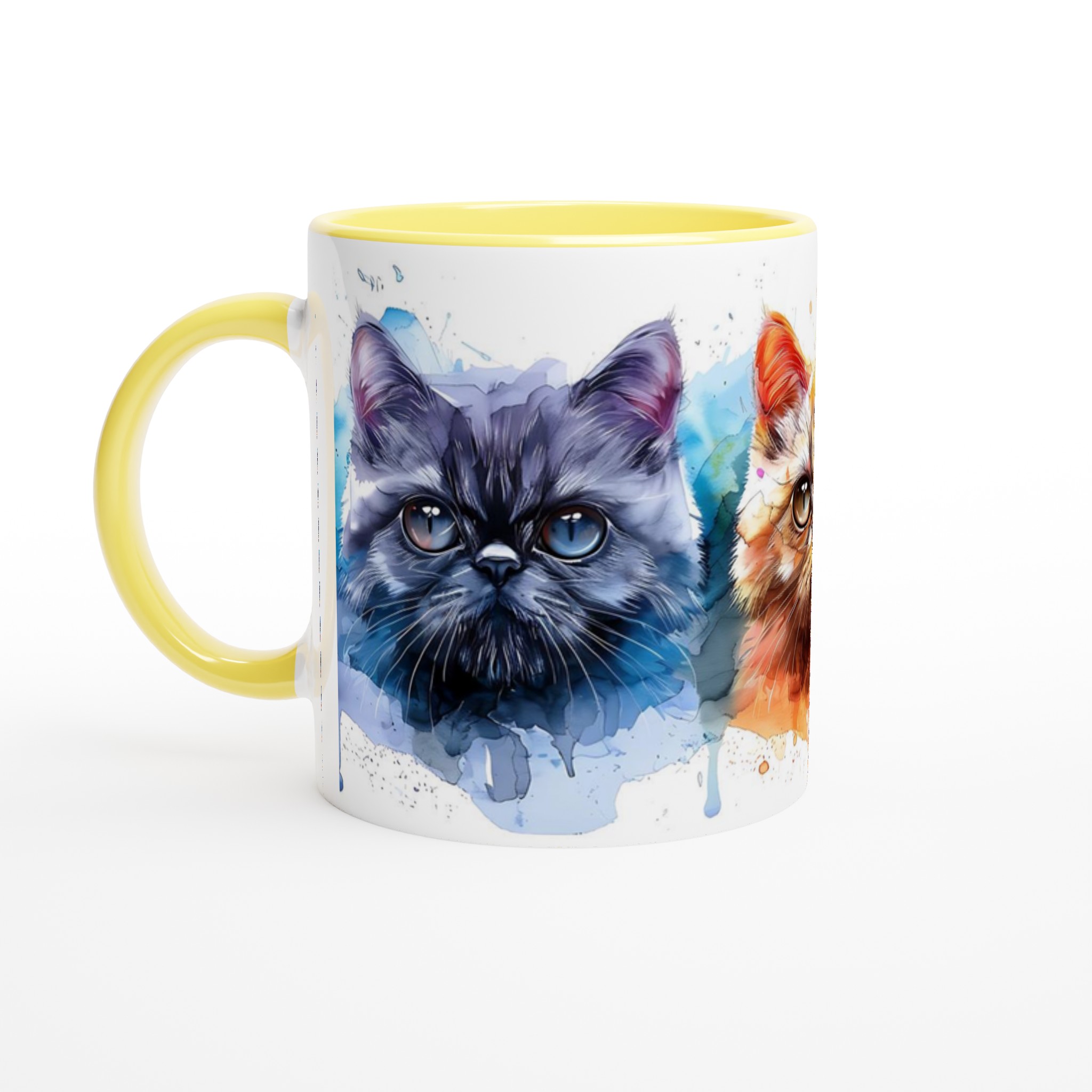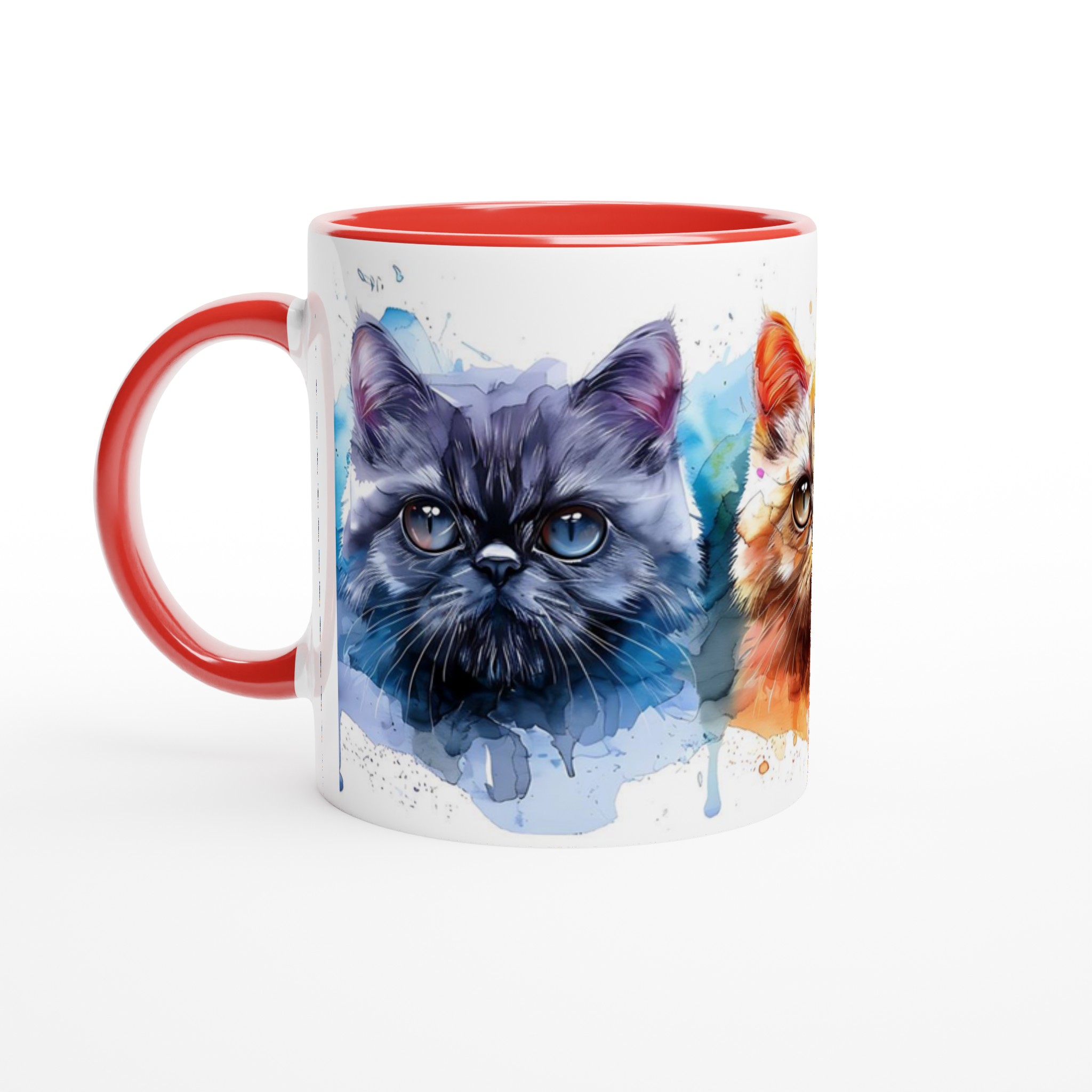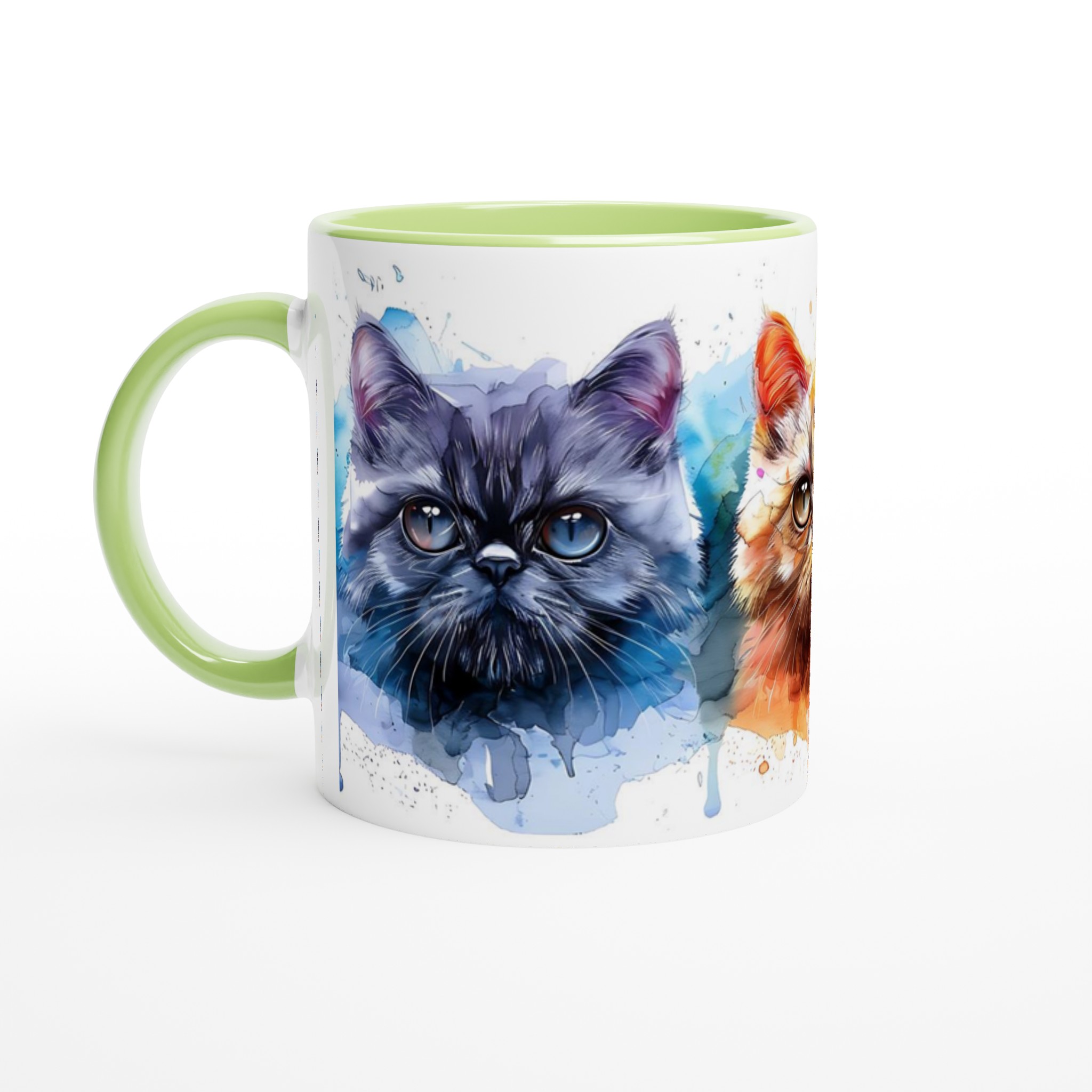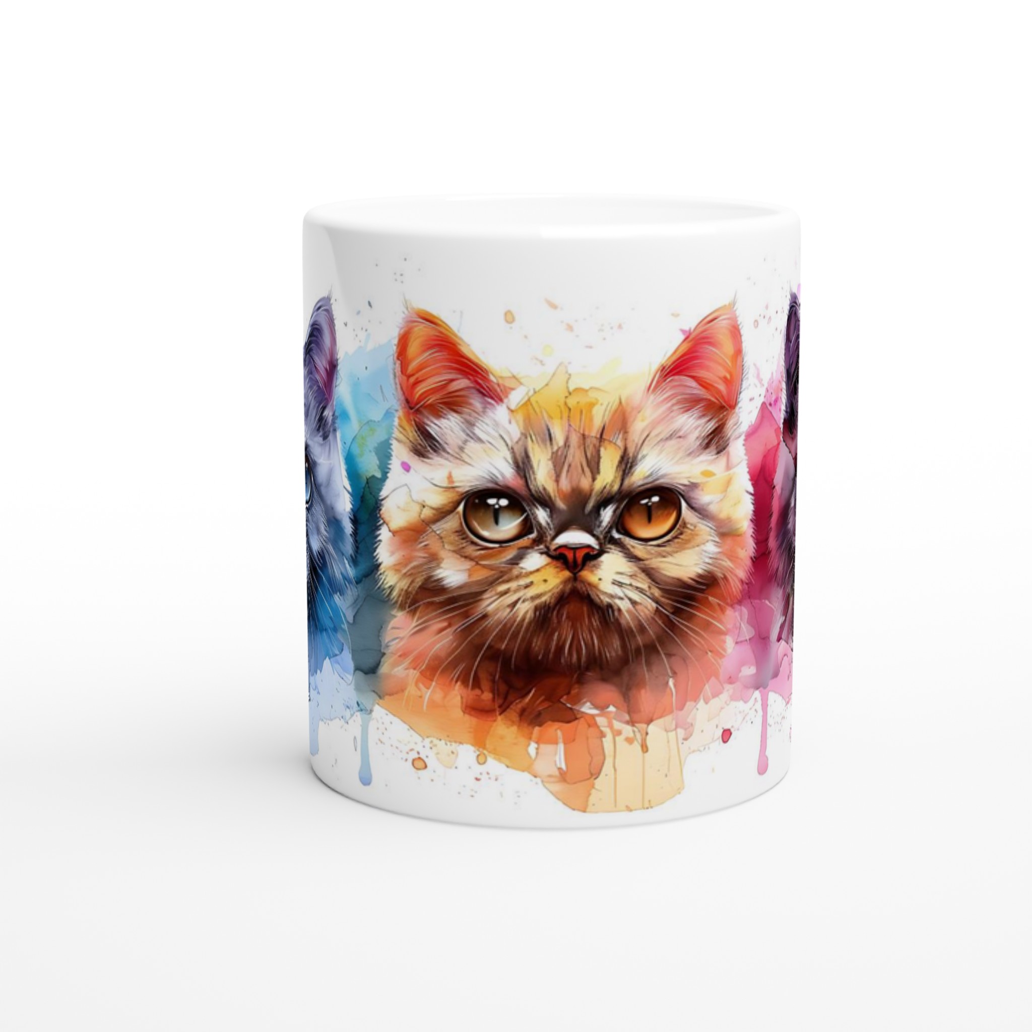 Ge din fikastund en konstnärlig touch med denna unika keramiska mugg, prydd med livfulla akvarellporträtt av charmiga katter. Varje katt är framställd med en explosion av färgstarka penseldrag som fångar deras personlighet – från den mystiska blåtonade skönheten till den lekfulla orangea och den drömska lila. Denna mugg blir snabbt en vardagsfavorit, perfekt för morgonkaffet, kvällens varma choklad eller när du bara vill njuta av en kopp te.