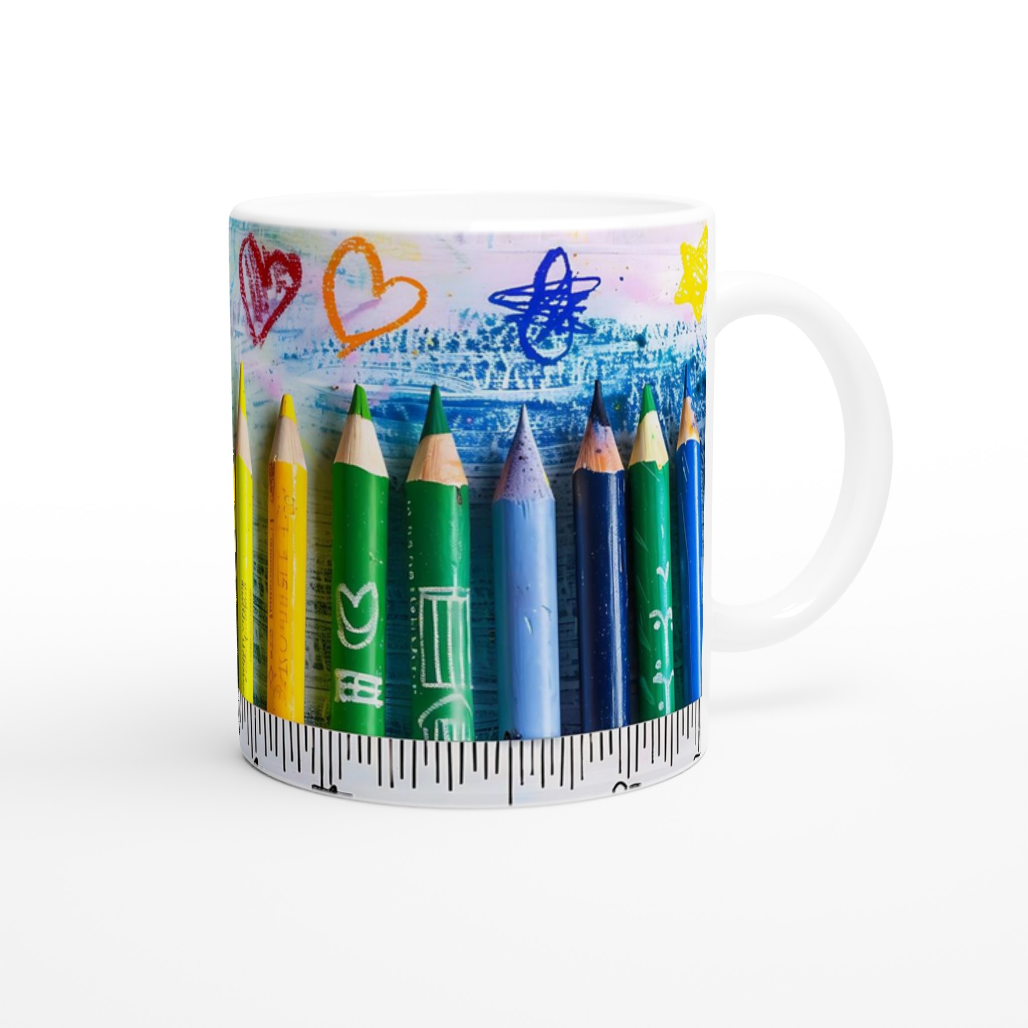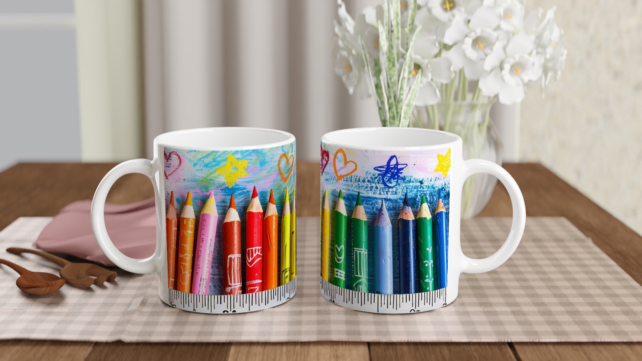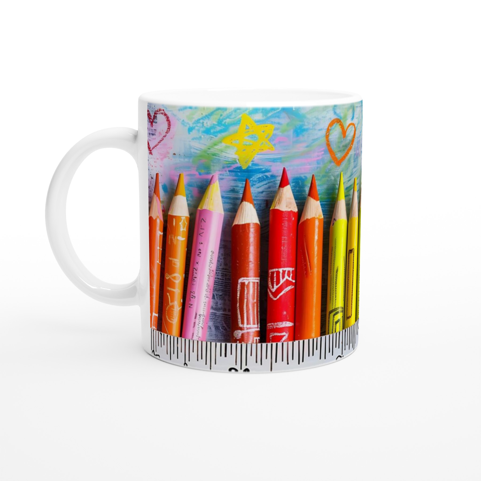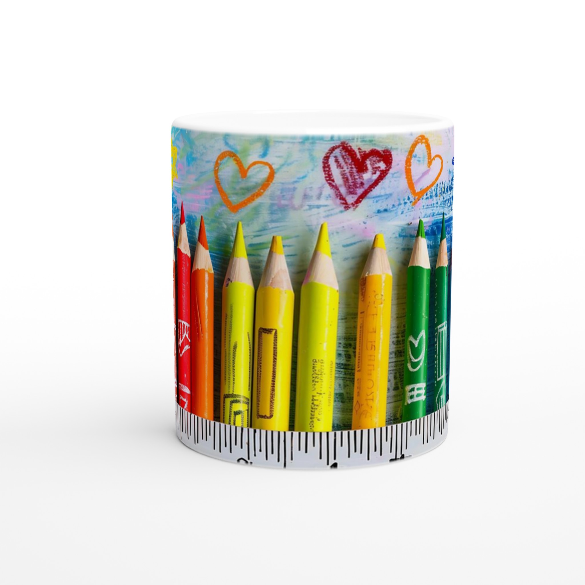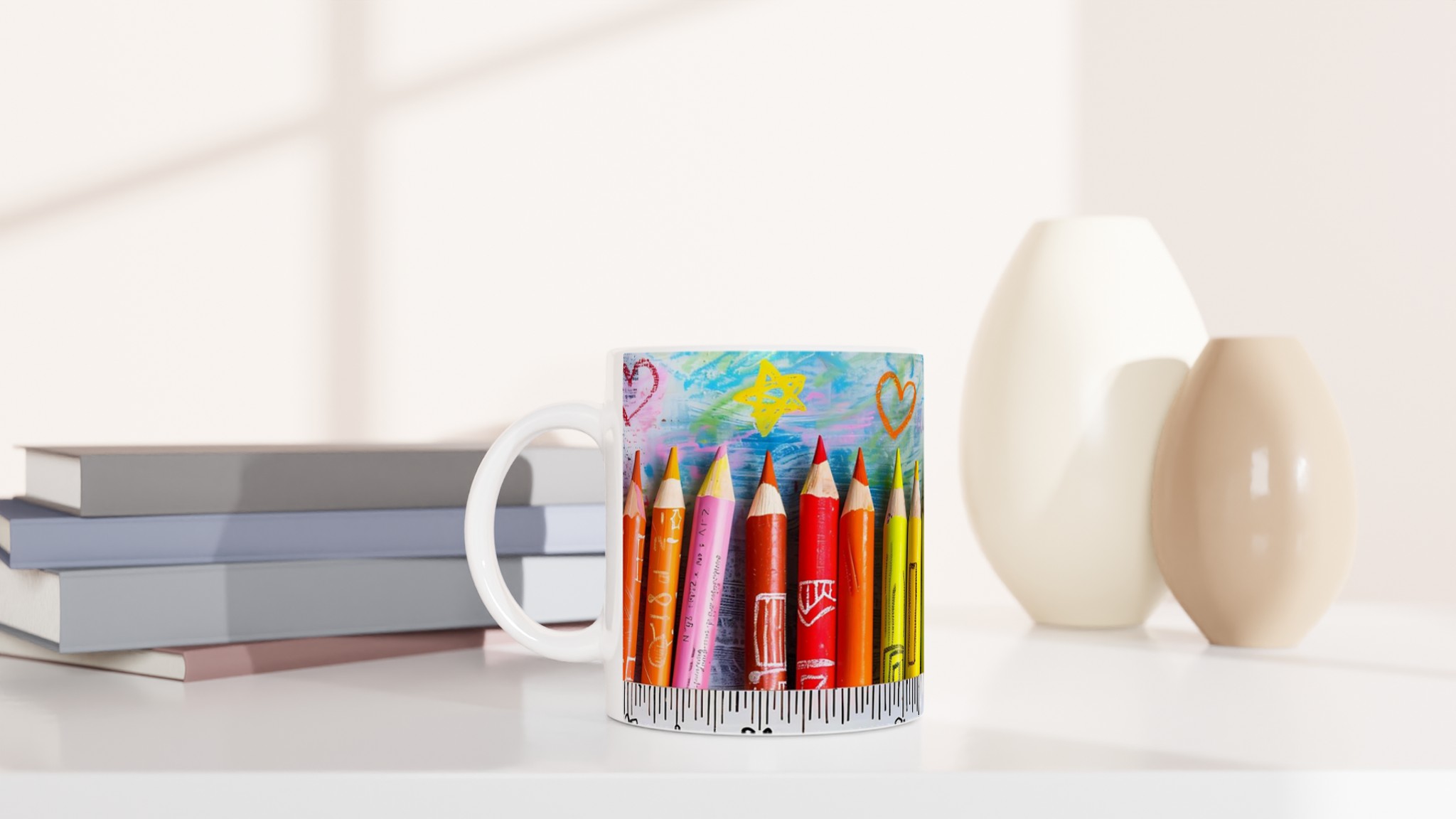 Låt kreativiteten flöda med denna färgsprakande keramiska mugg, inspirerad av glädjen i att skapa! Den här stilrena muggen blir snabbt en vardagsfavorit, perfekt för morgonkaffet, kvällens varma choklad eller när du bara vill njuta av en kopp te. Den blanka ytan gör att trycken framhävs med klara och levande färger, som håller sig fina även efter många turer i mikron och diskmaskinen.