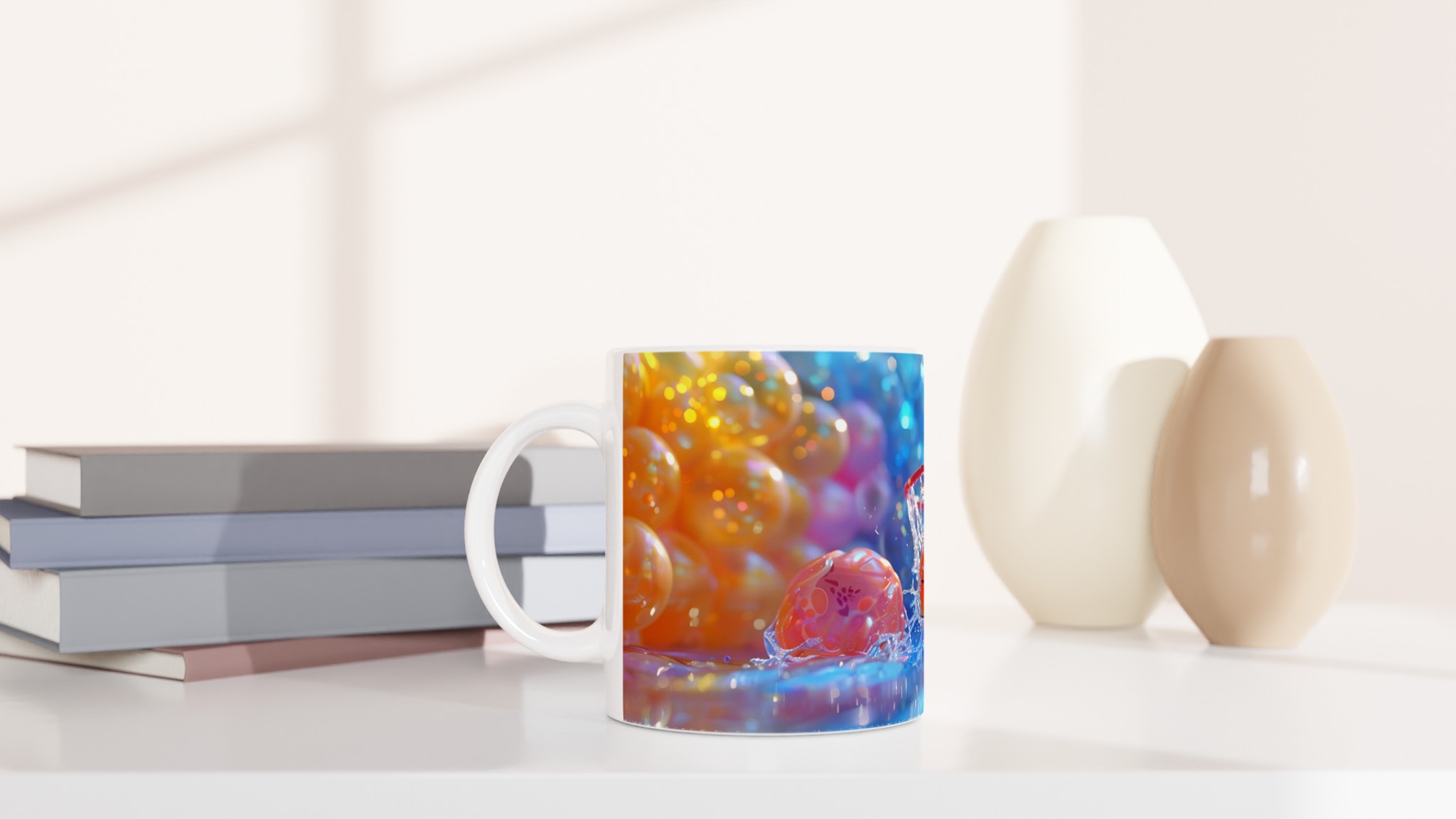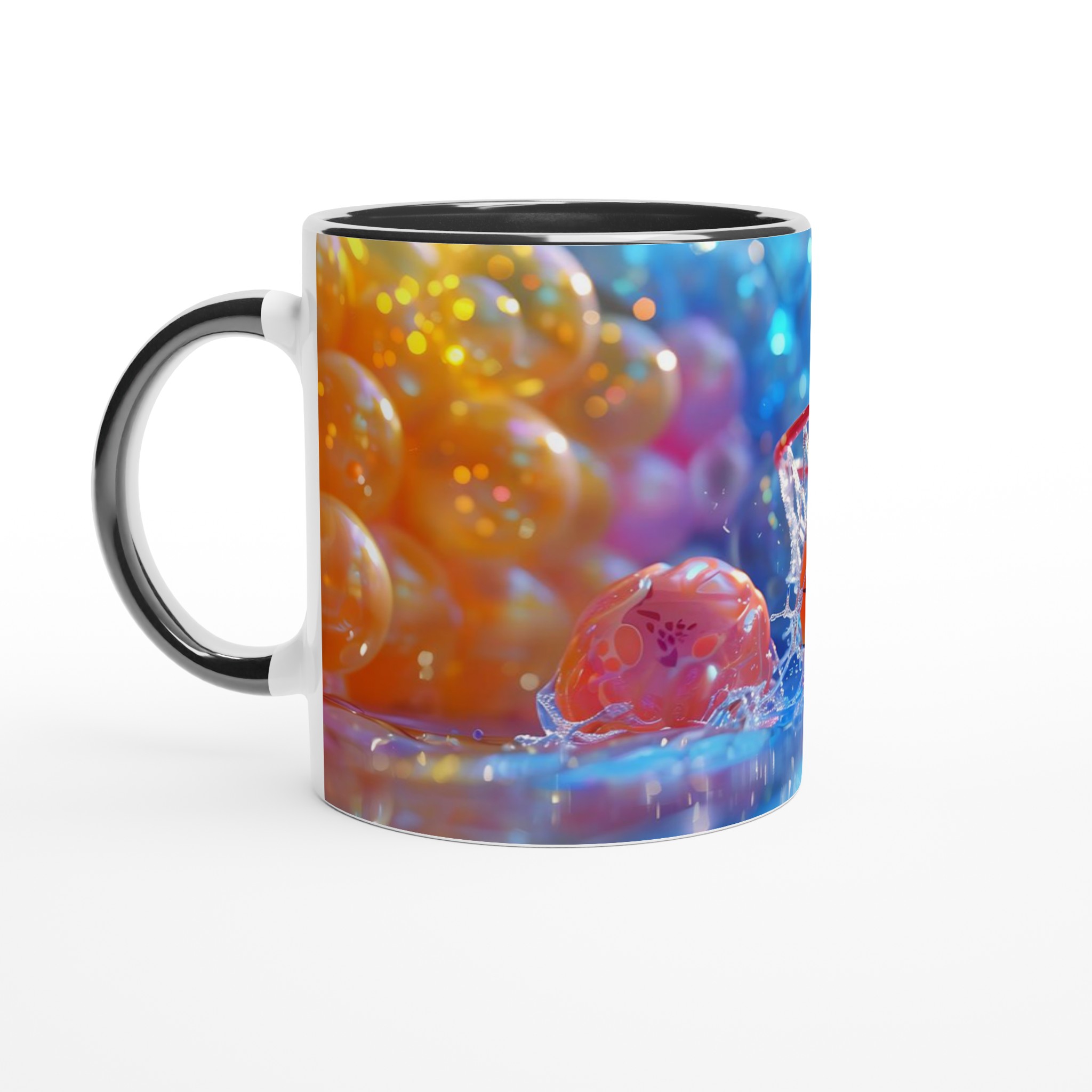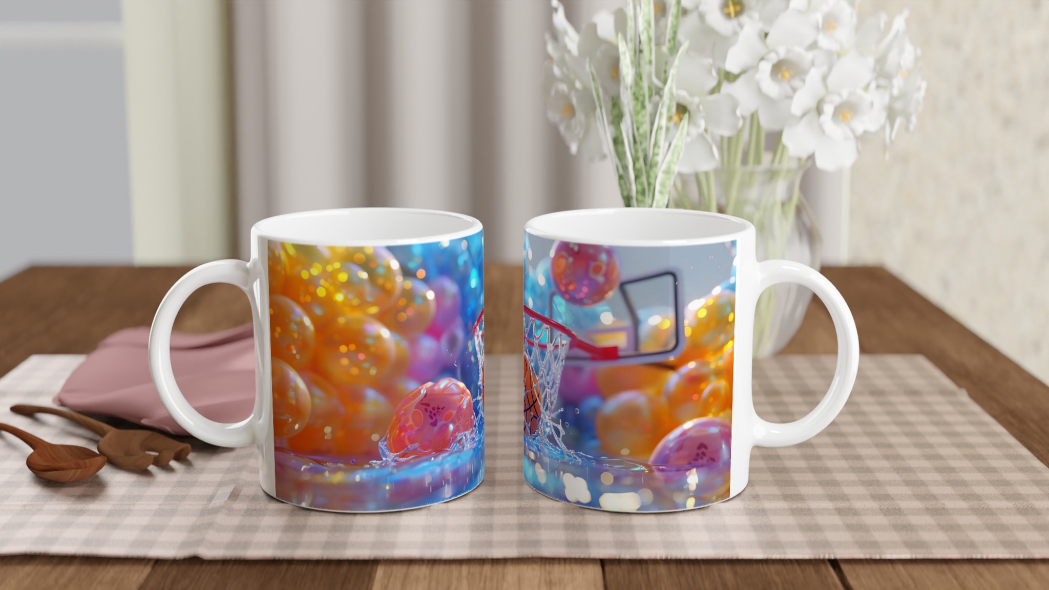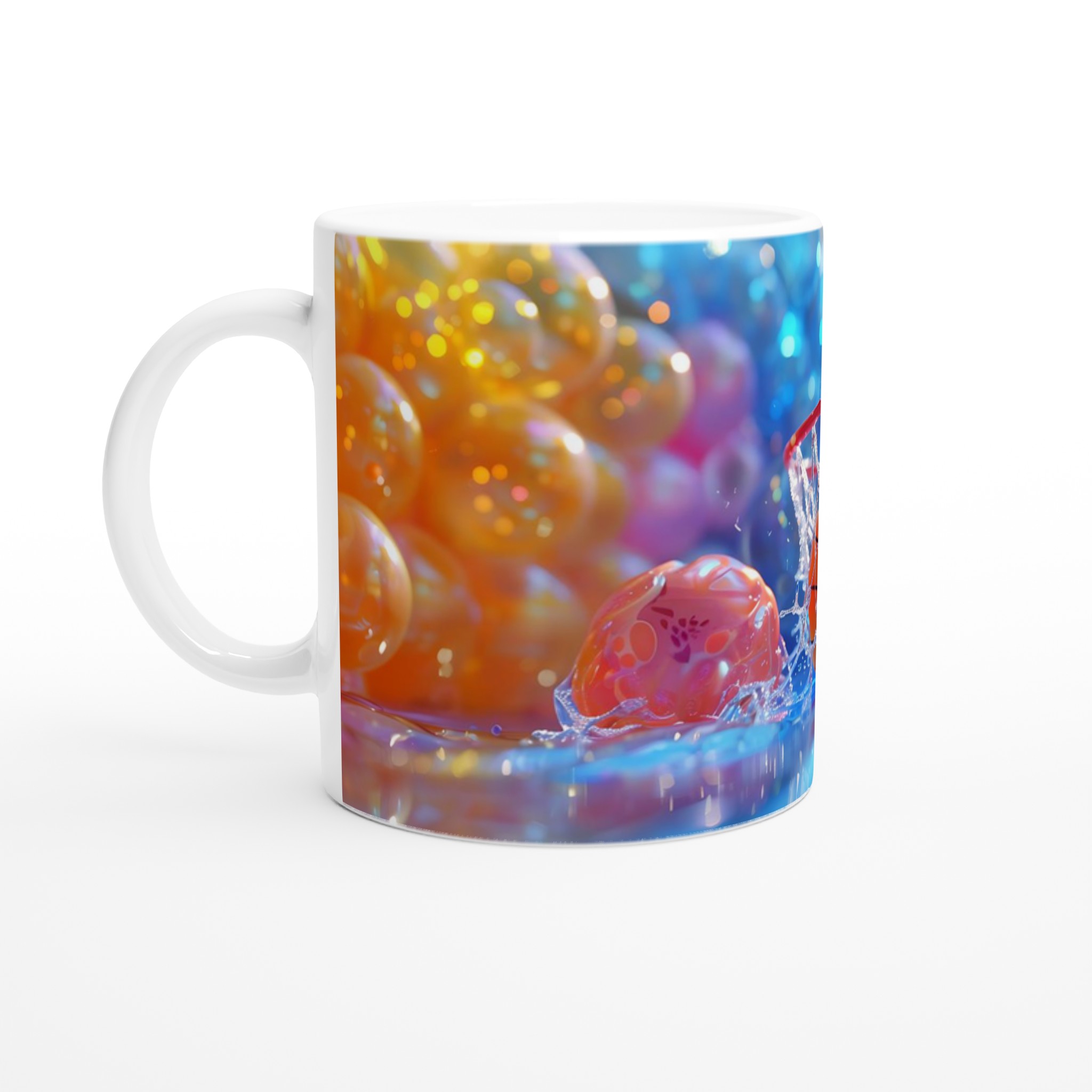 Lyft din vardagsrutin med vår färgsprakande keramiska mugg, som fångar den lekfulla och livfulla energin från en basketmatch under glittrande bubblor. Denna mugg blir snabbt en favorit, perfekt för morgonkaffet, kvällens varma choklad eller när du bara vill njuta av en kopp te i en riktigt inspirerande design. Den blanka ytan låter trycken framhävas med klara och levande färger, som håller sig fina även efter många turer i mikron och diskmaskinen.