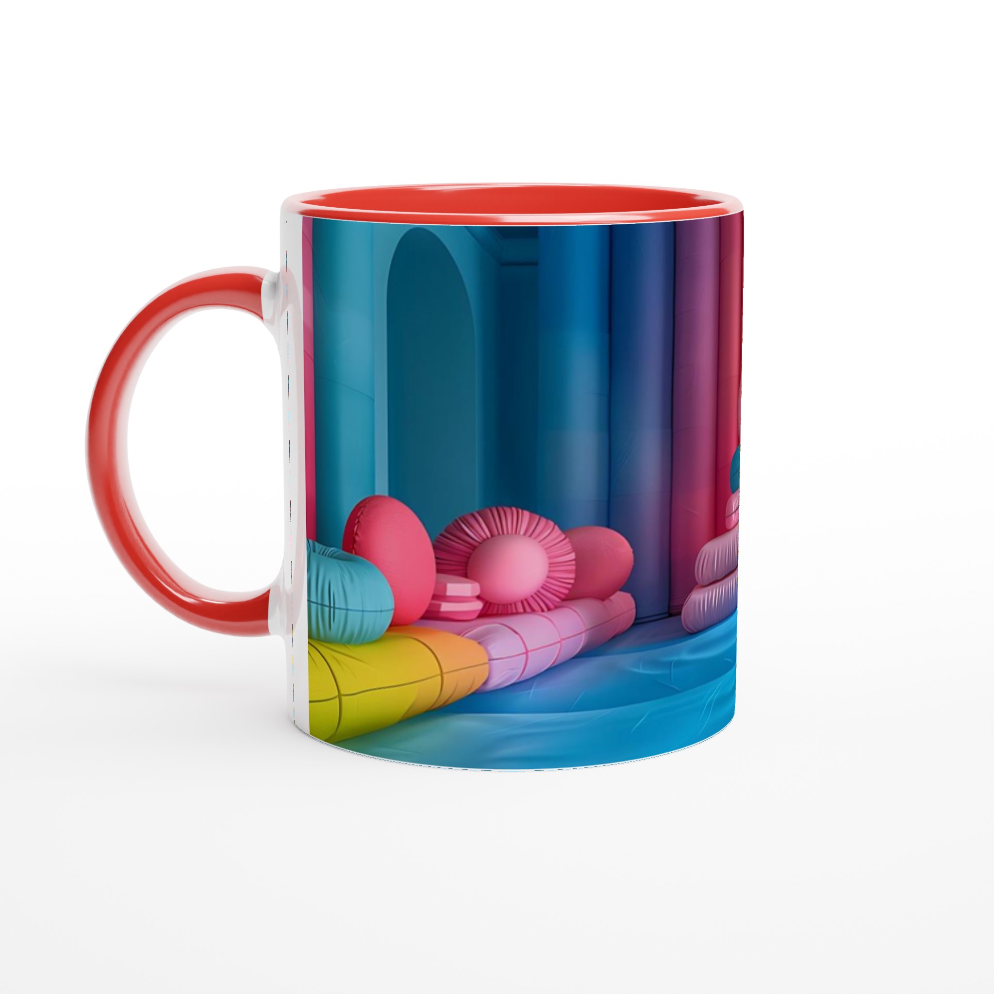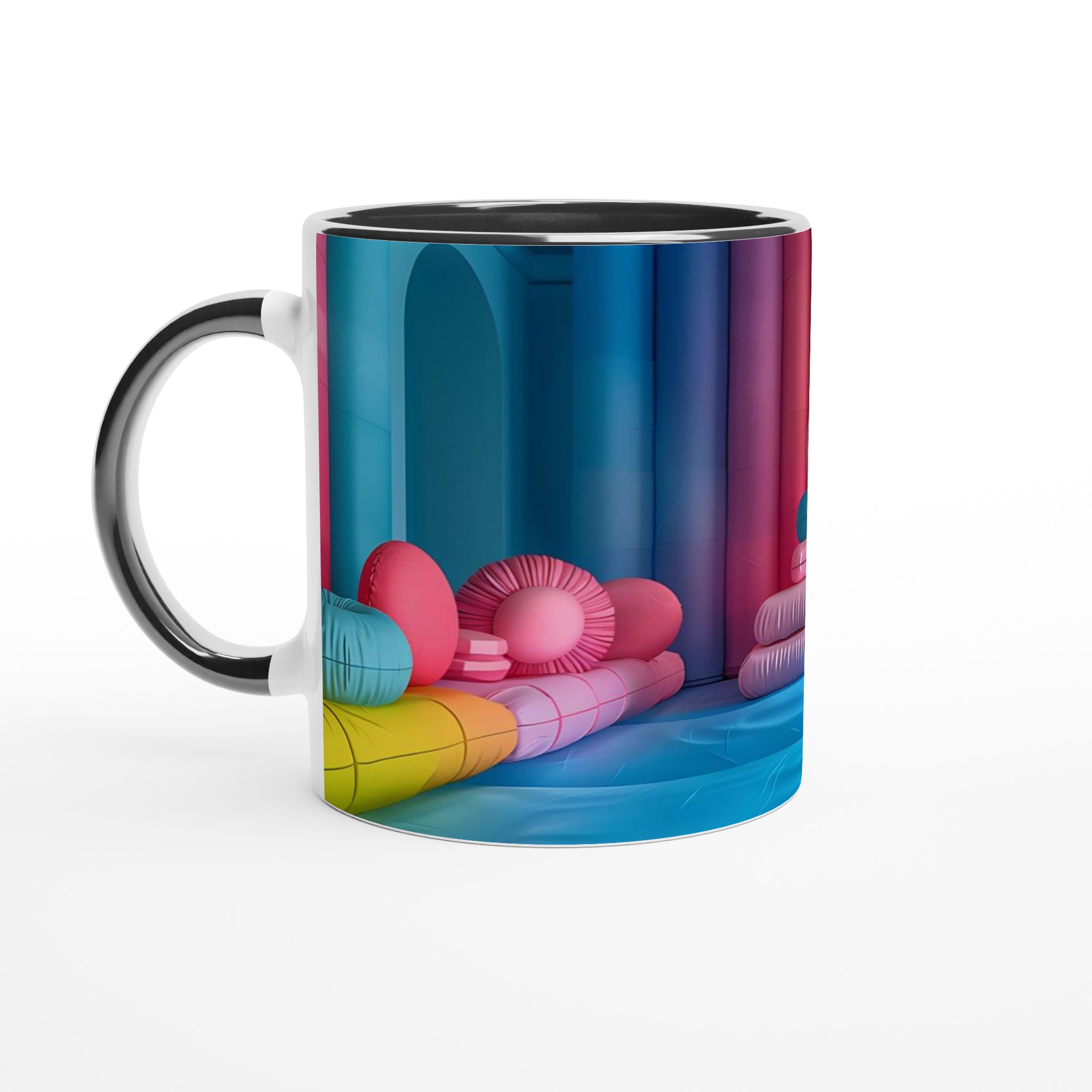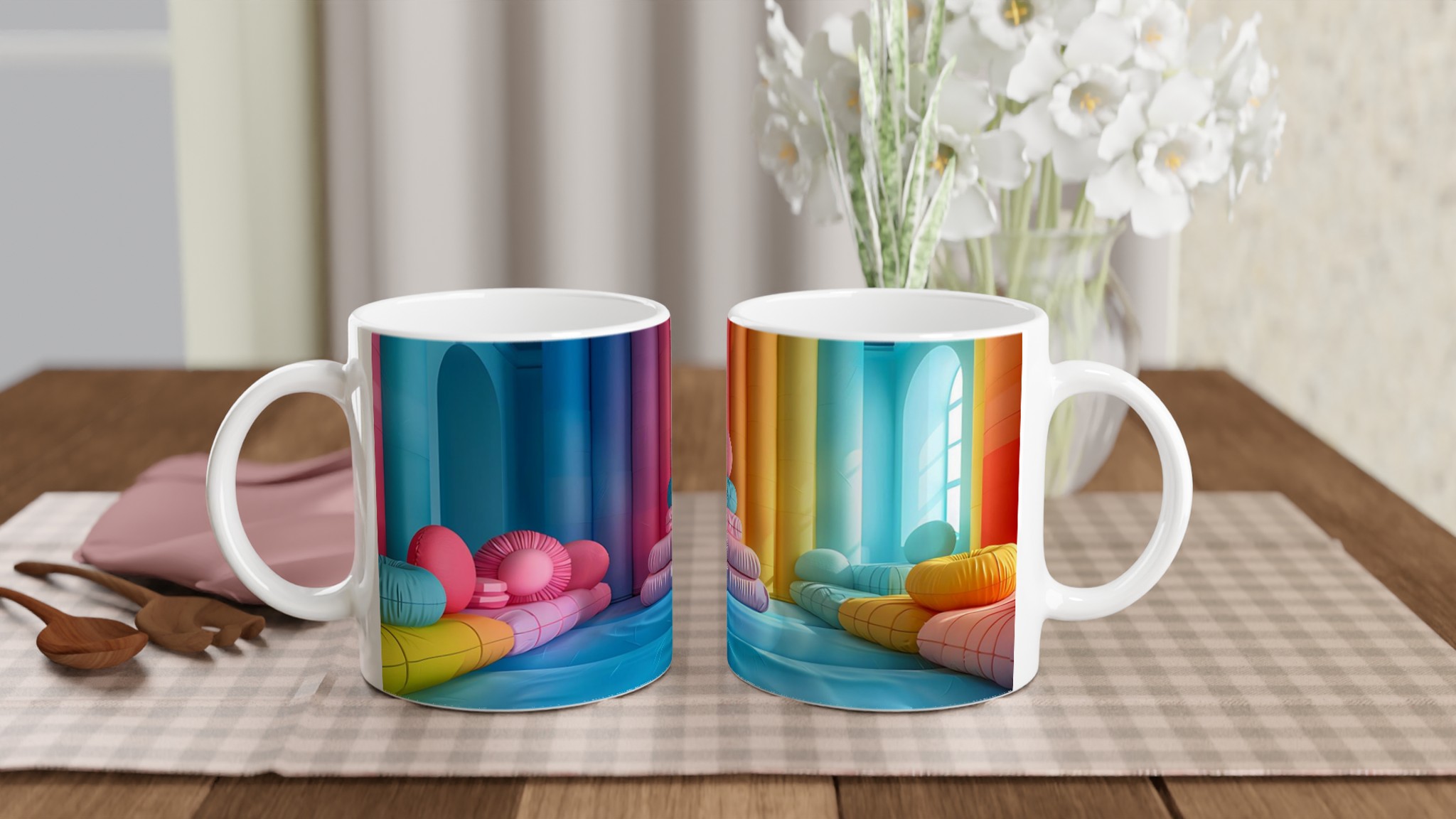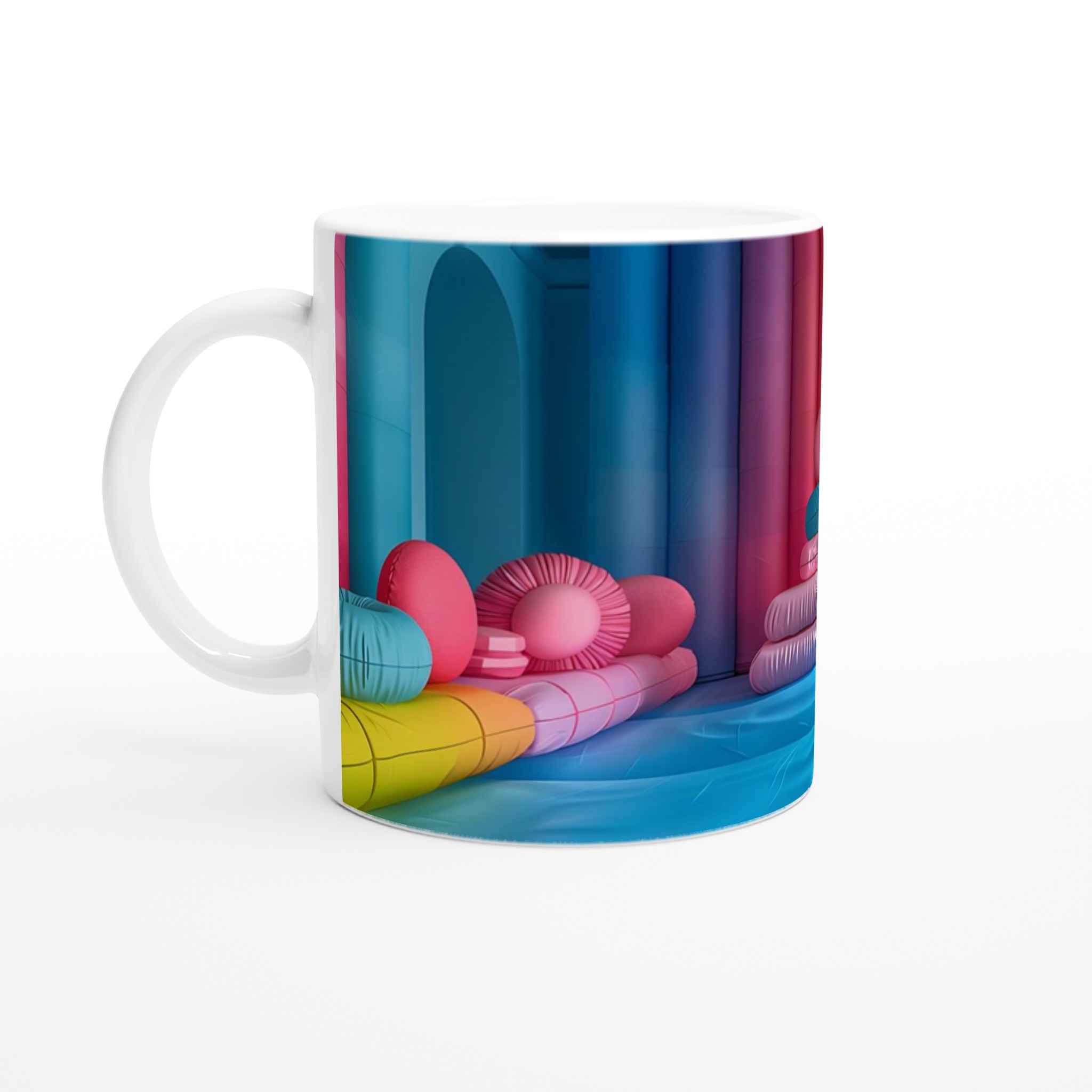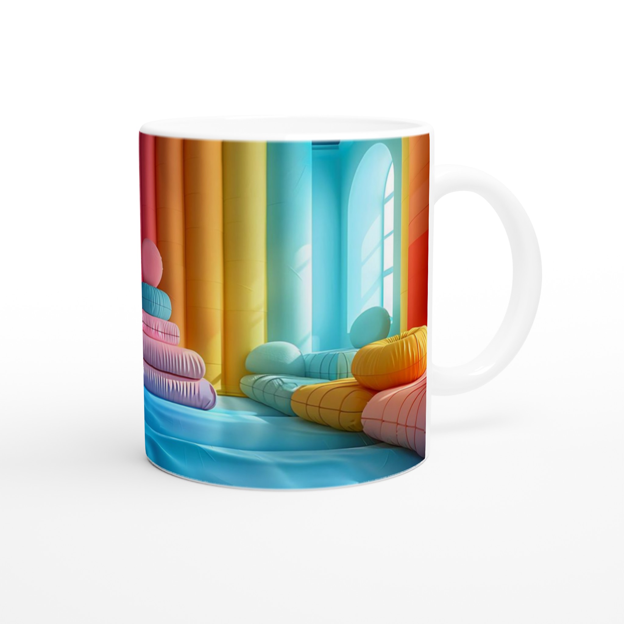 Låt din morgon starta med en explosion av färg! Denna stilrena keramiska mugg blir snabbt en vardagsfavorit och en källa till glädje, inspirerad av den lekfulla och livfulla färgpaletten i bilden. Perfekt för morgonkaffet, kvällens varma choklad eller när du bara vill njuta av en kopp te. Den blanka vita ytan gör att trycken framhävs med klara och levande färger, som håller sig fina även efter många turer i mikron och diskmaskinen.