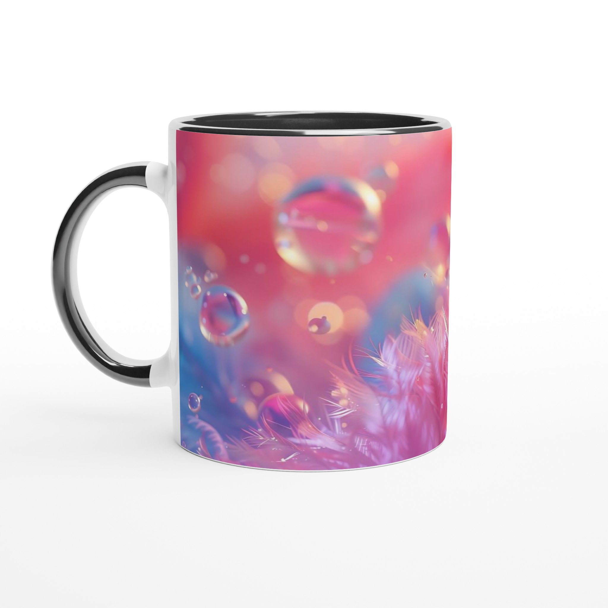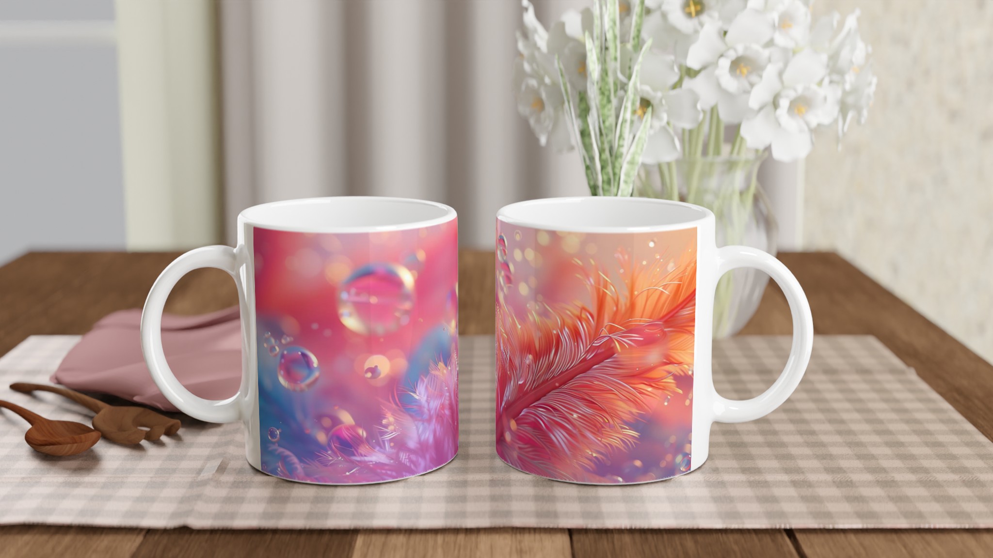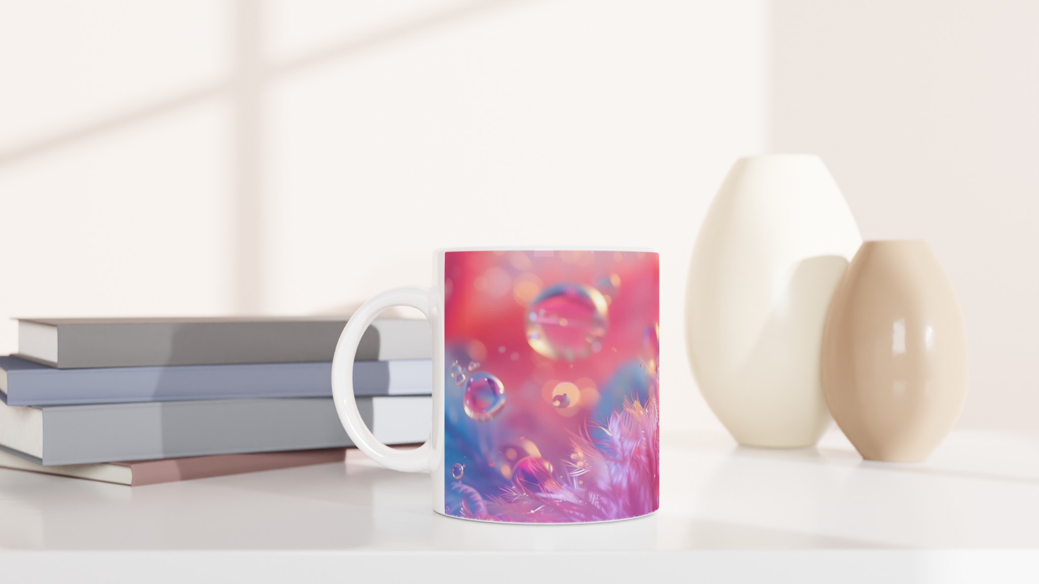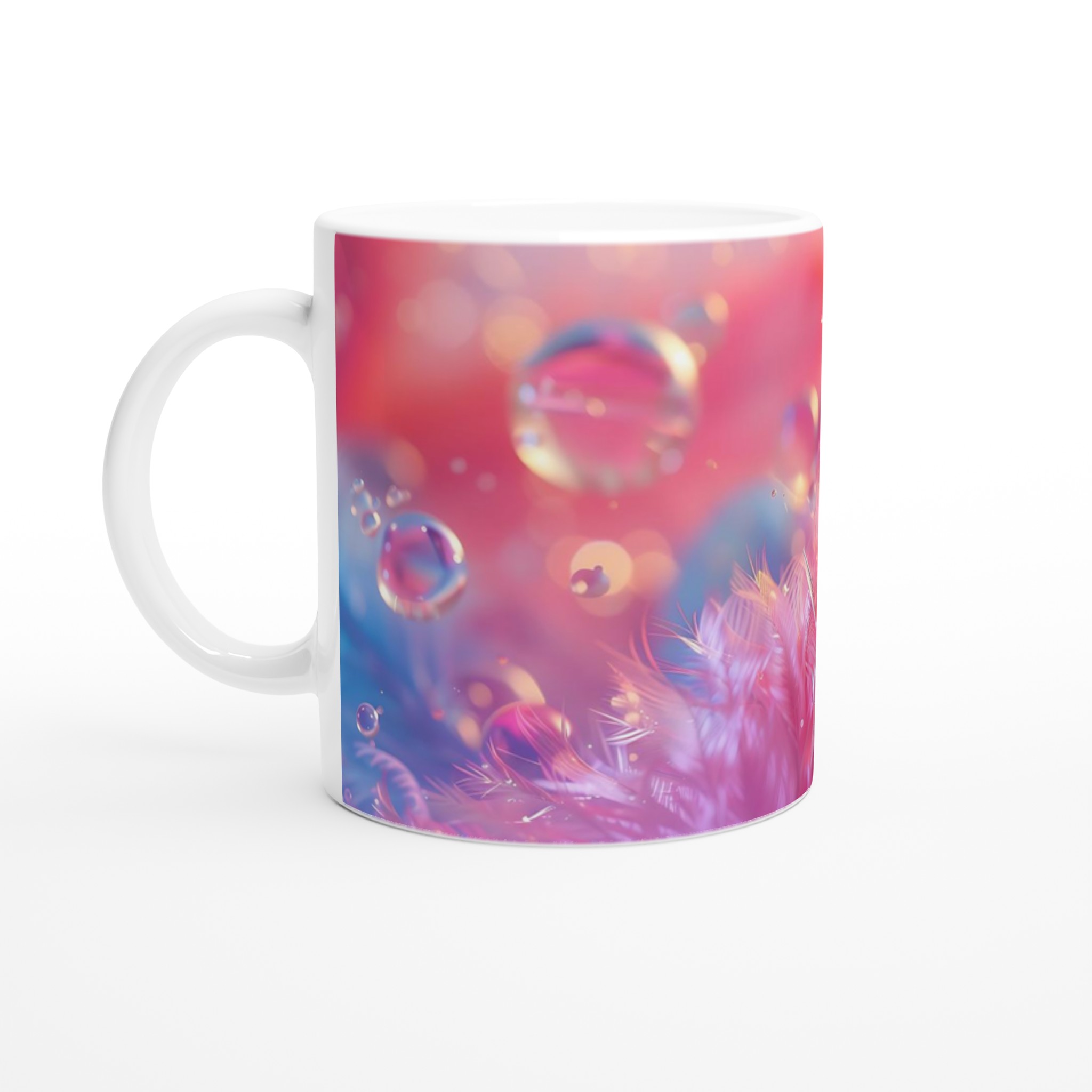 Lyft din fikastund till en konstupplevelse med denna färgsprakande keramiska mugg! Inspirerad av den drömska paletten av glödande fjädrar och skimrande bubblor, förvandlar denna mugg varje sipp till ett ögonblick av ren glädje. Perfekt för morgonkaffet, kvällens varma choklad eller när du bara vill njuta av en kopp te. Den blanka vita ytan gör att trycken framhävs med klara och levande färger, som håller sig fina även efter många turer i mikron och diskmaskinen.