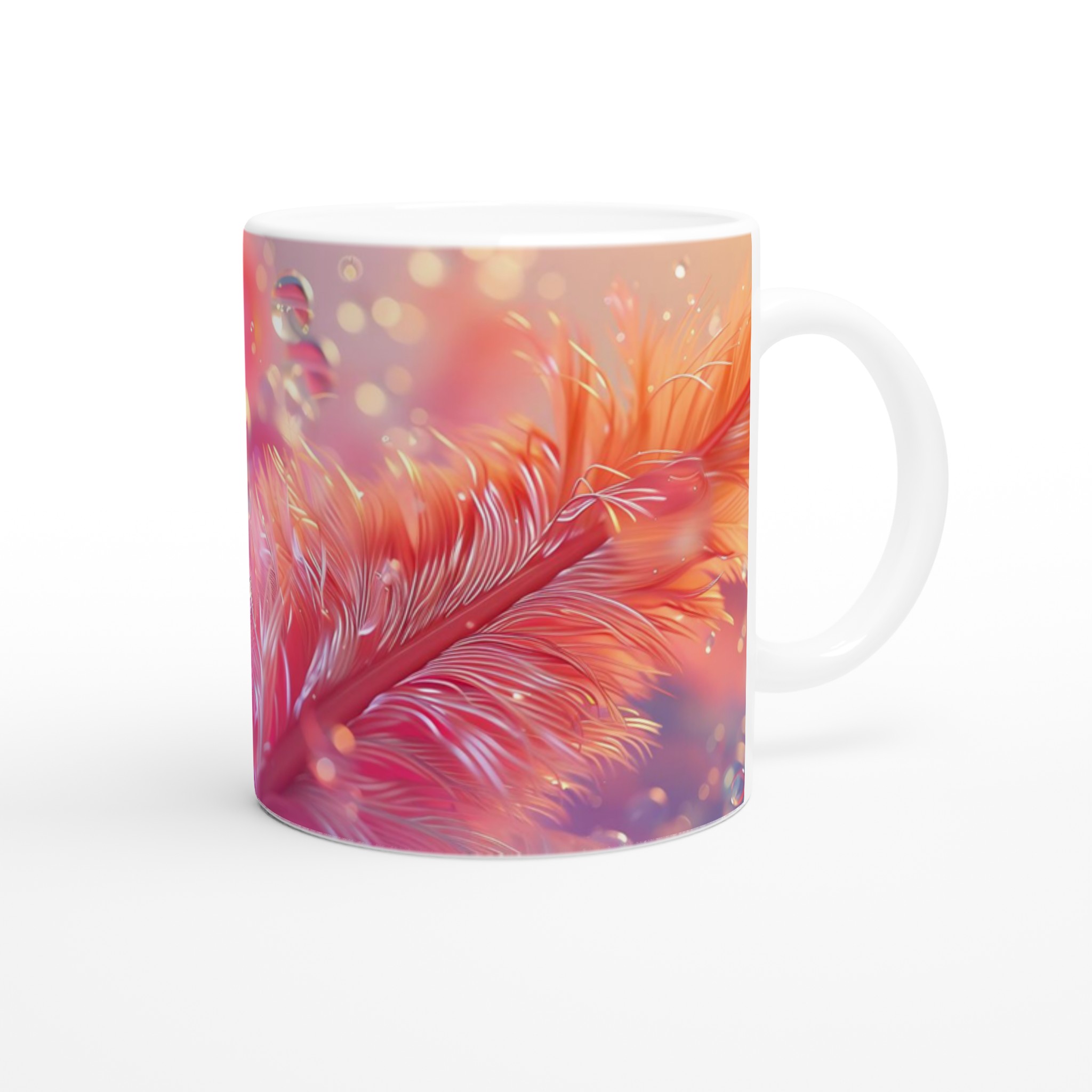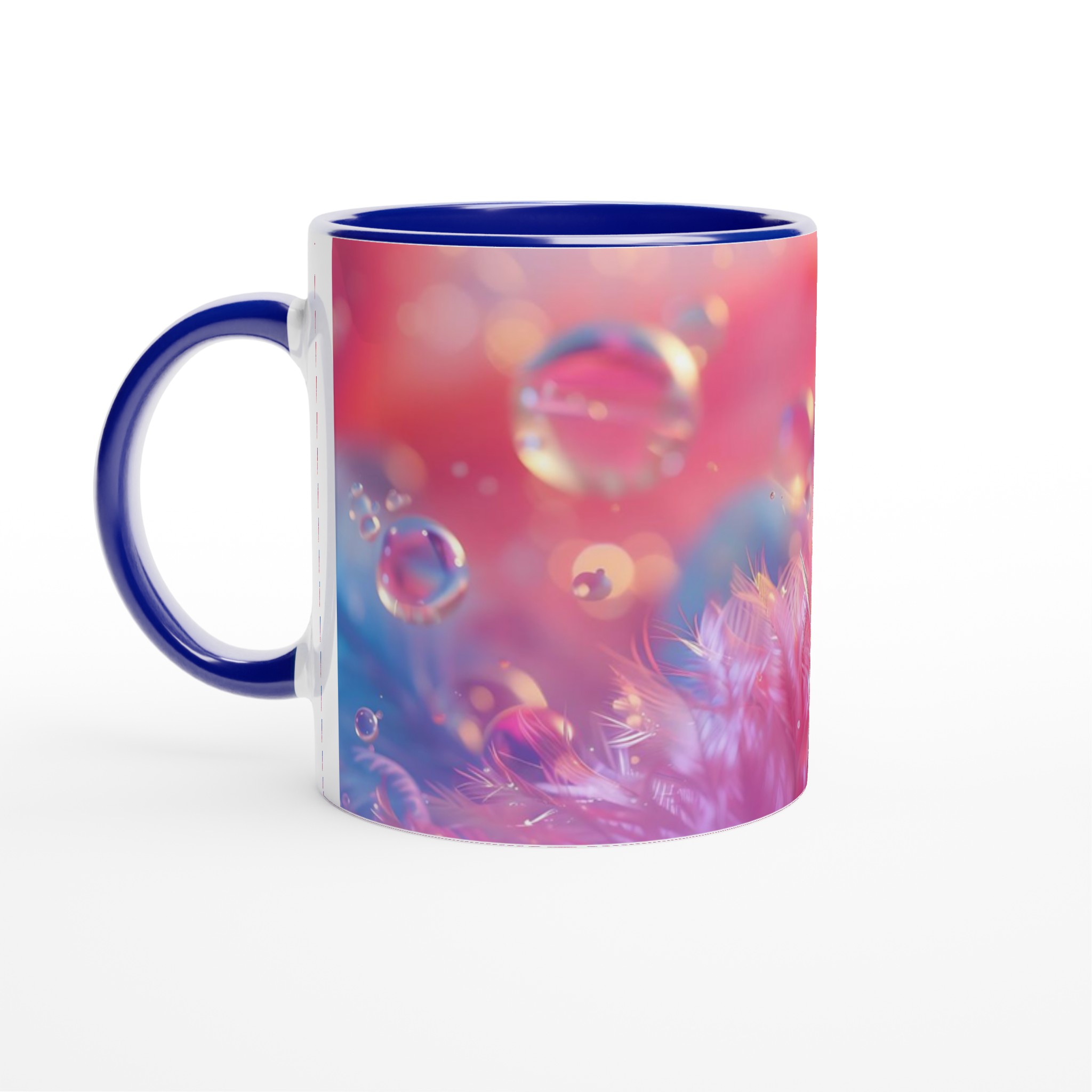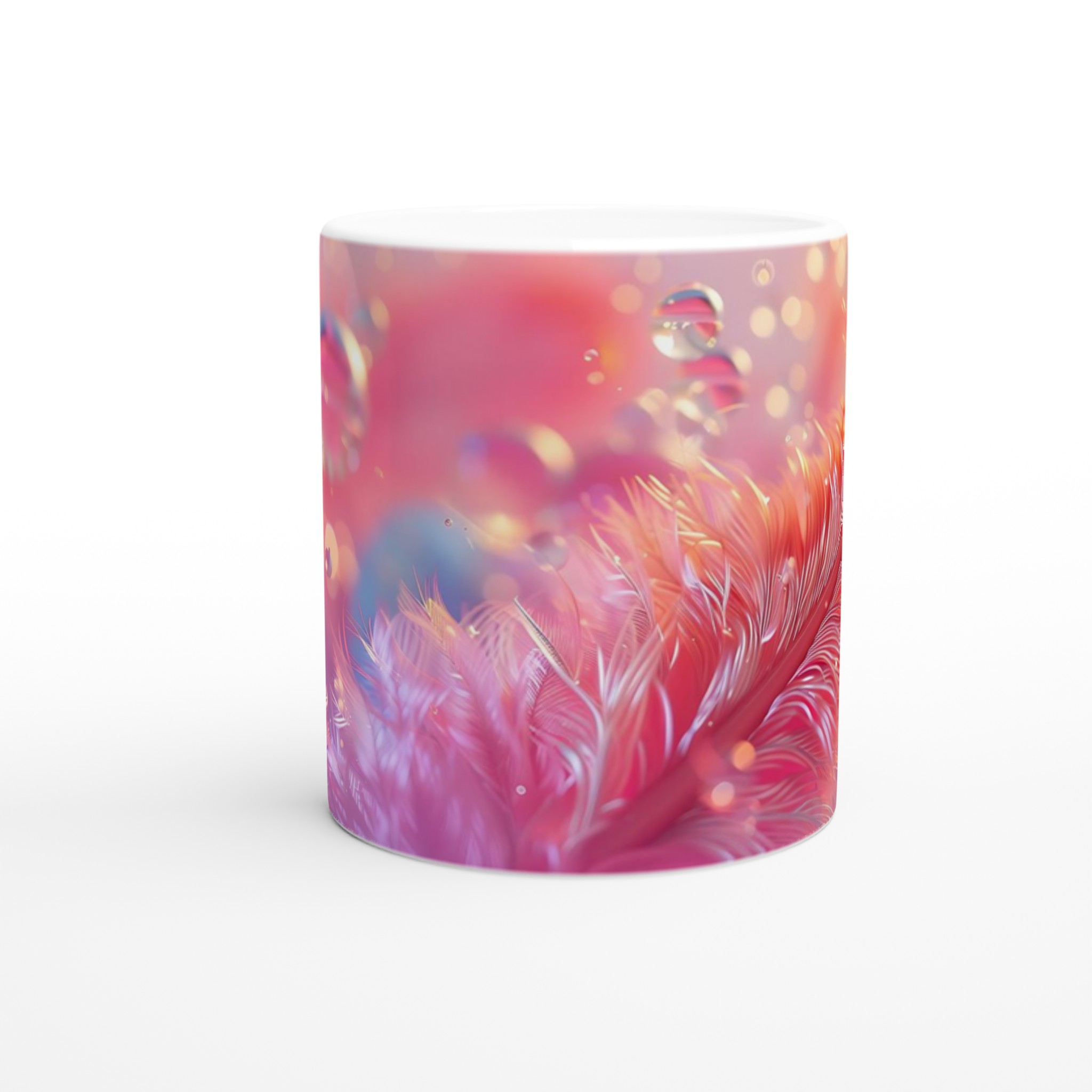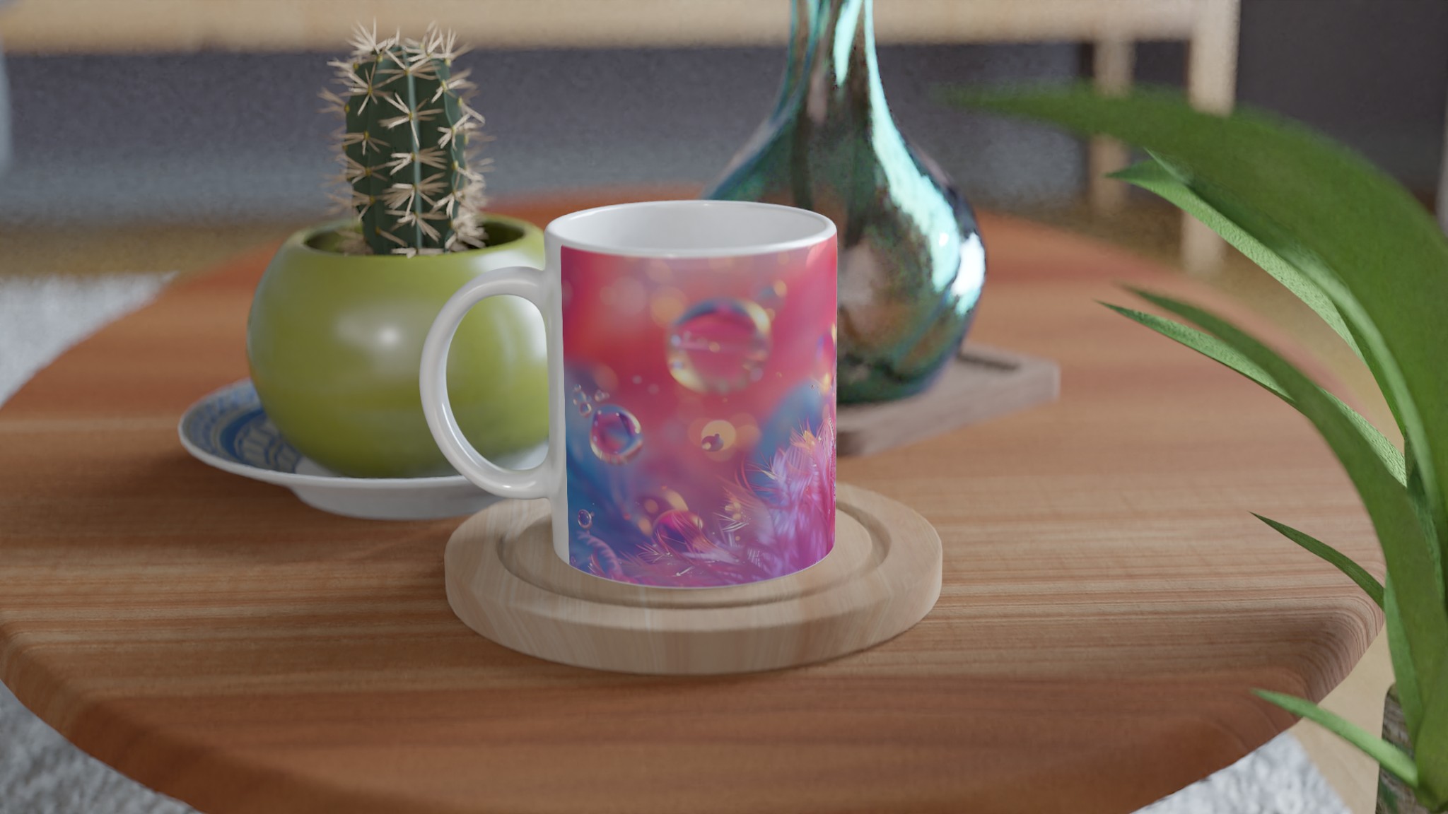 Lyft din fikastund till en konstupplevelse med denna färgsprakande keramiska mugg! Inspirerad av den drömska paletten av glödande fjädrar och skimrande bubblor, förvandlar denna mugg varje sipp till ett ögonblick av ren glädje. Perfekt för morgonkaffet, kvällens varma choklad eller när du bara vill njuta av en kopp te. Den blanka vita ytan gör att trycken framhävs med klara och levande färger, som håller sig fina även efter många turer i mikron och diskmaskinen.