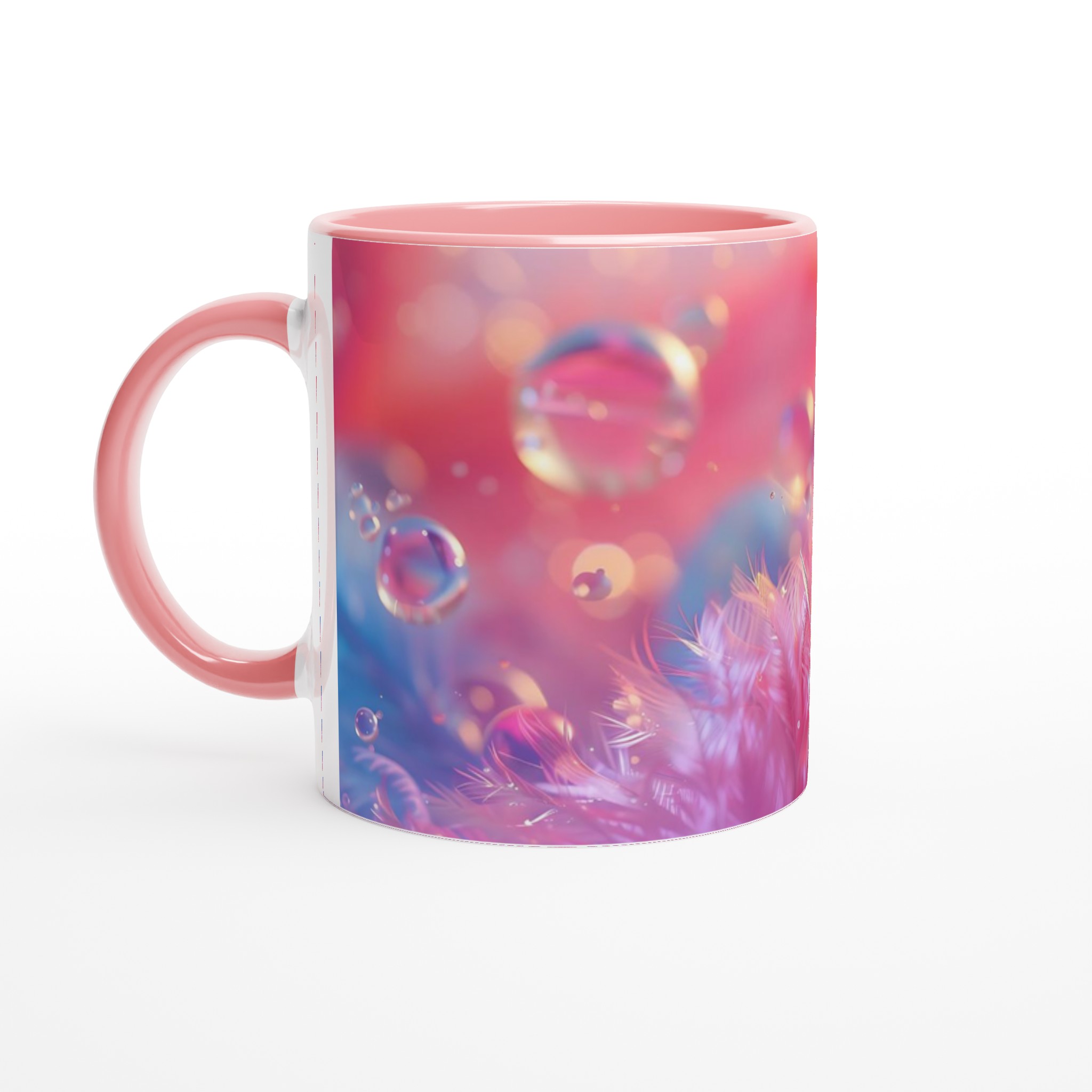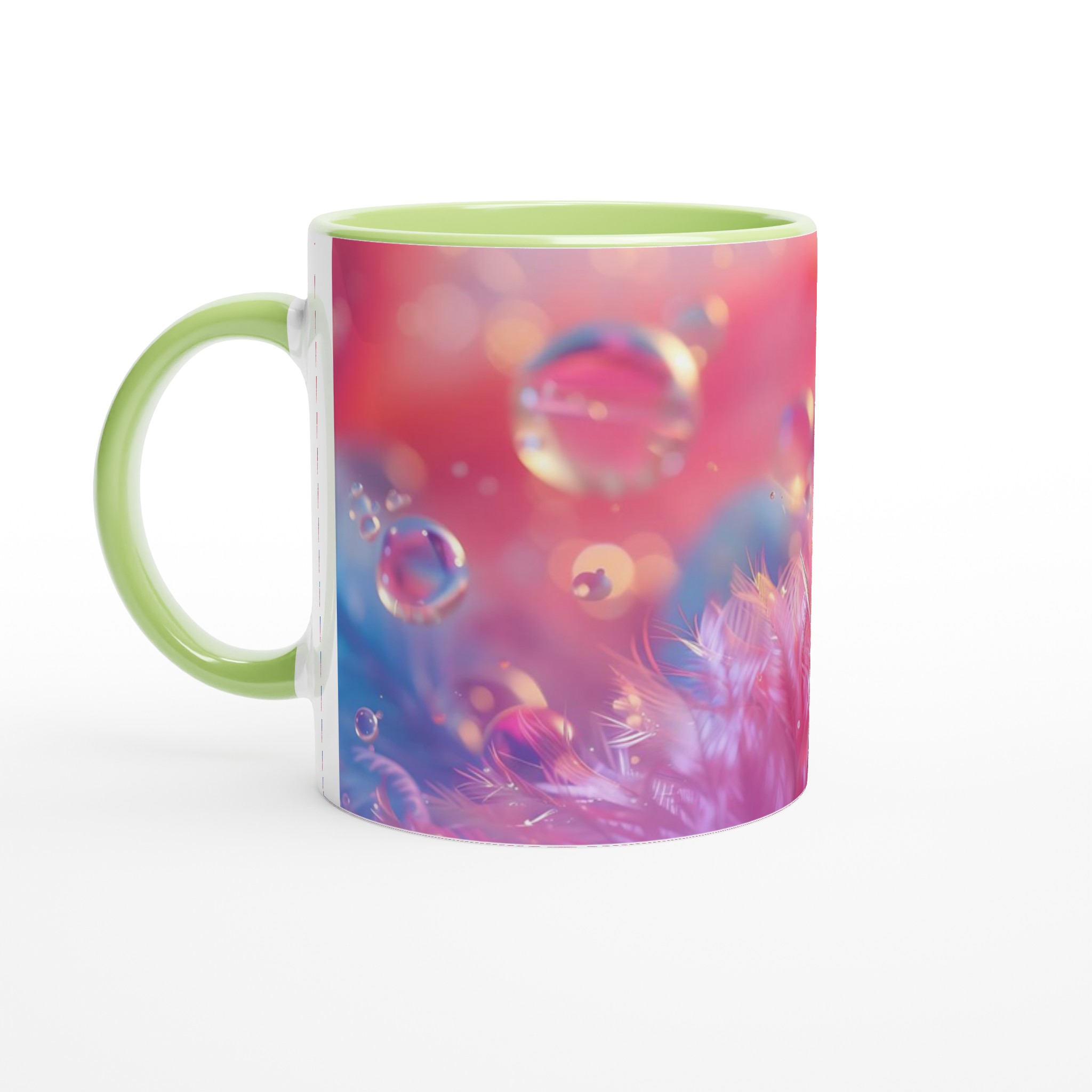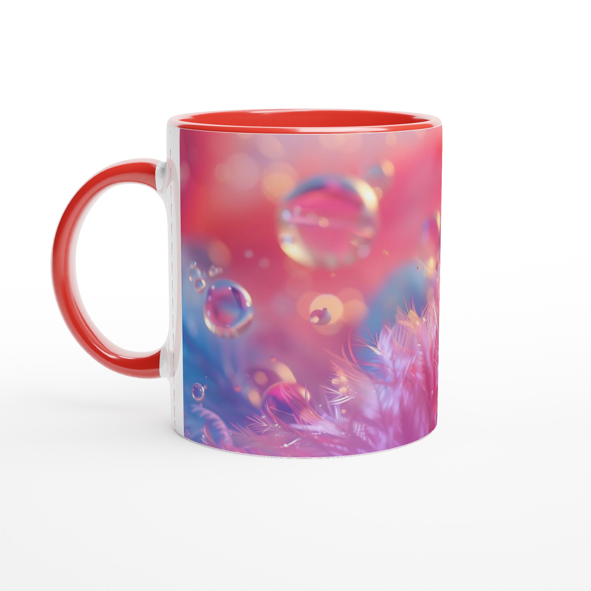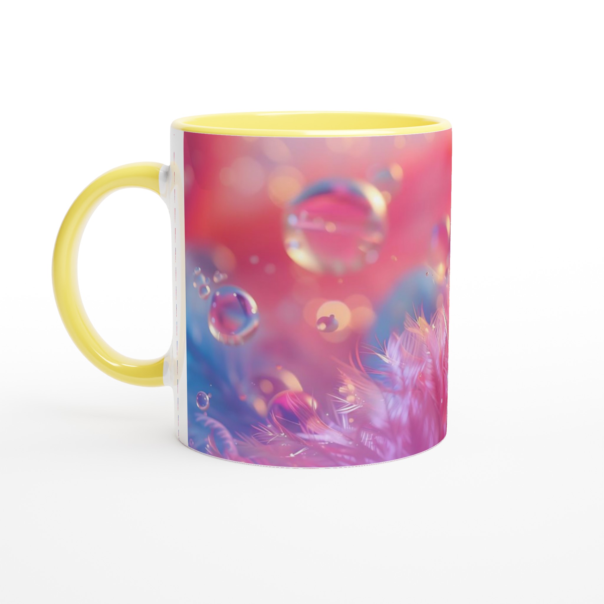 Lyft din fikastund till en konstupplevelse med denna färgsprakande keramiska mugg! Inspirerad av den drömska paletten av glödande fjädrar och skimrande bubblor, förvandlar denna mugg varje sipp till ett ögonblick av ren glädje. Perfekt för morgonkaffet, kvällens varma choklad eller när du bara vill njuta av en kopp te. Den blanka vita ytan gör att trycken framhävs med klara och levande färger, som håller sig fina även efter många turer i mikron och diskmaskinen.