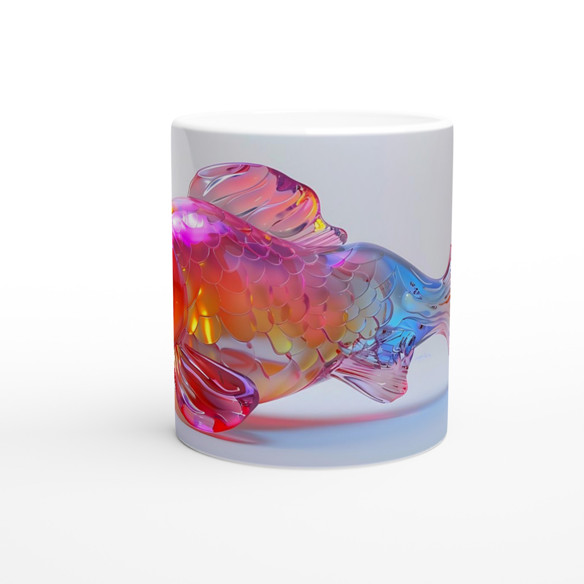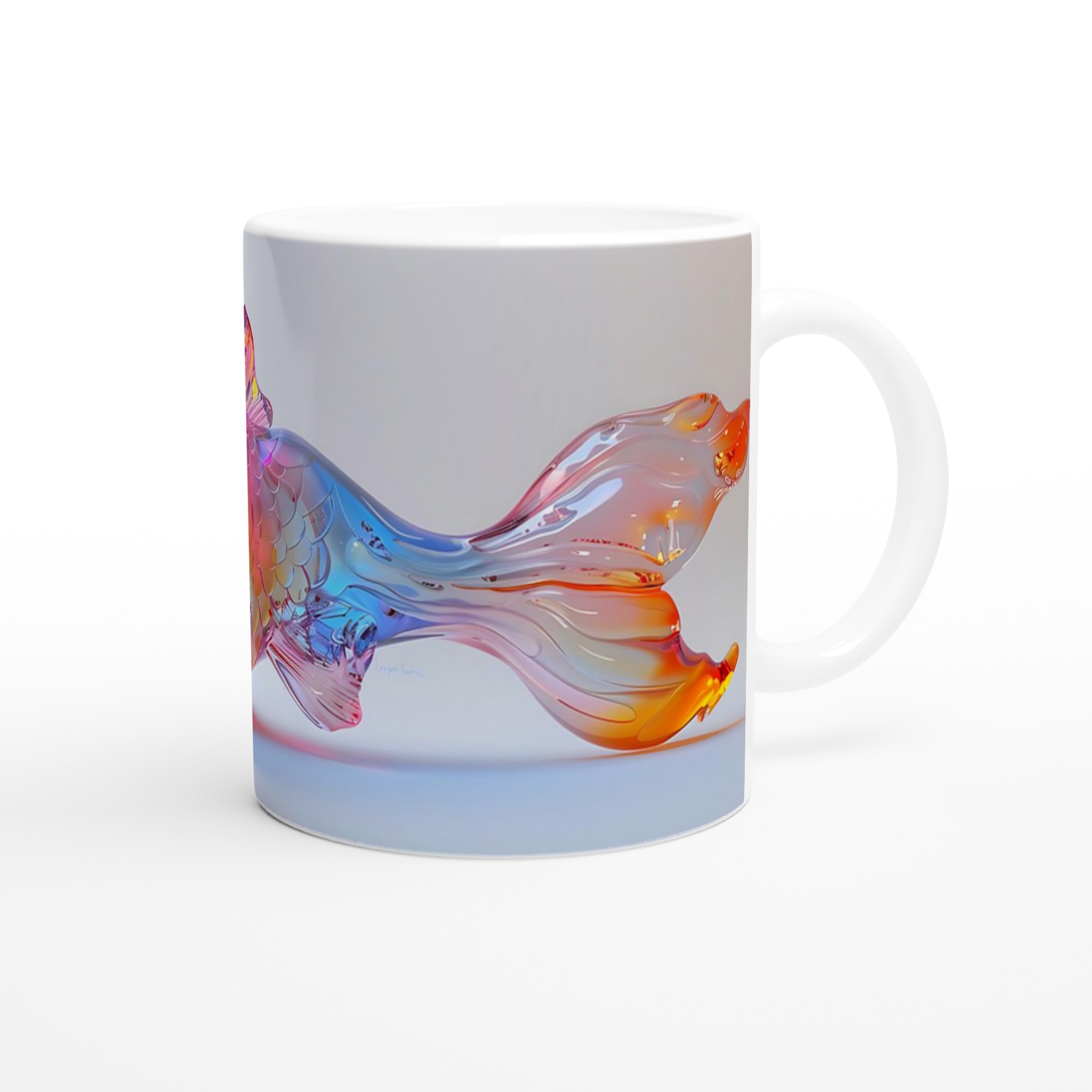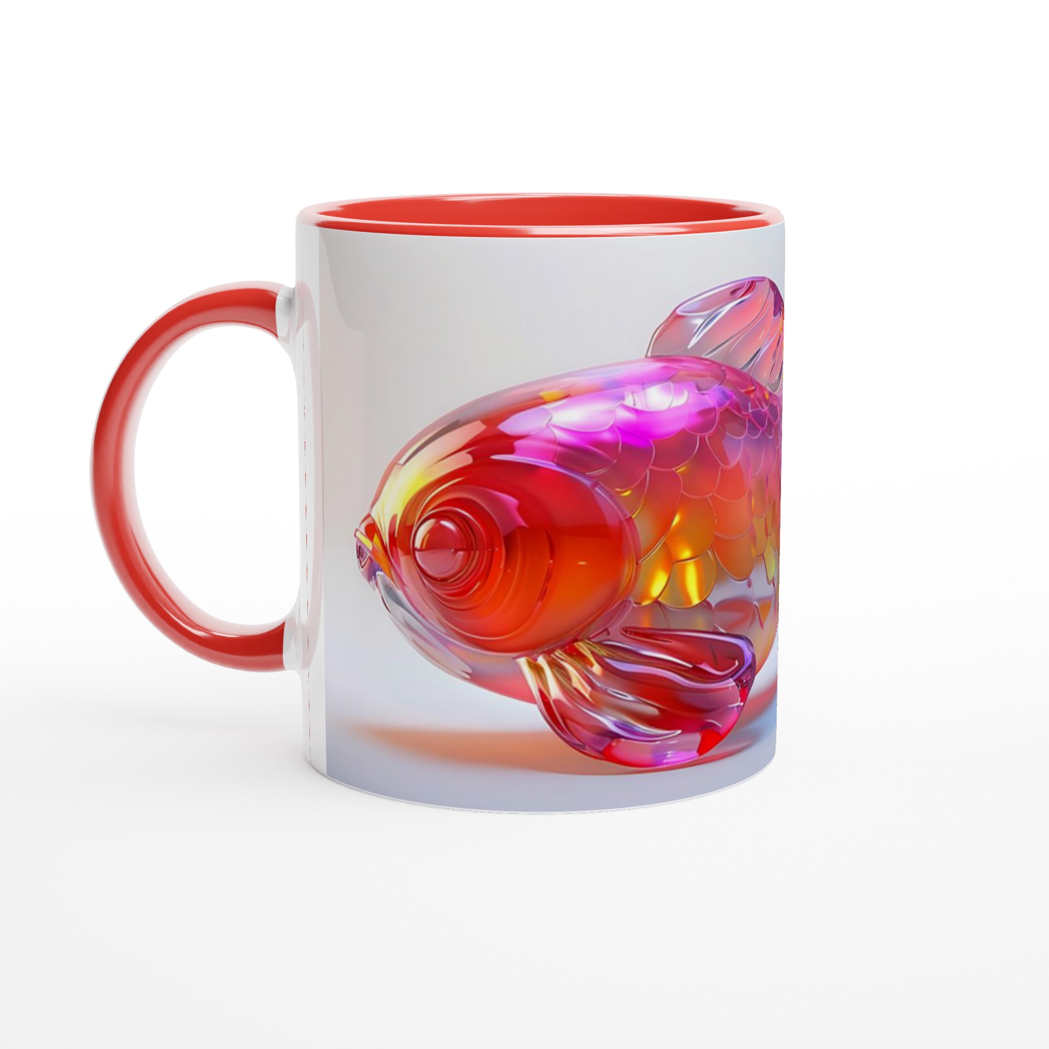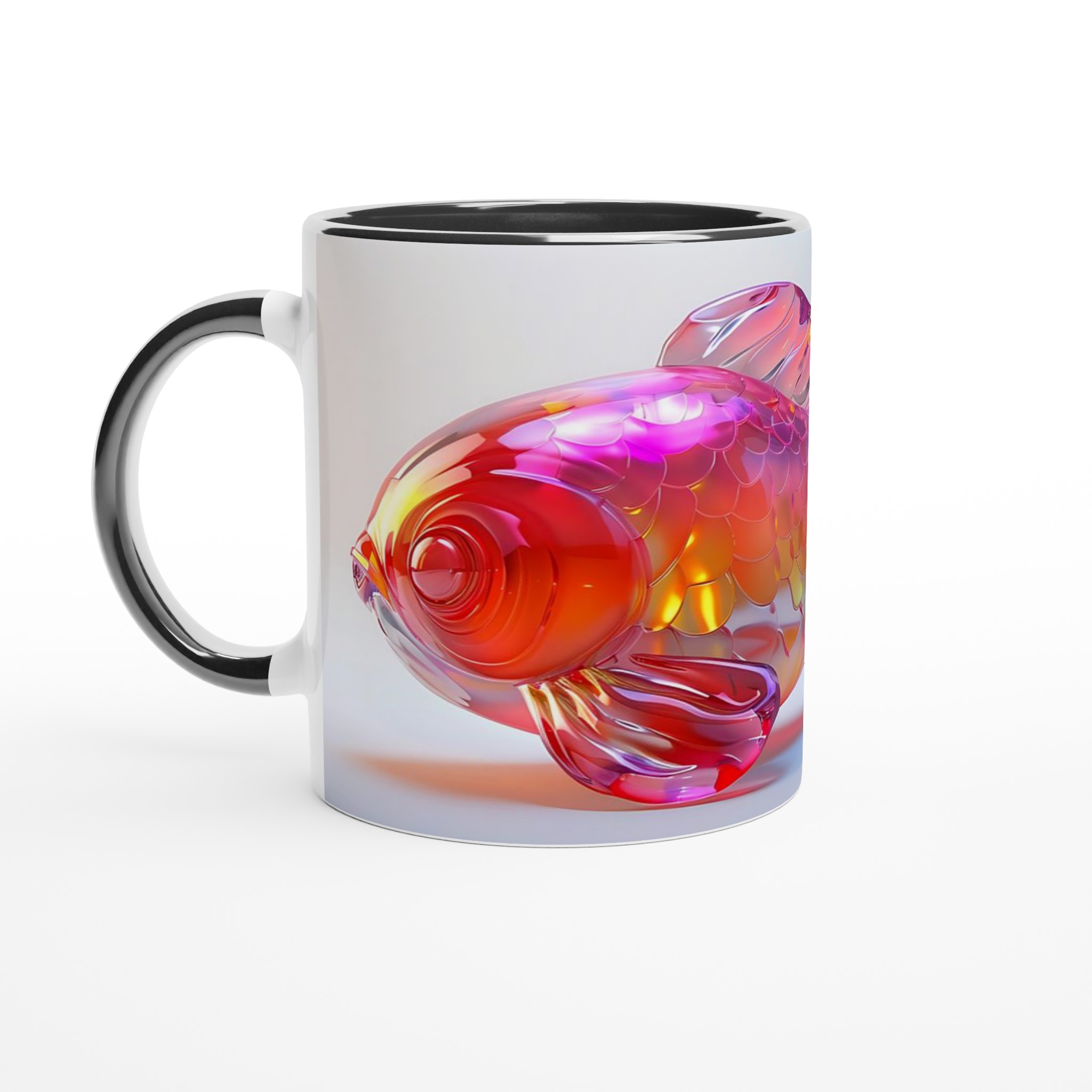 Låt varje fikastund bli en glädjefylld upplevelse med vår färgsprakande keramiska mugg. Inspirerad av bilden av en skimrande, opaliserande guldfisk, fångar denna mugg en känsla av lekfullhet och elegans. Dess livfulla färger, som dansar mellan rött, orange, gult och blått, är en hyllning till den unika skönheten i det marina livet och gör varje klunk till en konstnärlig njutning.