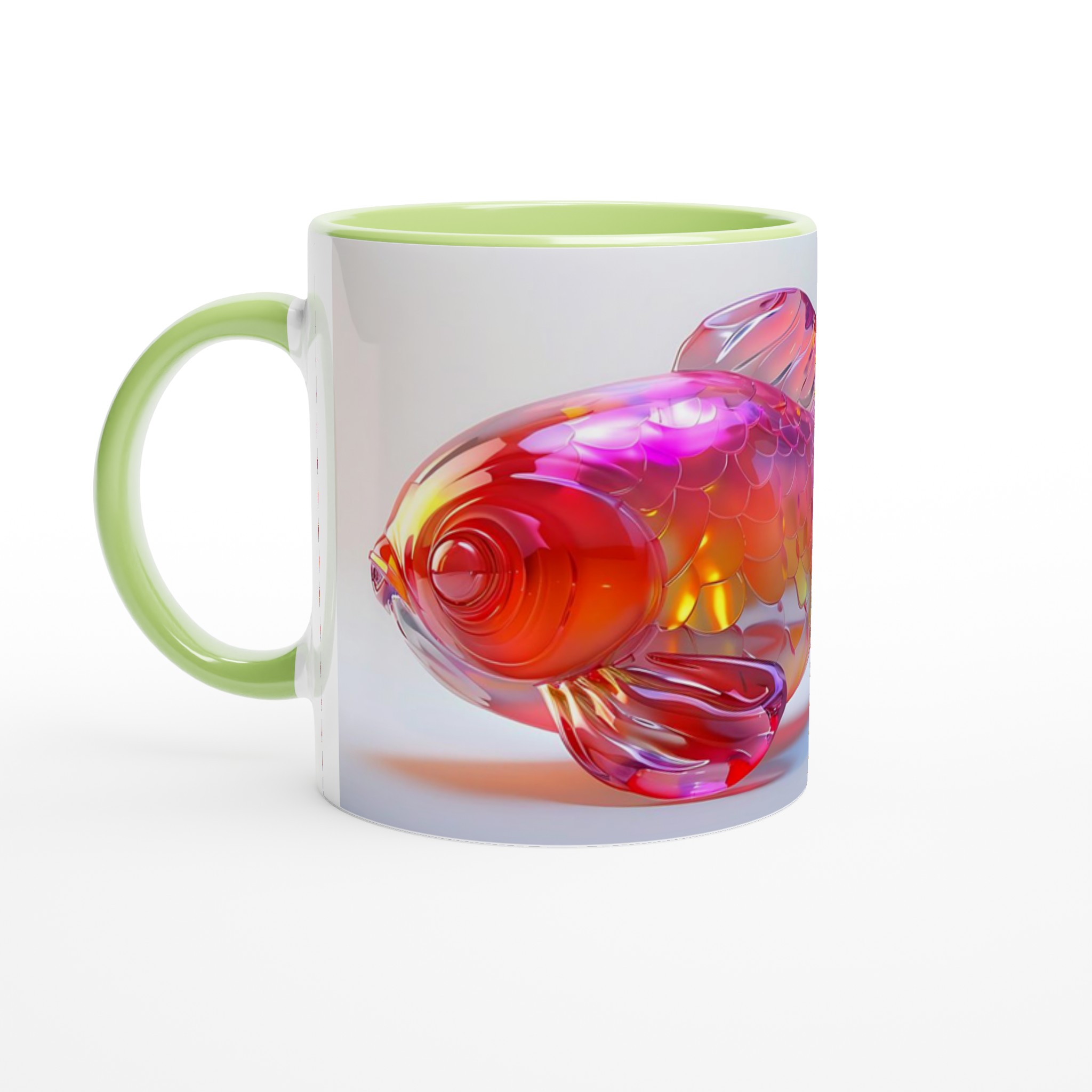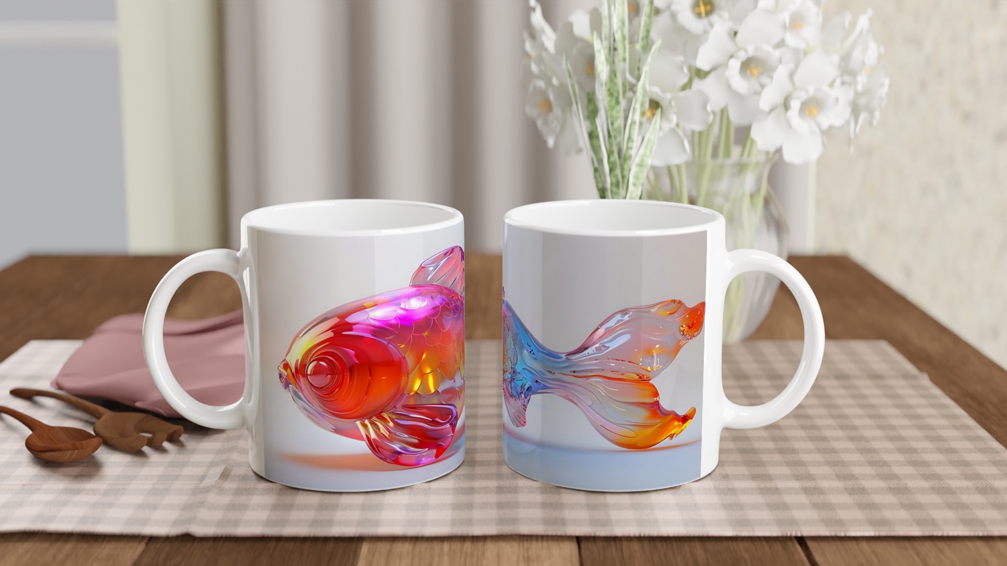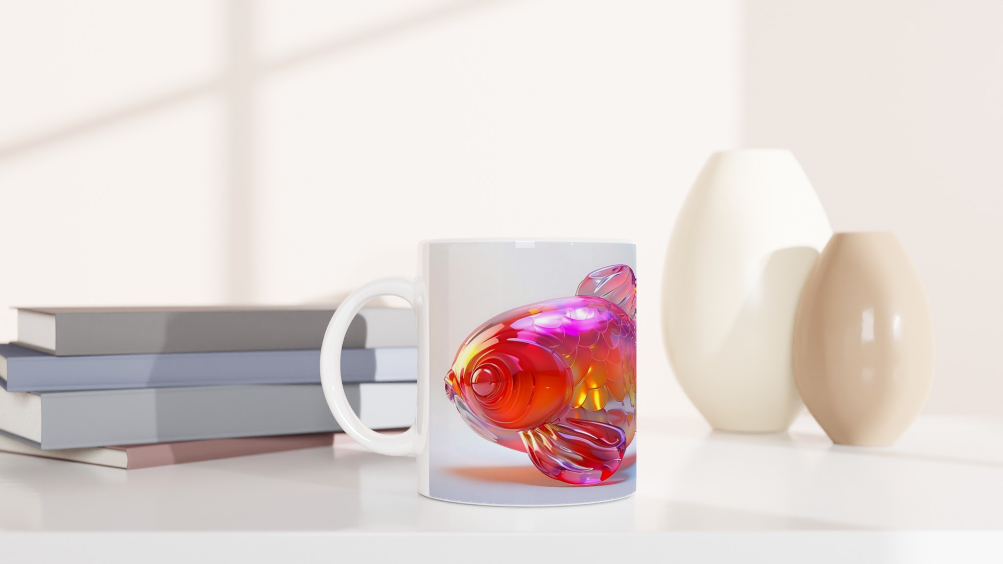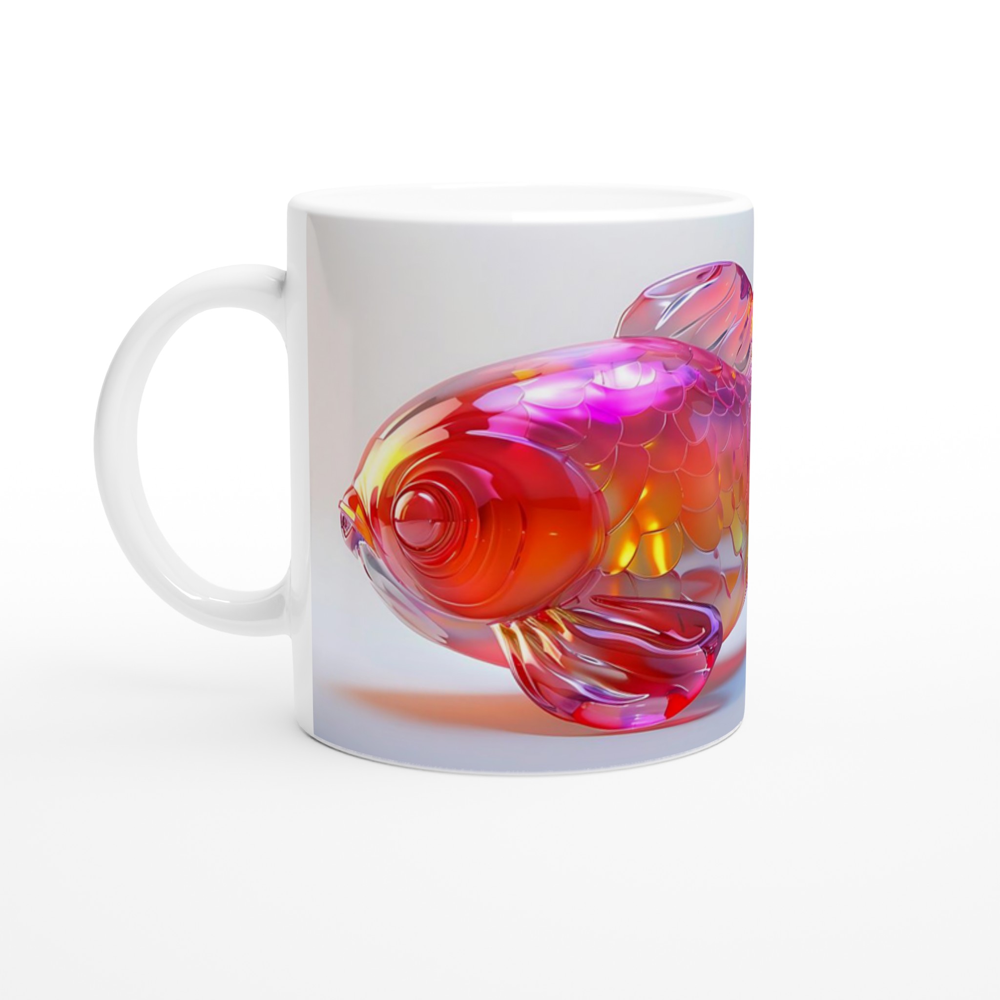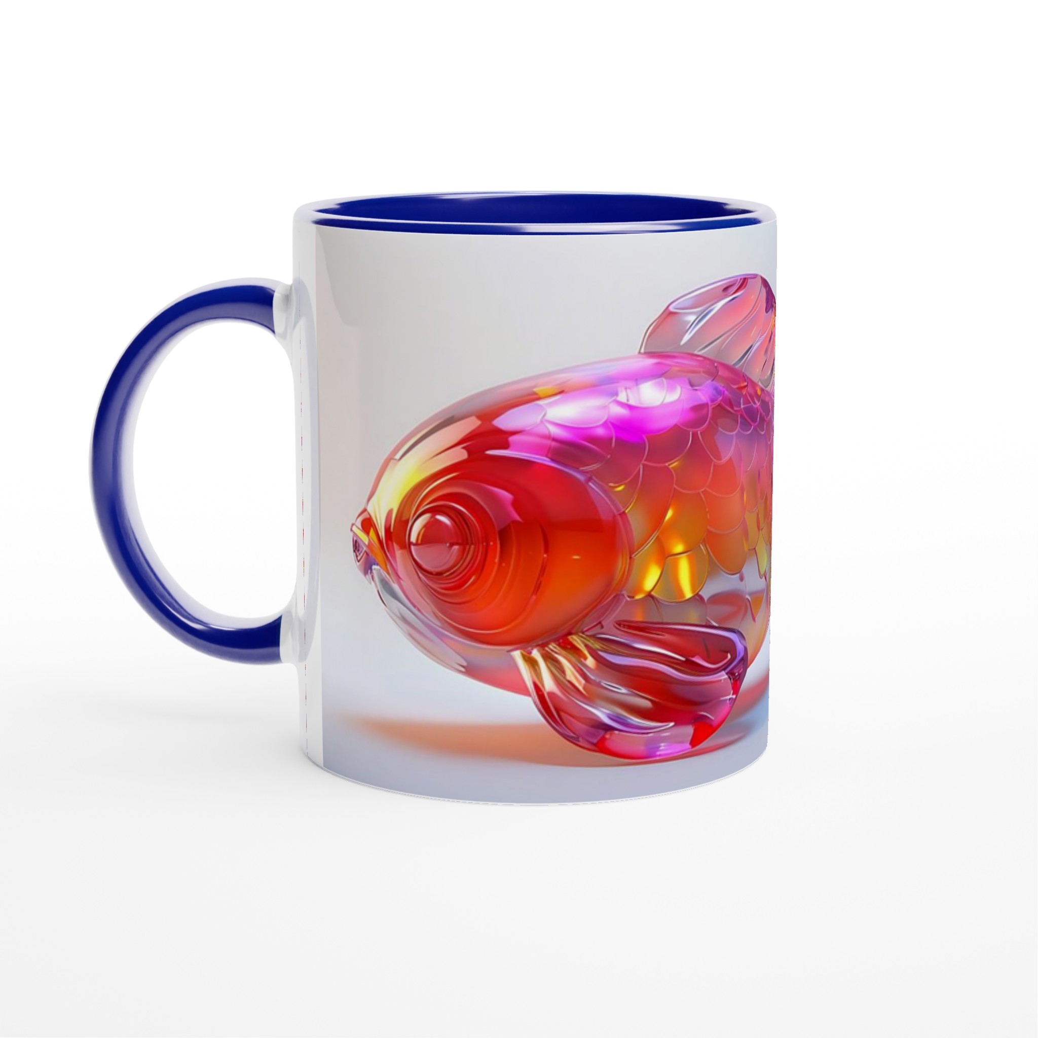 Låt varje fikastund bli en glädjefylld upplevelse med vår färgsprakande keramiska mugg. Inspirerad av bilden av en skimrande, opaliserande guldfisk, fångar denna mugg en känsla av lekfullhet och elegans. Dess livfulla färger, som dansar mellan rött, orange, gult och blått, är en hyllning till den unika skönheten i det marina livet och gör varje klunk till en konstnärlig njutning.