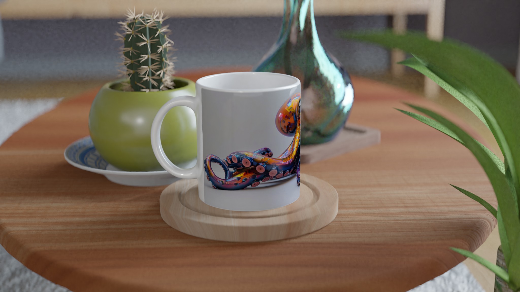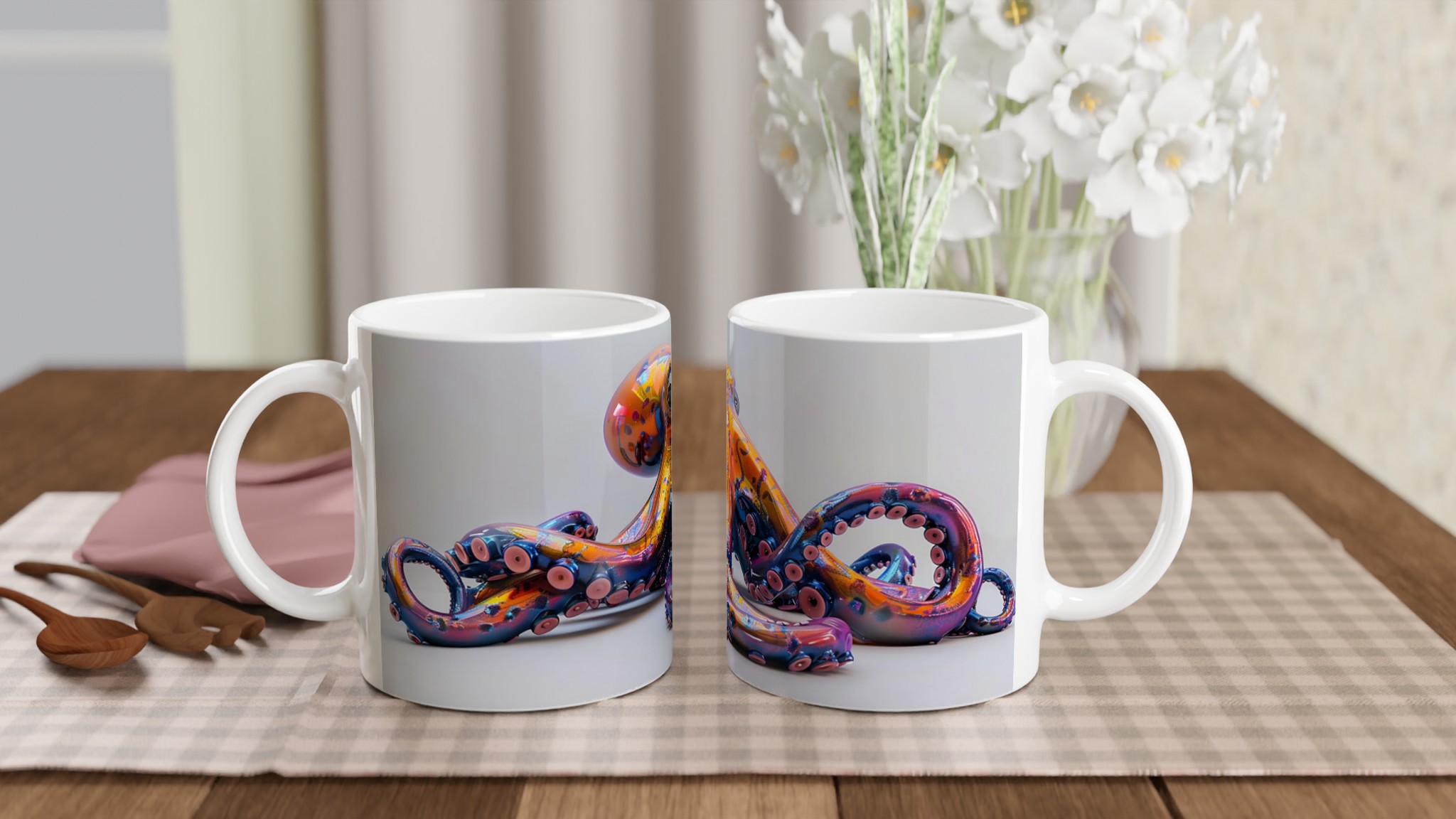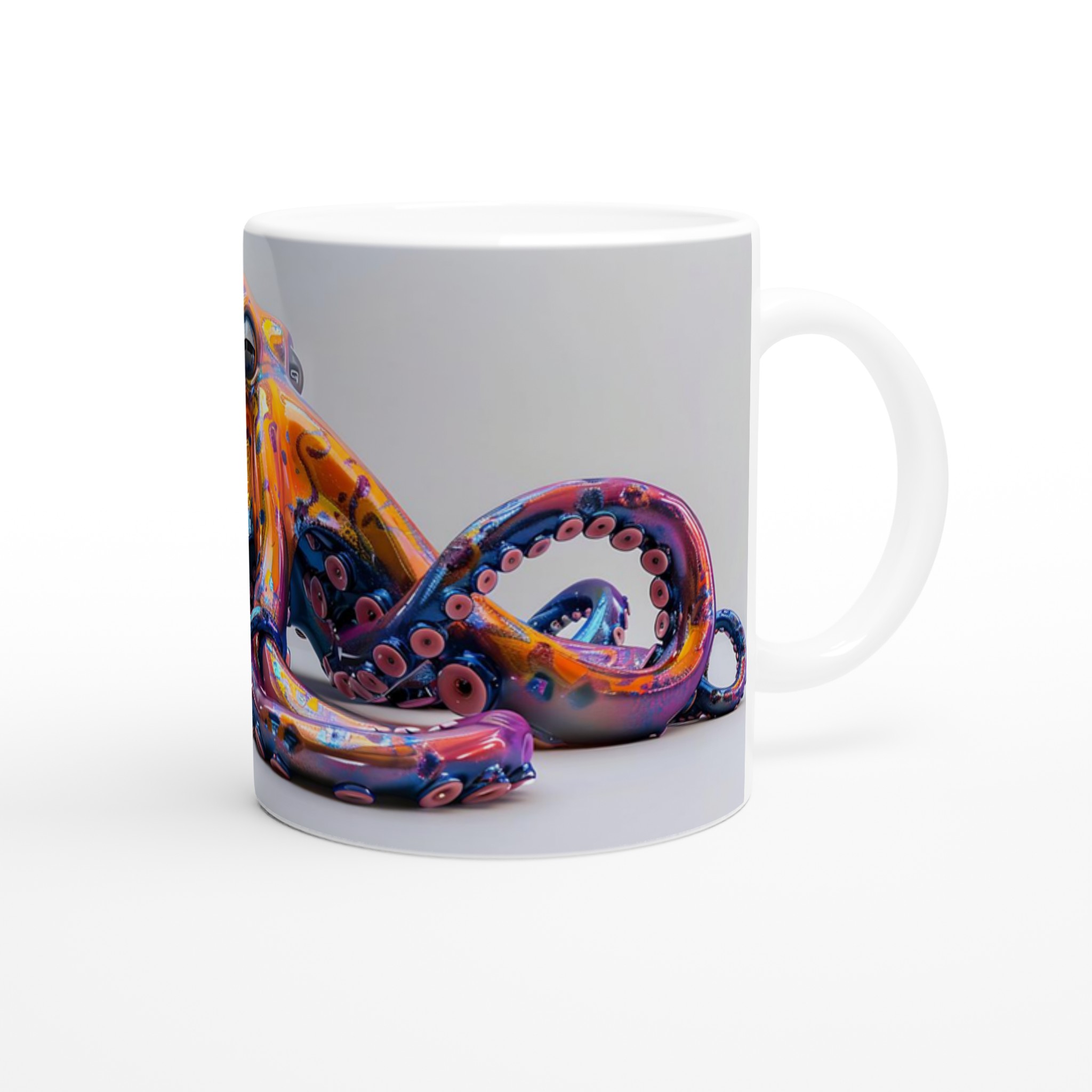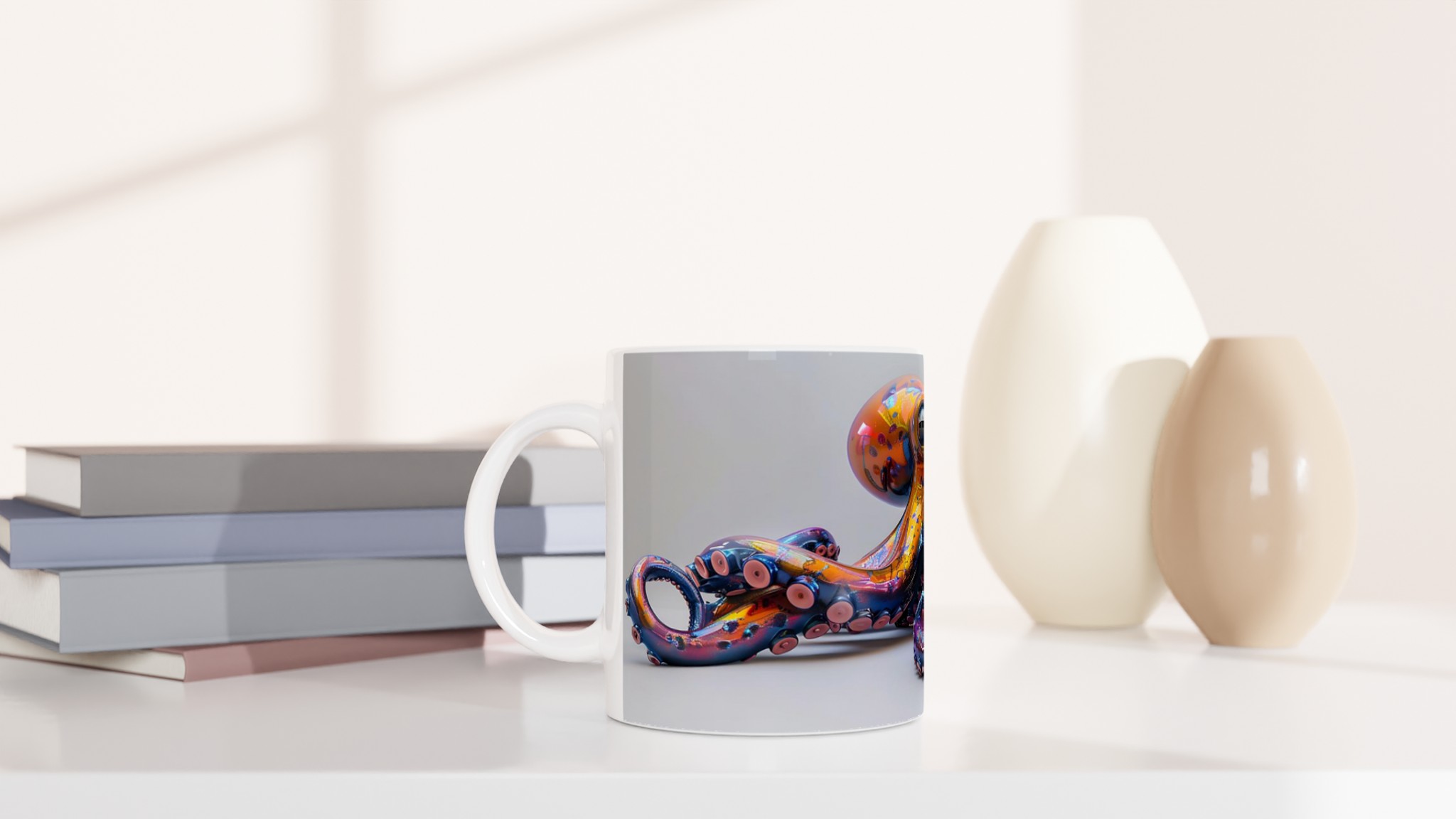 Låt fantasin flöda med denna fascinerande keramiska mugg, inspirerad av djuphavets mystik och glittrande liv. Dess unika, skimrande design med en blandning av blått, lila och orange ger en känsla av att hålla ett konstverk i handen. Perfekt för morgonkaffet, kvällens varma choklad eller när du bara vill njuta av en kopp te och drömma dig bort till undervattensvärlden. Den blanka ytan får de djärva färgerna att framhävas med en otrolig lyster, som håller sig fin även efter många turer i mikron och diskmaskinen.