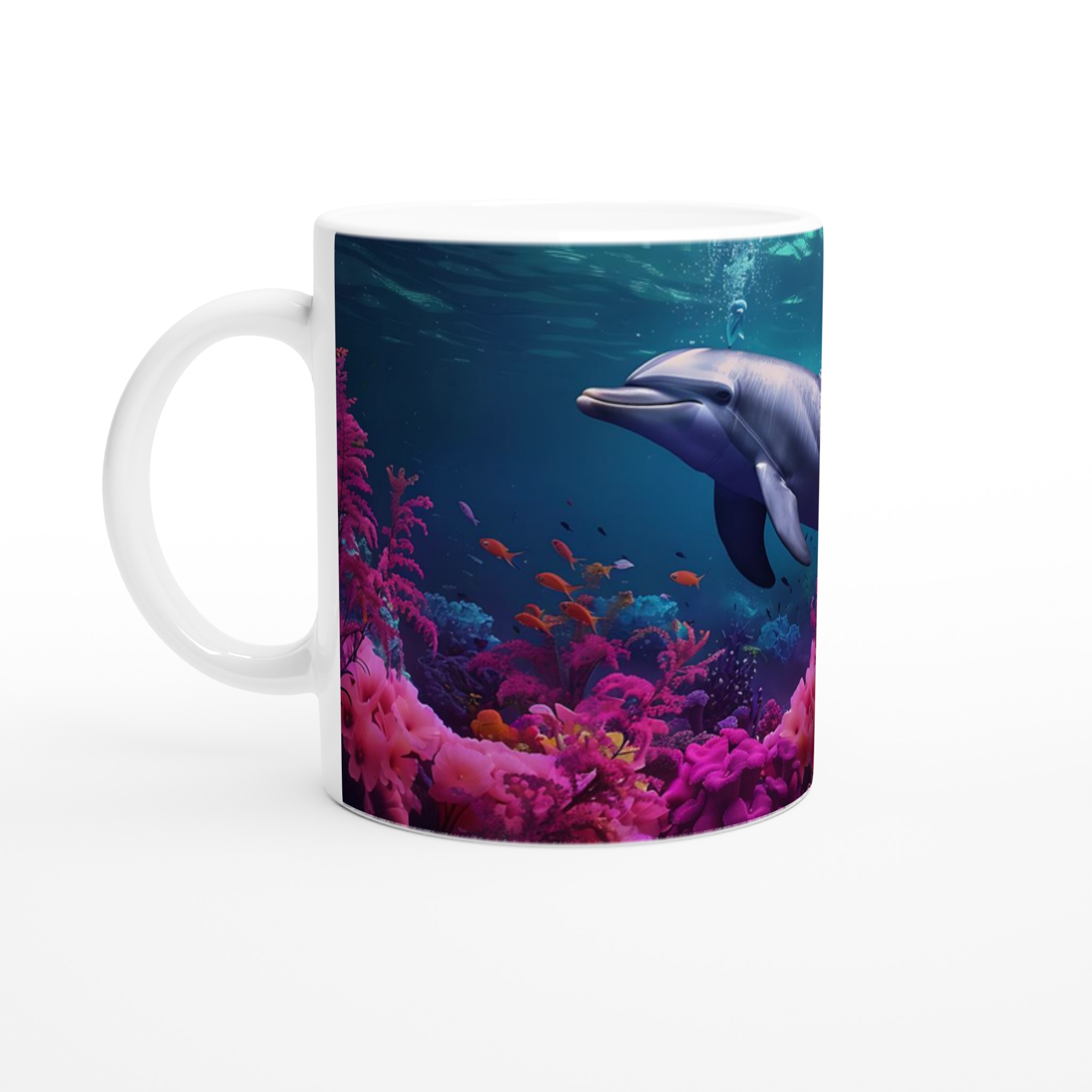 Inspirerad av havets magi, visar denna mugg en majestätisk delfin som simmar bland ett överflöd av livfulla koraller i rosa, lila och gult. Den blanka vita ytan ger ett skarpt och levande tryck som verkligen sticker ut, oavsett om det är en personlig design, ett roligt citat eller en present till någon du tycker om.