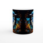 Väck dina sinnen varje morgon med denna fantastiska keramikmugg, prydd med ett levande konstverk av färgglada korpar mot en explosiv bakgrund av akvarellstänk. Denna mugg är inte bara en behållare för din favoritdryck, utan en konstnärlig upplevelse som förvandlar varje sipp till en stund av glädje och inspiration. De djärva, neonaktiga färgerna och den abstrakta stilen skapar en dynamisk känsla som lyser upp vilken fika som helst, perfekt för dig som älskar unika och uttrycksfulla detaljer i vardagen.